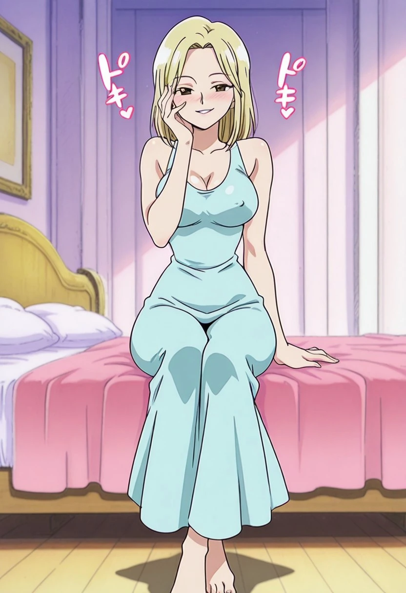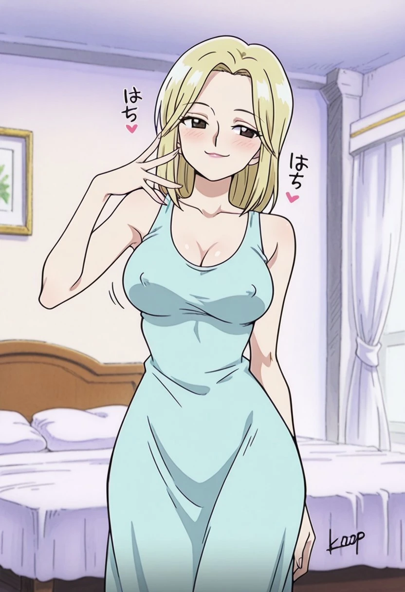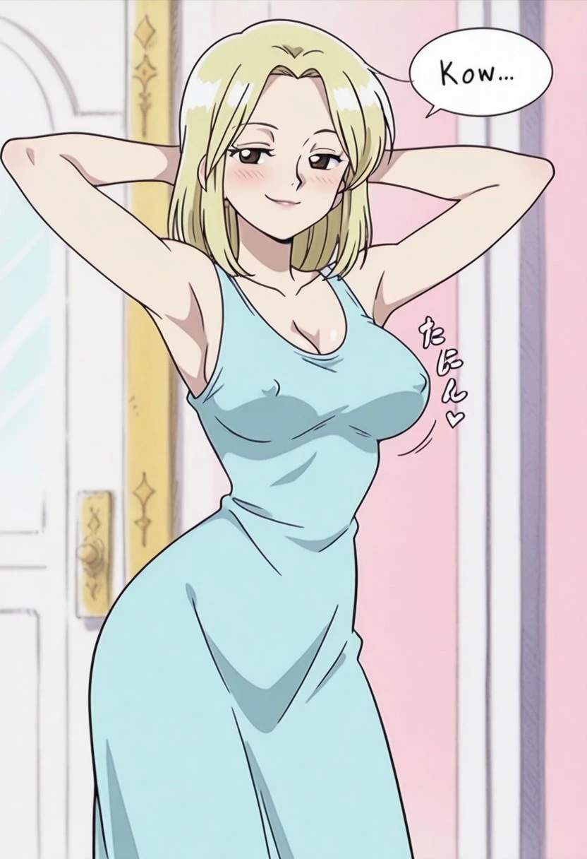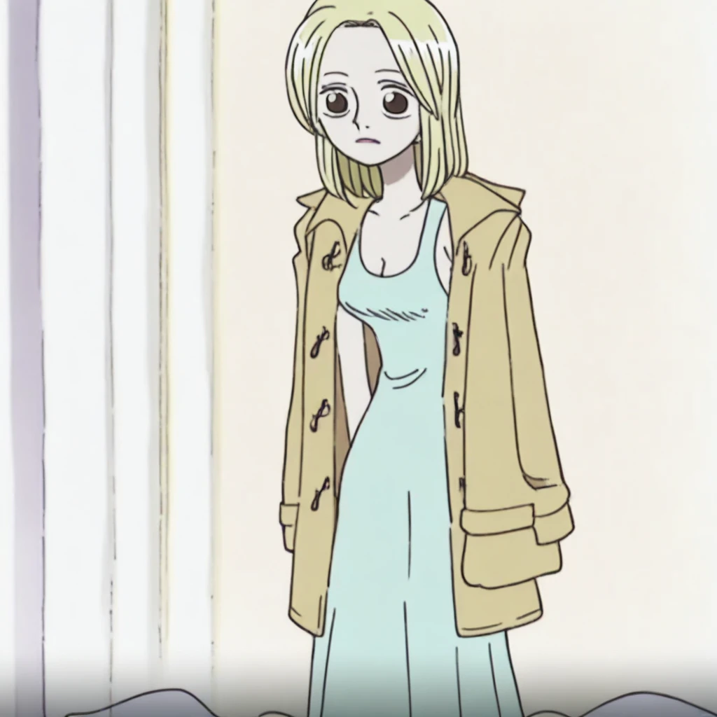 KayaOP, 1girl, solo, pale skin, blonde hair, slim girl, hair to the shoulders, brown eyes, lips, long dress, cleavage, large breast, bare shoulders, house slippers, parted bangs, sleeveless, collarbone, coat,