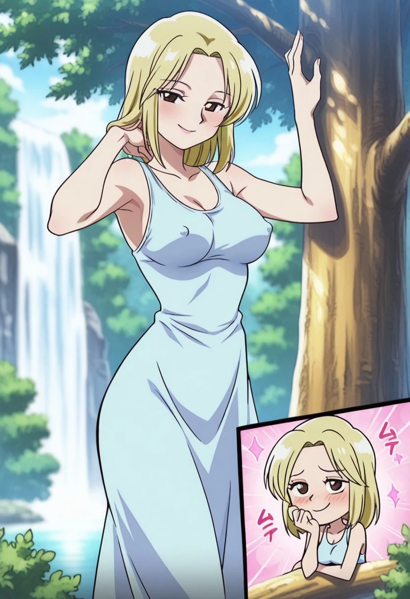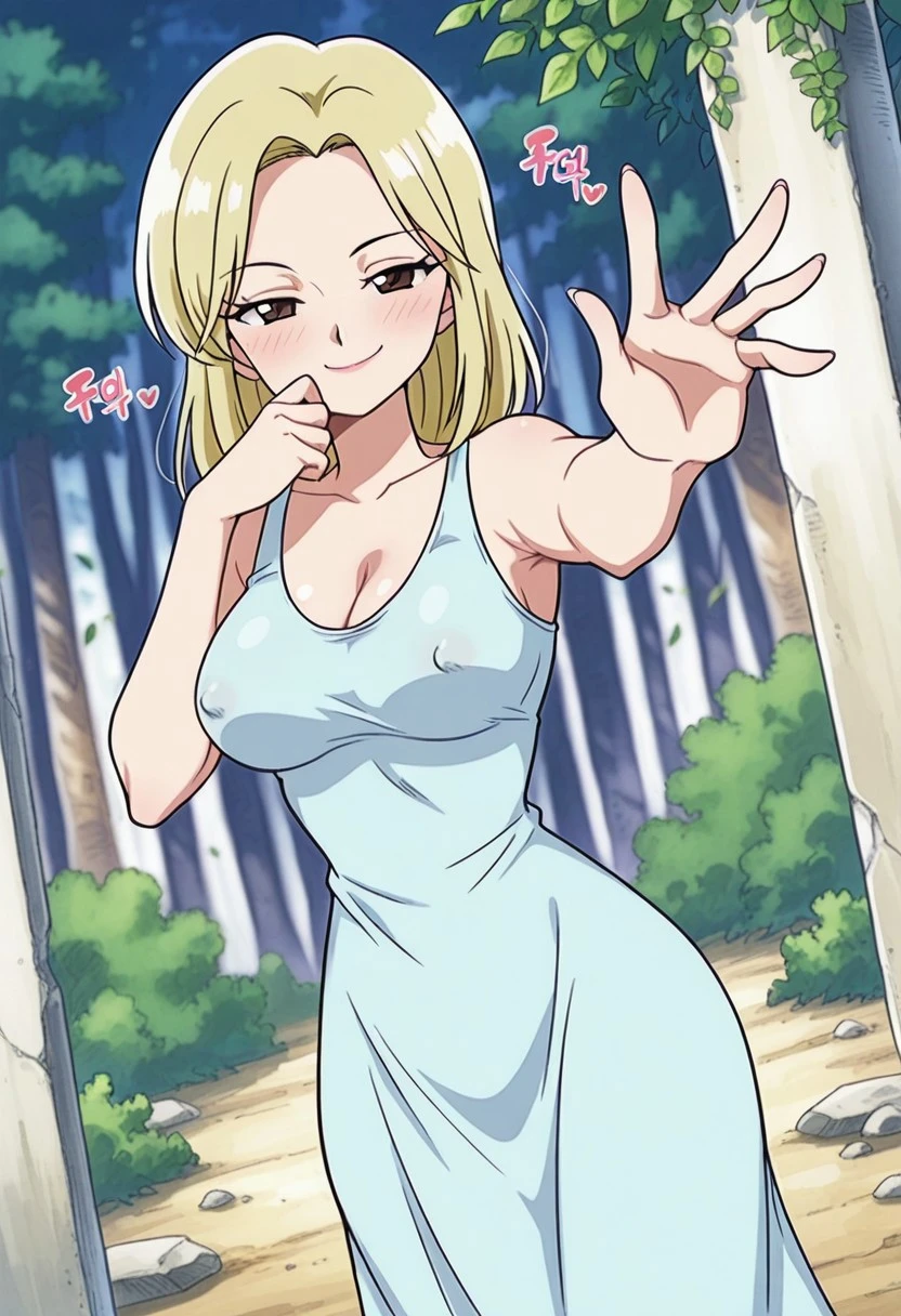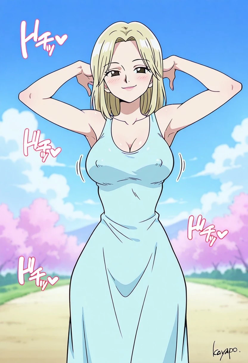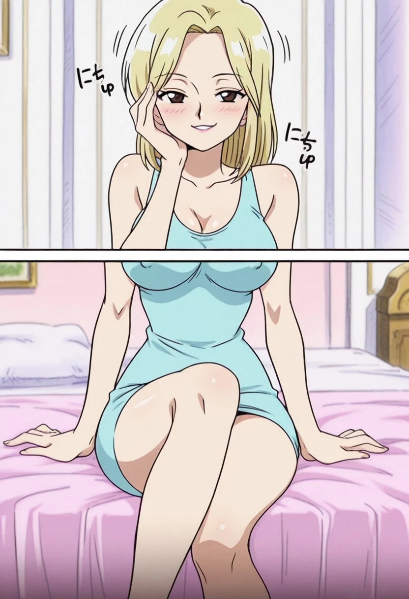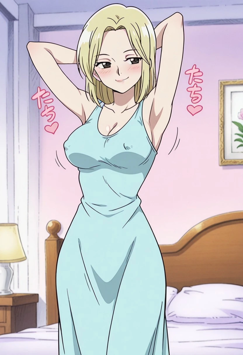 KayaOP, 1girl, solo, pale skin, blonde hair, slim girl, hair to the shoulders, brown eyes, lips, long dress, cleavage, large breast, bare shoulders, house slippers, parted bangs, sleeveless, collarbone, coat,