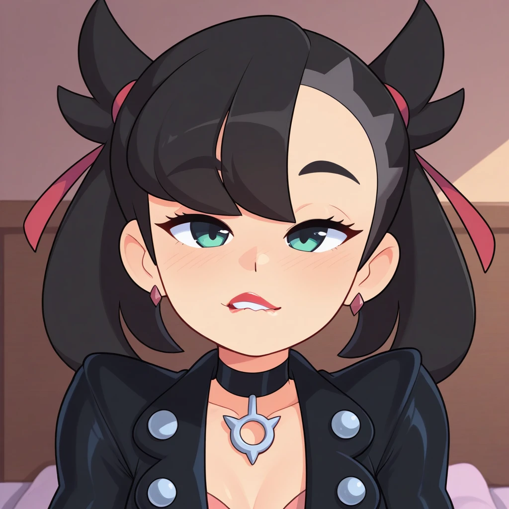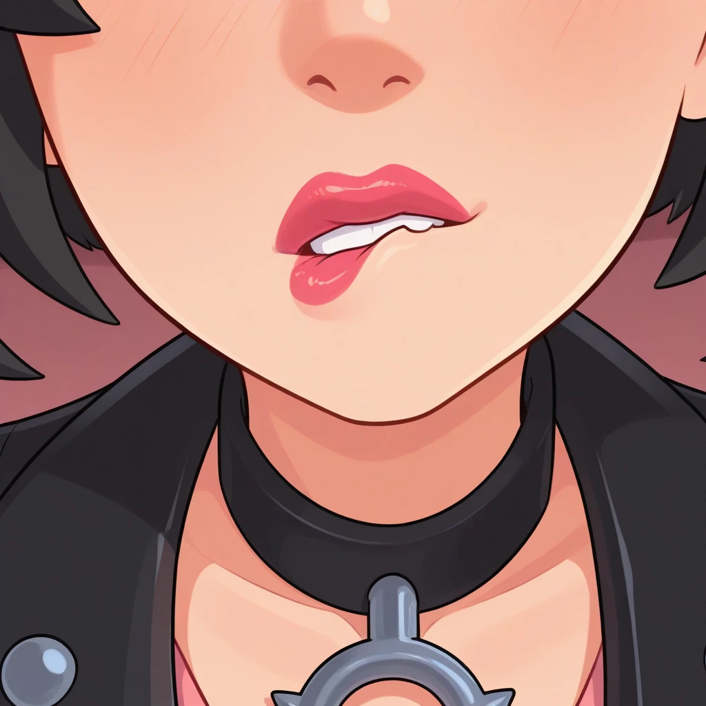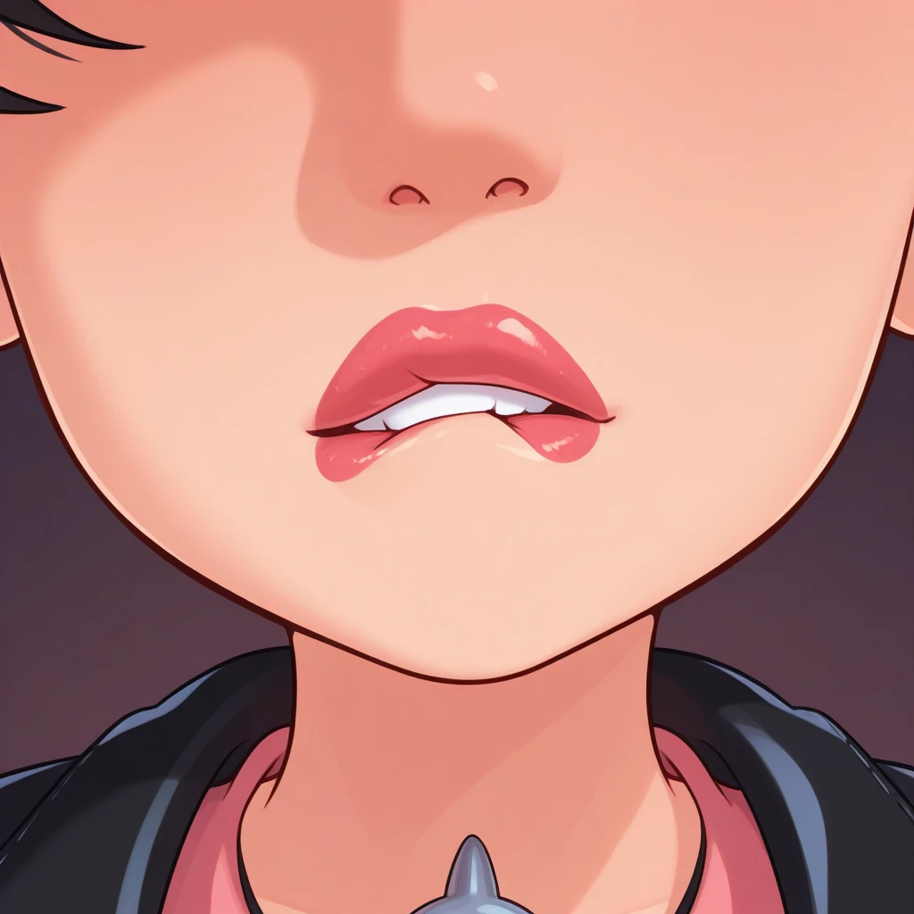 ((uneven lower lip, asymmetrical lower lip, partial lower lip, teeth biting half of own lower lip):1.2),