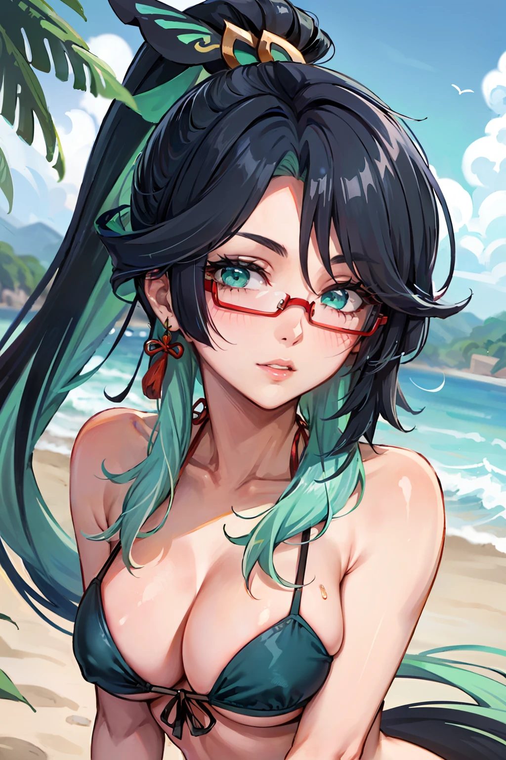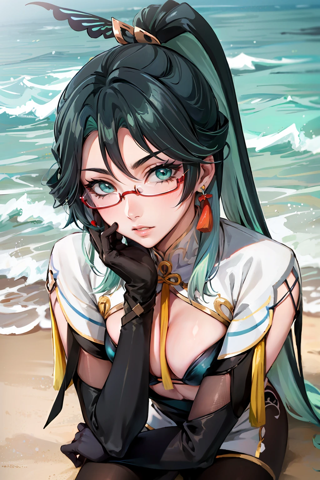 Other useful positive tags: long hair, ponytail, multicolored hair, black hair, bangs, glasses, semi-rimless eyewear, earrings, green hair, hair ornament, jewelry, red-framed eyewear, chinese clothes, gloves, green eyes