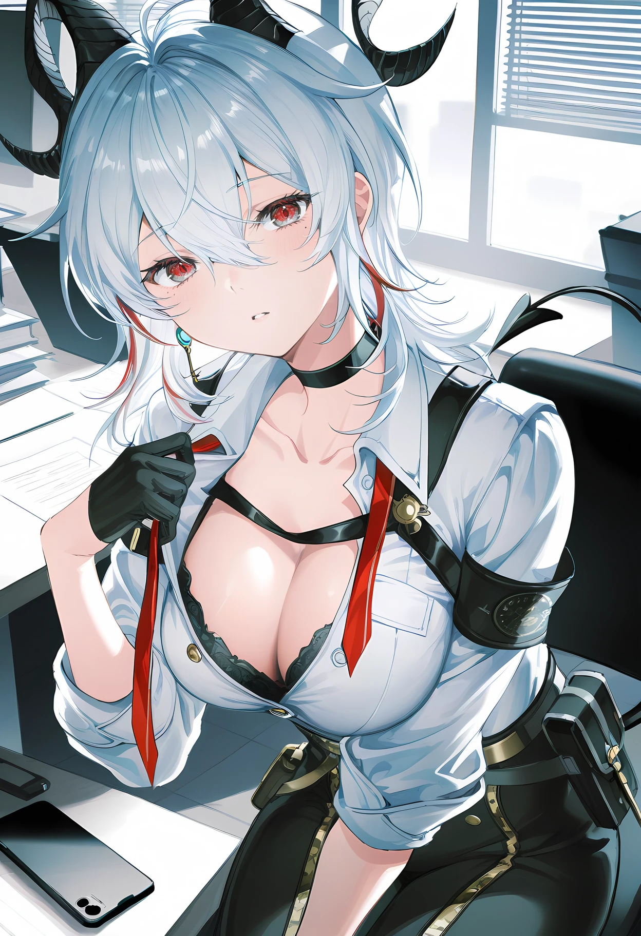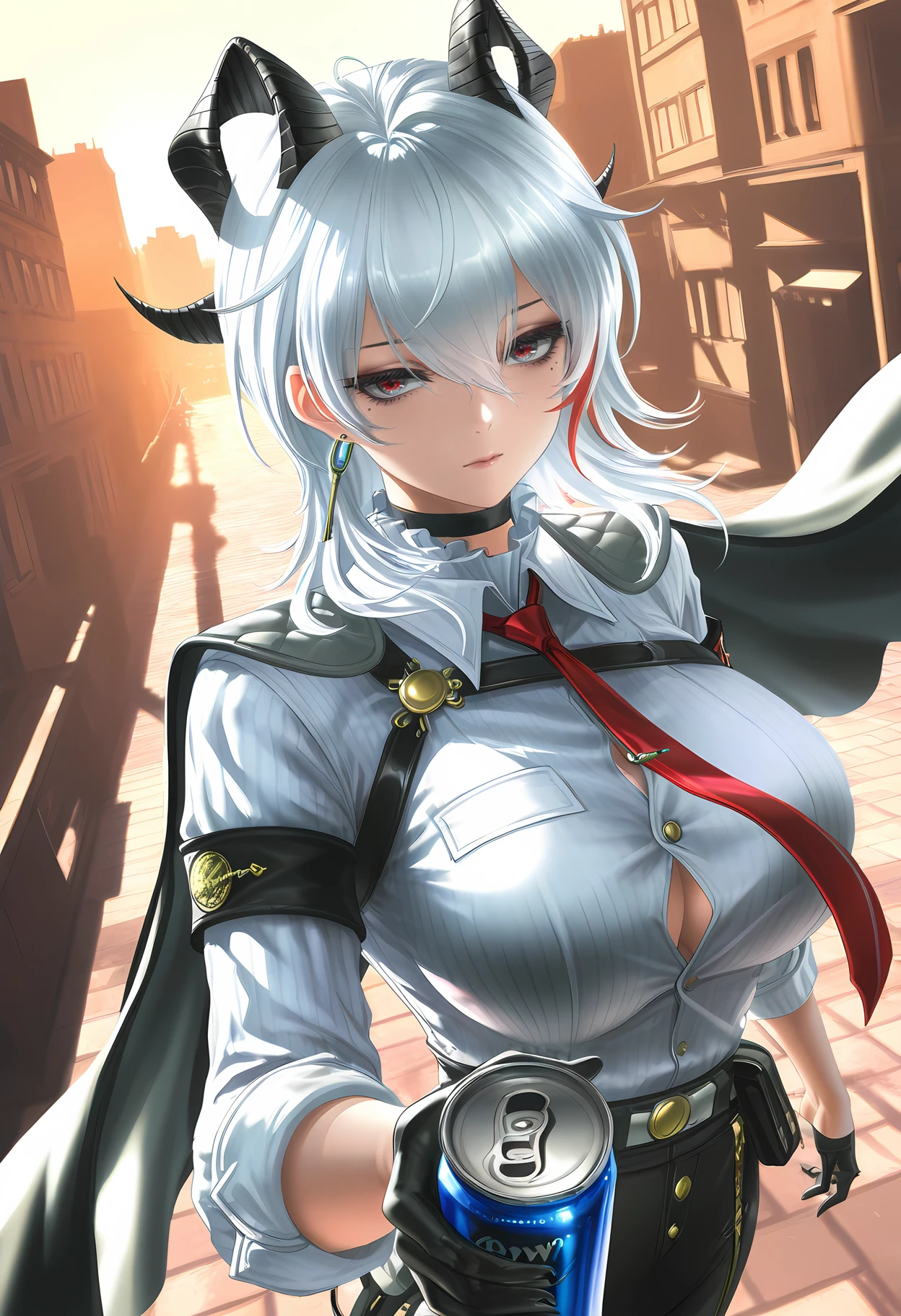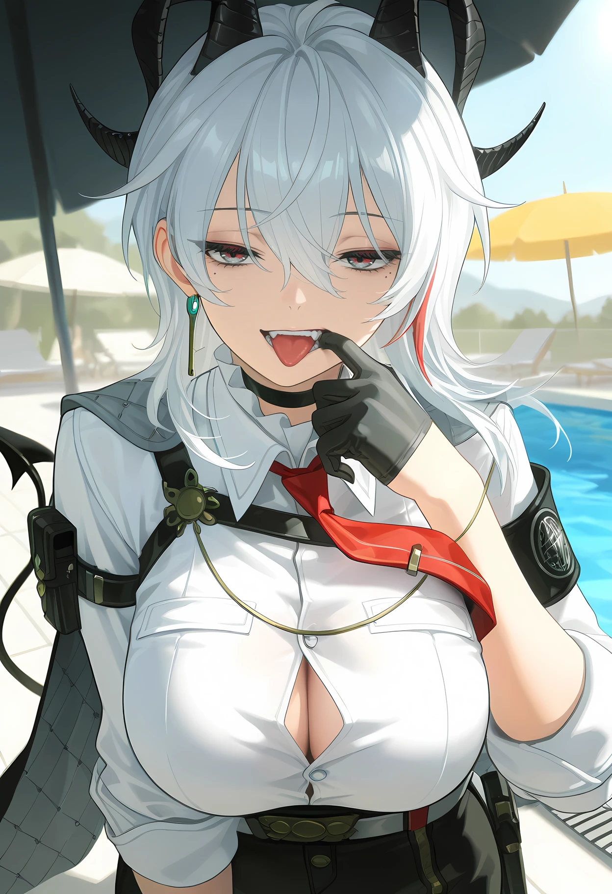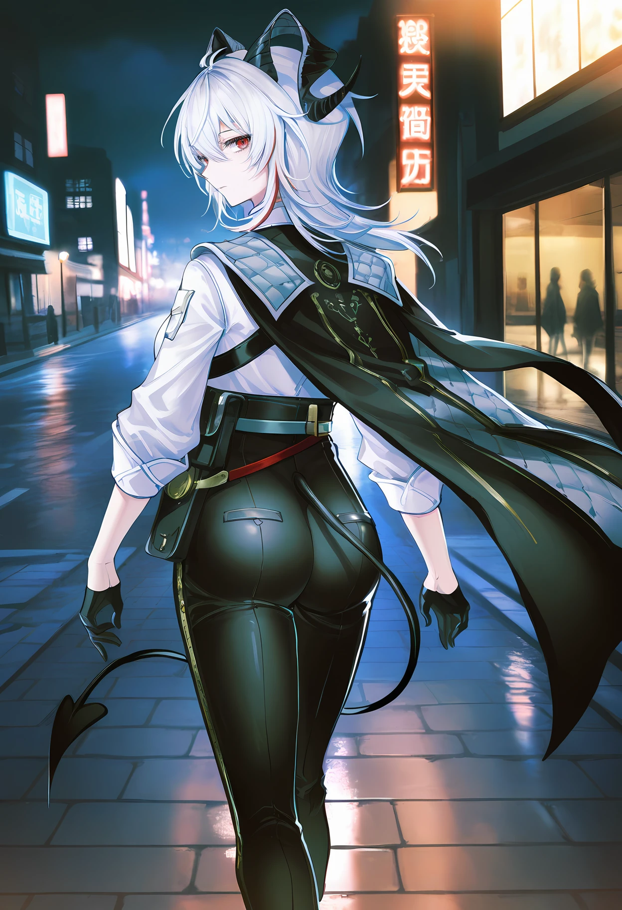 wwzani, two-tone eyes, red eyes, grey eyes, black eyelashes, red eyelashes, white hair, wolf cut, hair between eyes, streaked hair, demon horns, black horns, demon tail, mole under eye, single earring, key earring, black choker, frilled collar, popped collar, red necktie, tie clip, chest harness, white shirt, buttons, shirt tucked in, sleeves rolled up, armband, asymmetrical clothes, black gloves, half gloves, black jacket, cape, black belt, belt pouch, black pants, high-waist pants,
