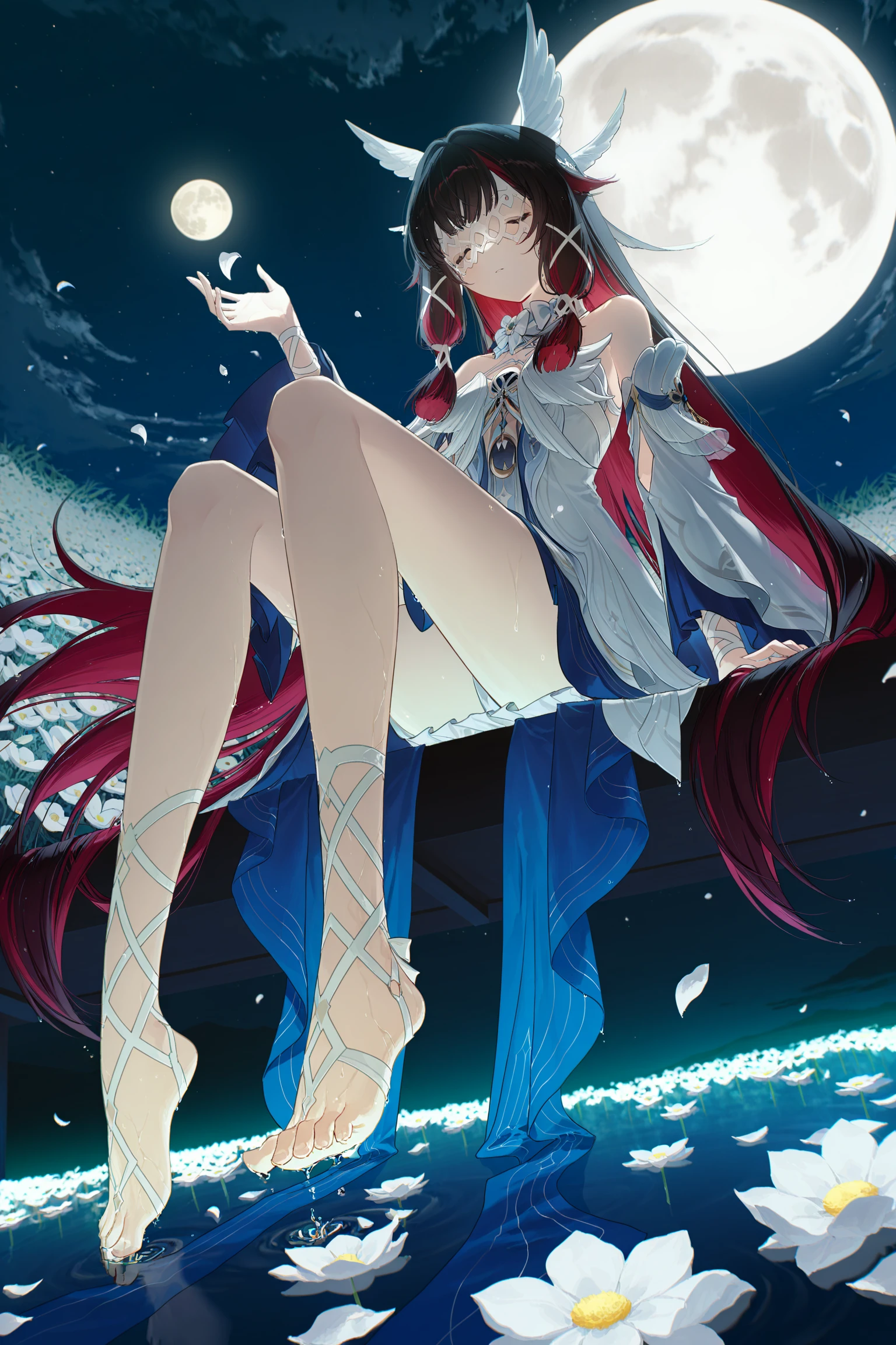 black hair,red hair,very long hair,eye mask,two-tone hair,wing hair ornament,x hair ornament,