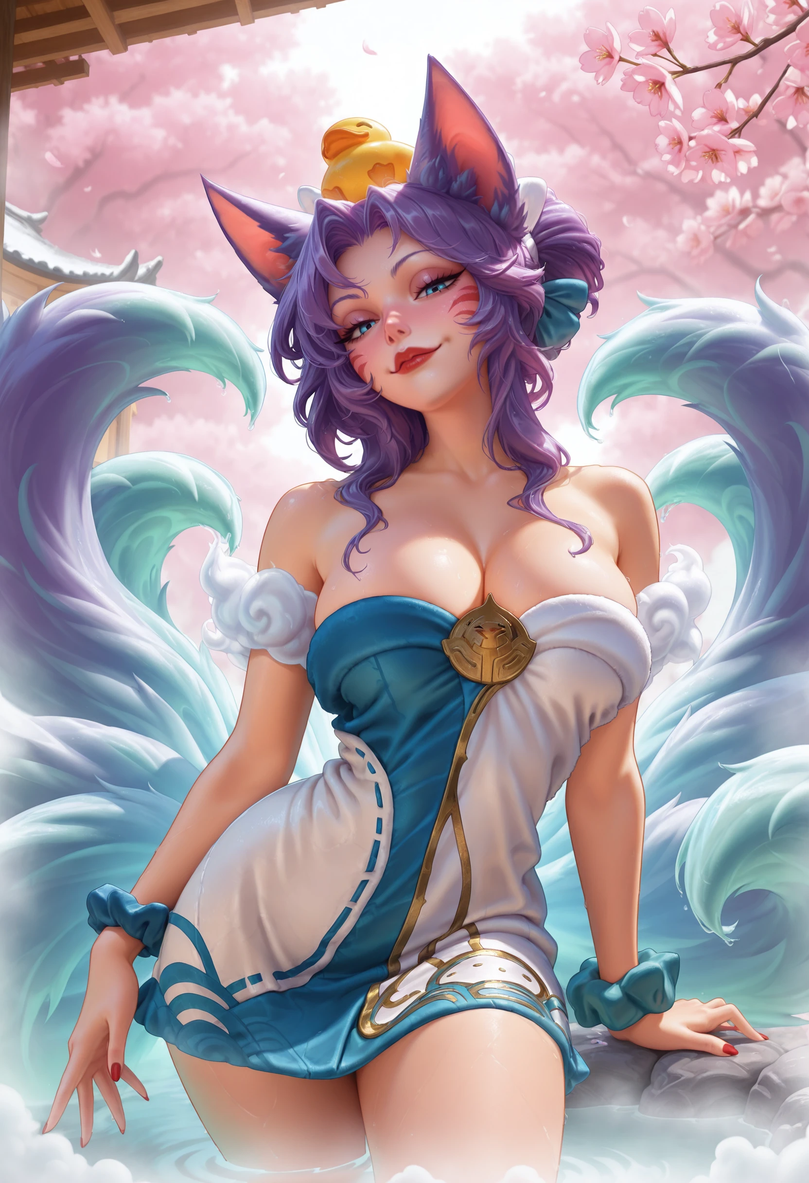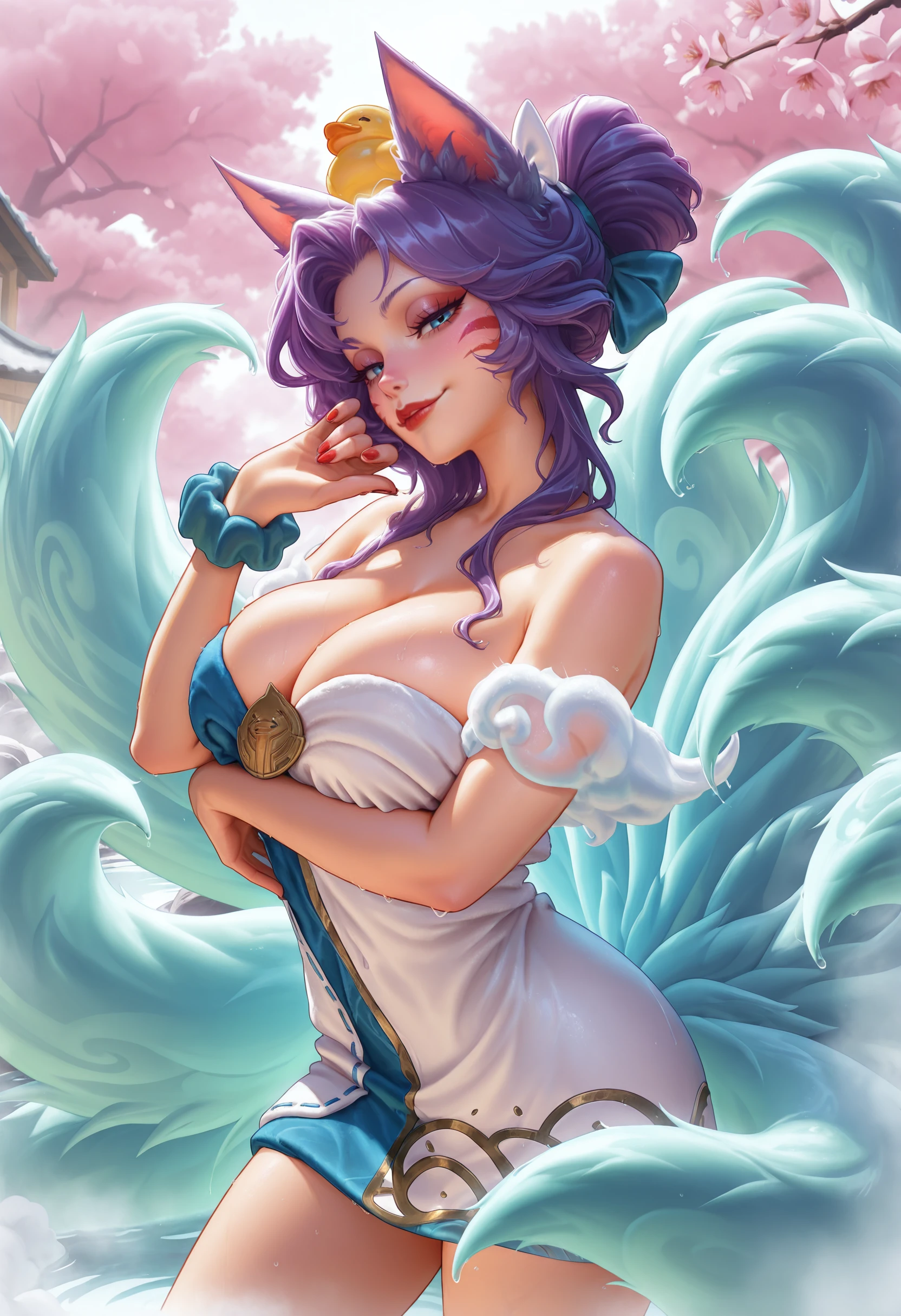 spiritblossomspringsahriil, long hair, single hair bun, hair ornament, purple hair, hair ribbon, blue eyes, fox ears, bow, object on head, rubber duck, red lips, whisker markings, kitsune, kyuubi, fox girl, large breasts, bare shoulders, red nails, fox tail, multiple tails, wrist scrunchie, dress, multicolored dress,