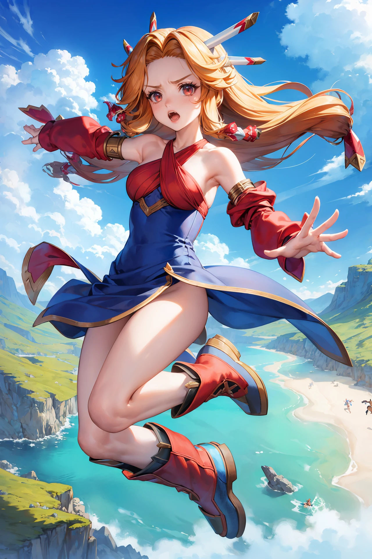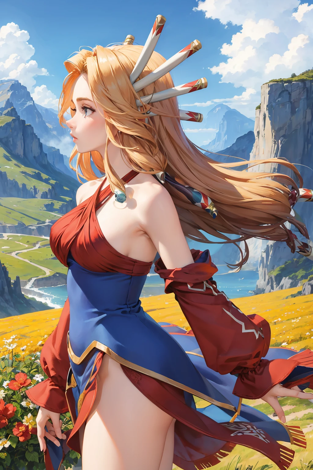 Add "hair ornament, halterneck, criss-cross halter, dress, detached sleeves, boots" for her regular look.