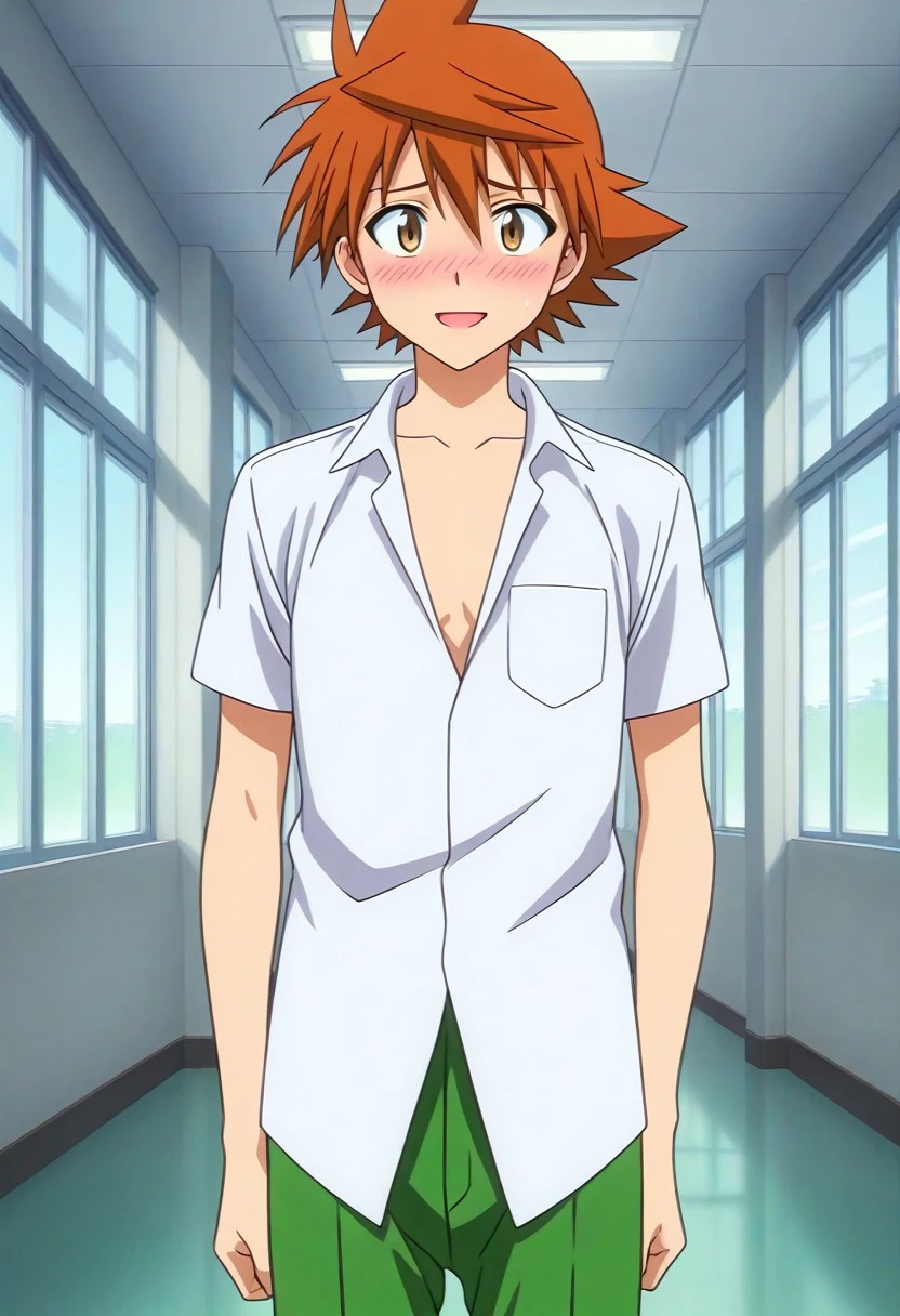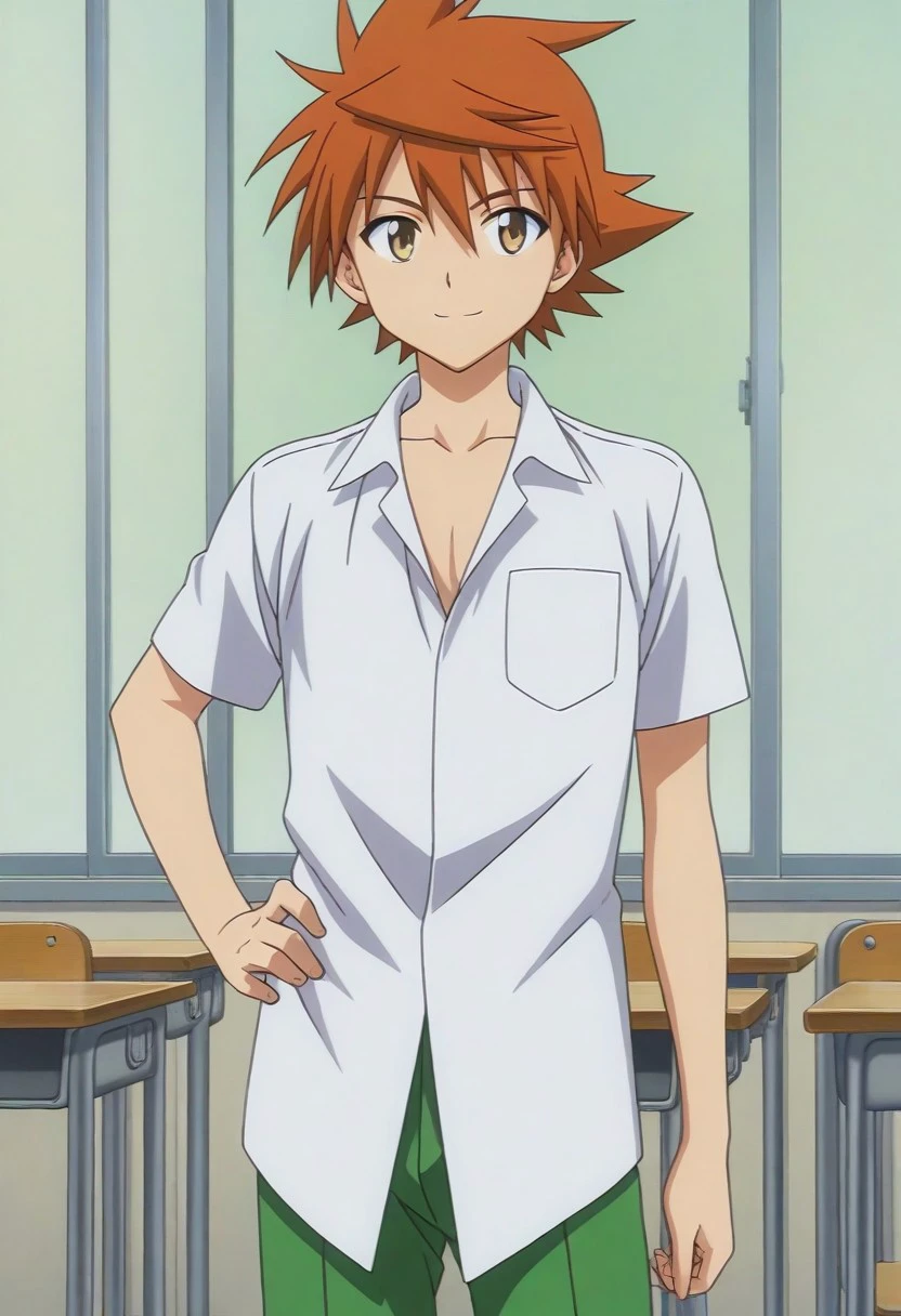 Rito Yuuki, orange hair, gold-brown eyes, white collared shirt, short sleeves, green pants