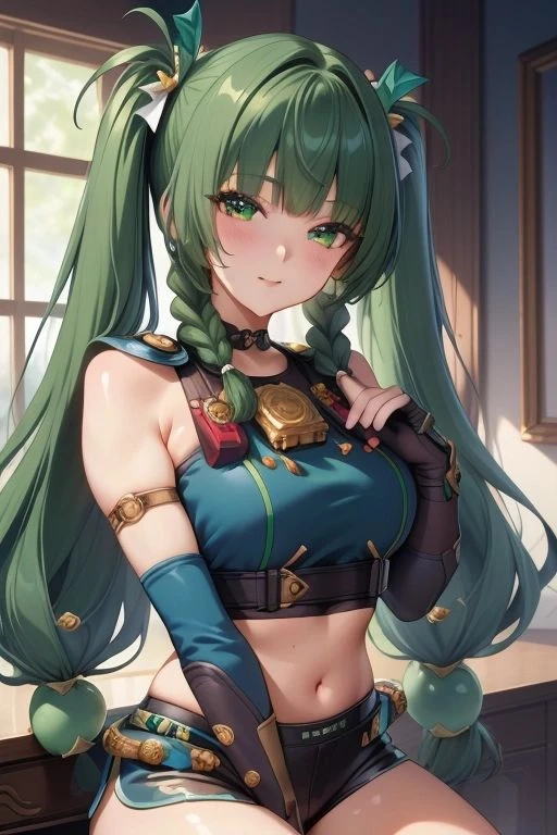 Trigger words: qingyi_a, green eyes, long hair, twintails, very long hair, braid, green hair, twin braids, bare shoulders, crop top, short shorts, shorts, black shorts, gloves, black gloves, fingerless gloves, joints,