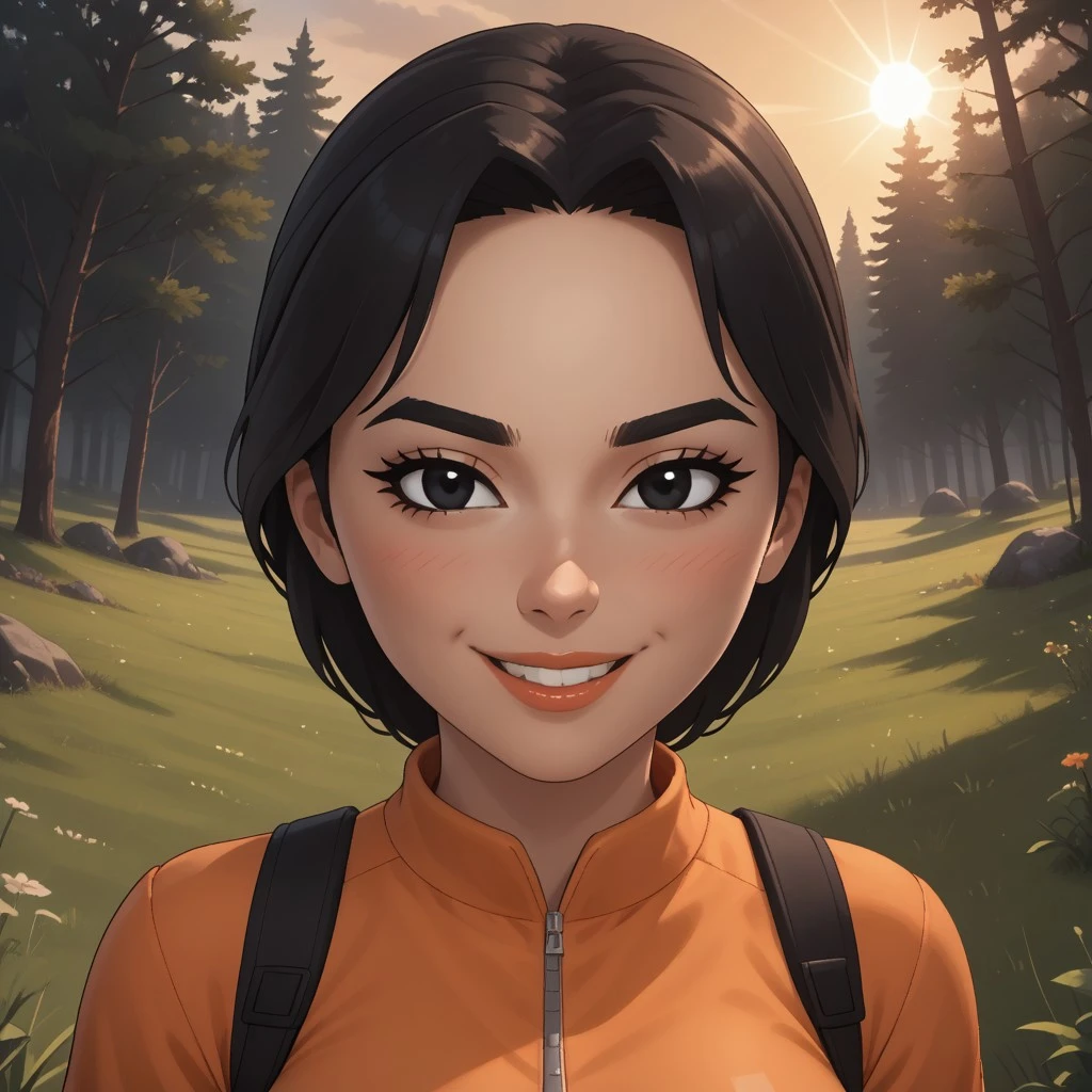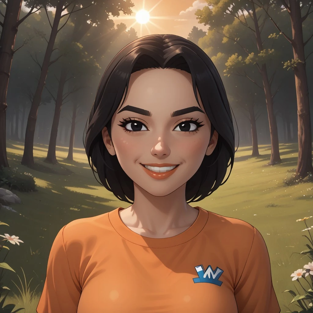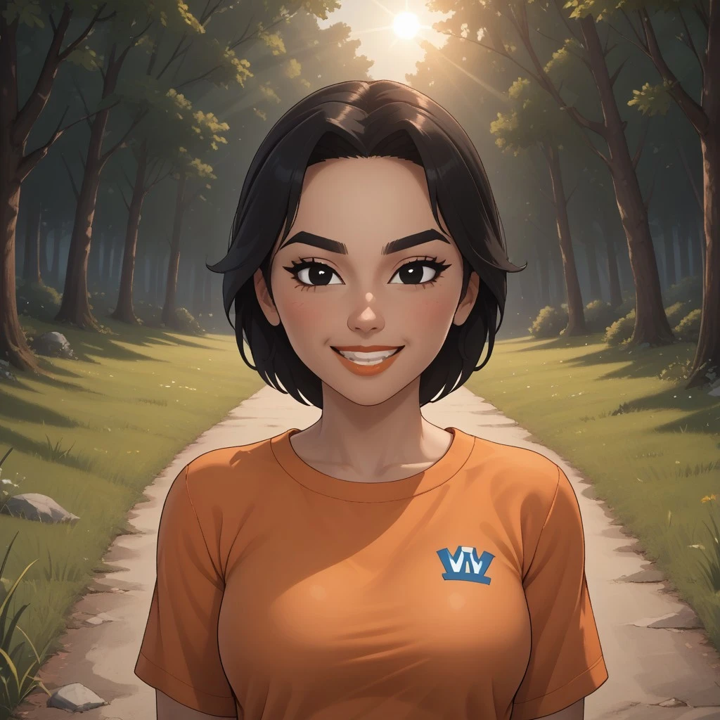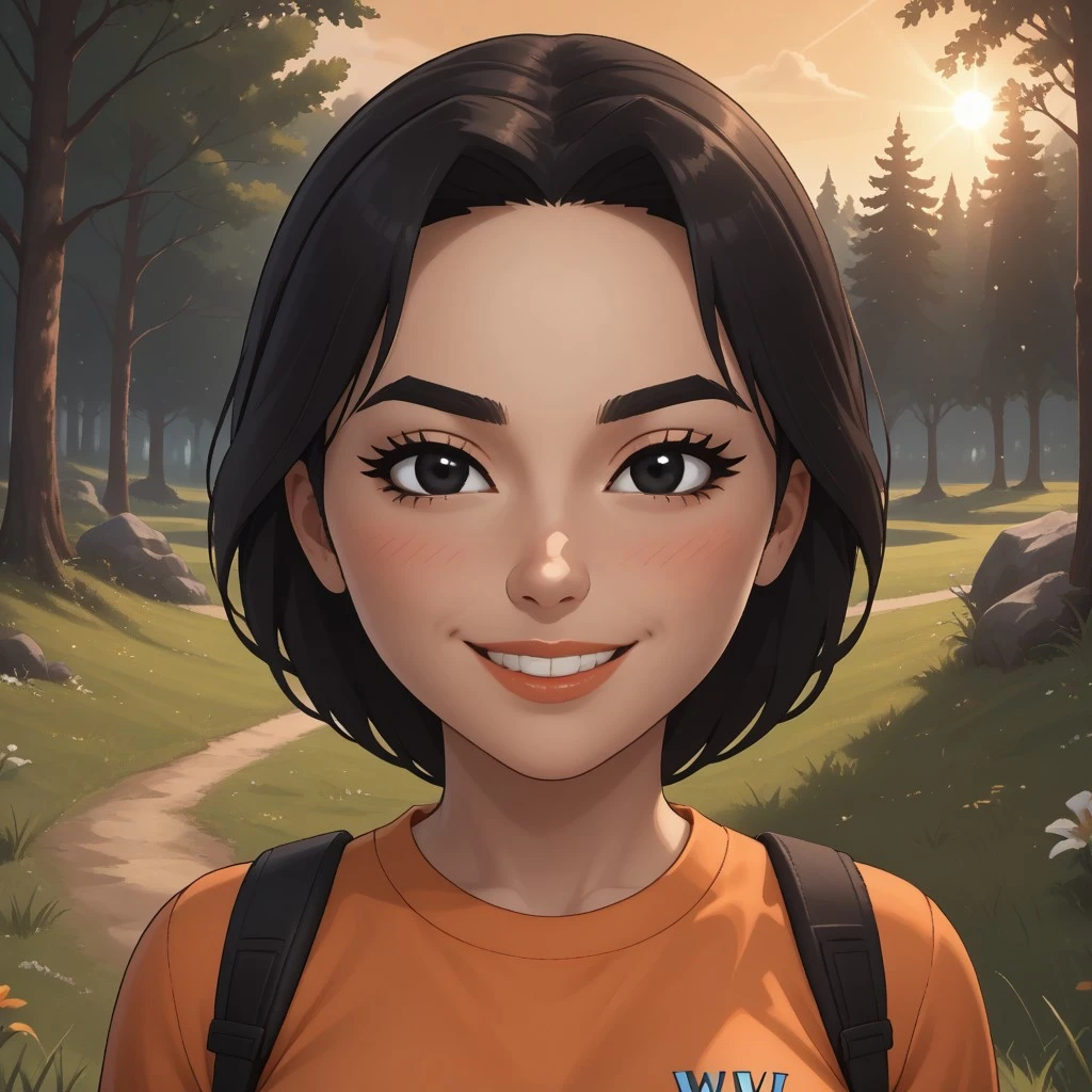 wii, mii, wii sports, 1girl, cute, female mii, black hair, black eyebrows, black eyes, blush, lips, teeth, orange clothing, black pants, shoes, JialanWSC, breasts, nintendo mii, modern_mii, classic_mii