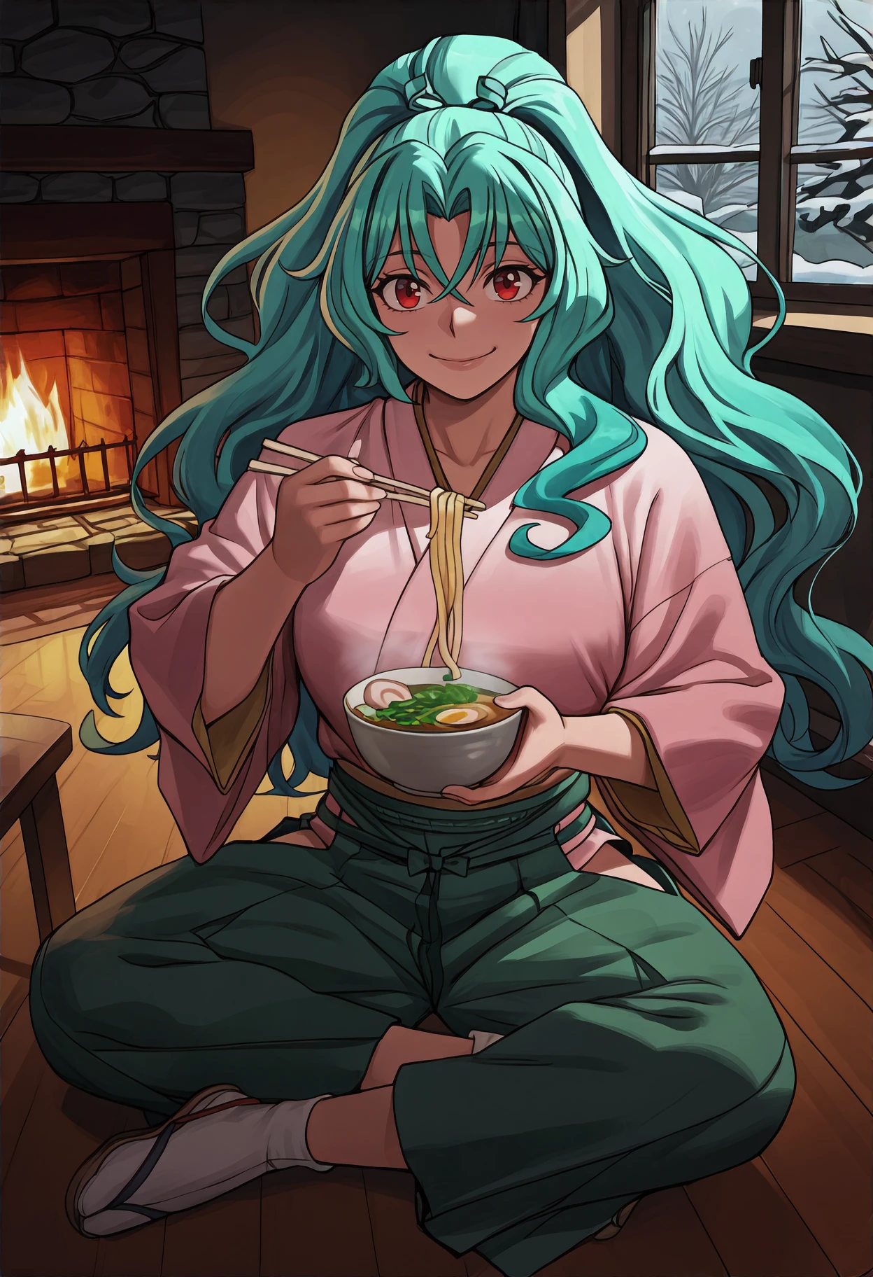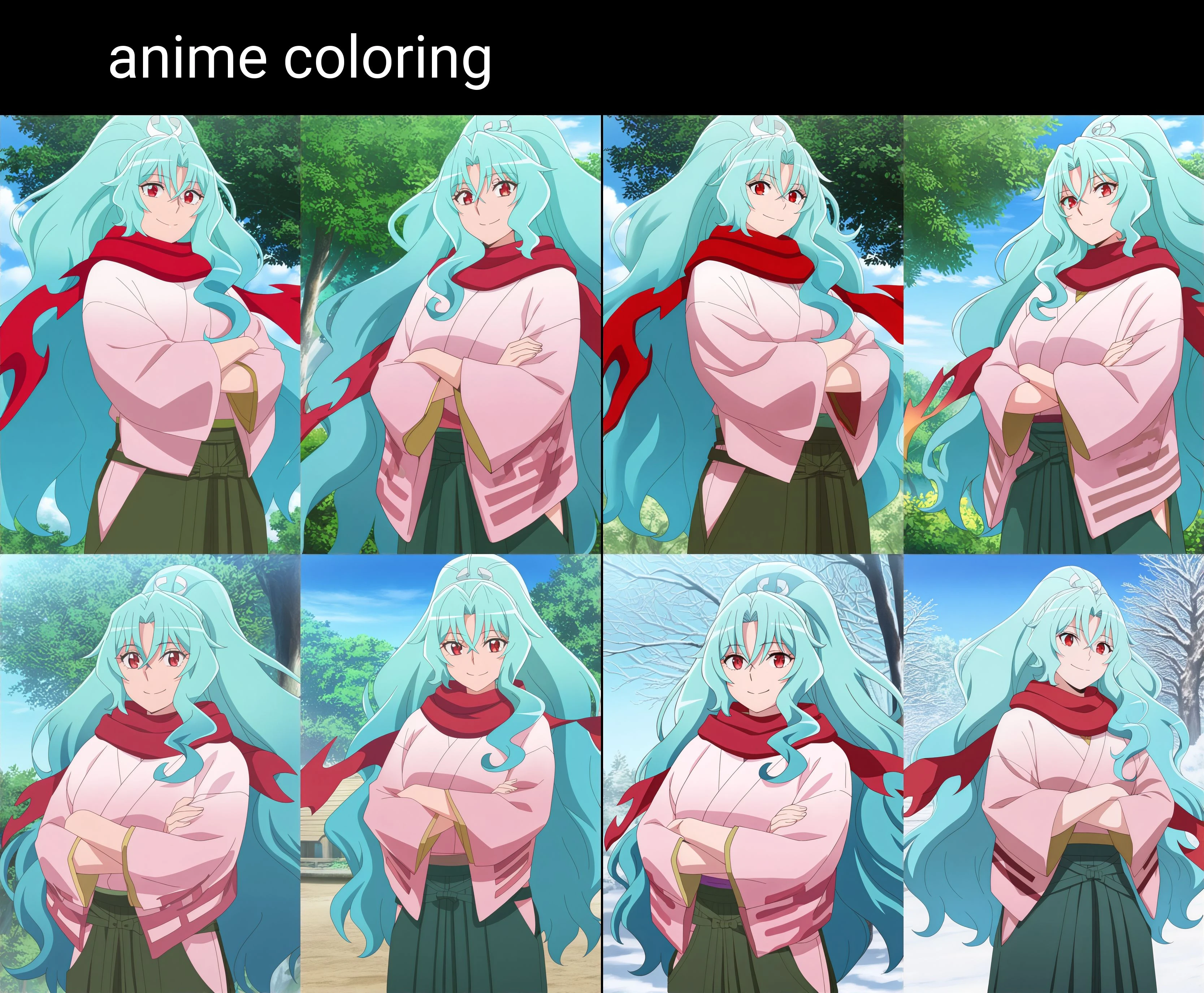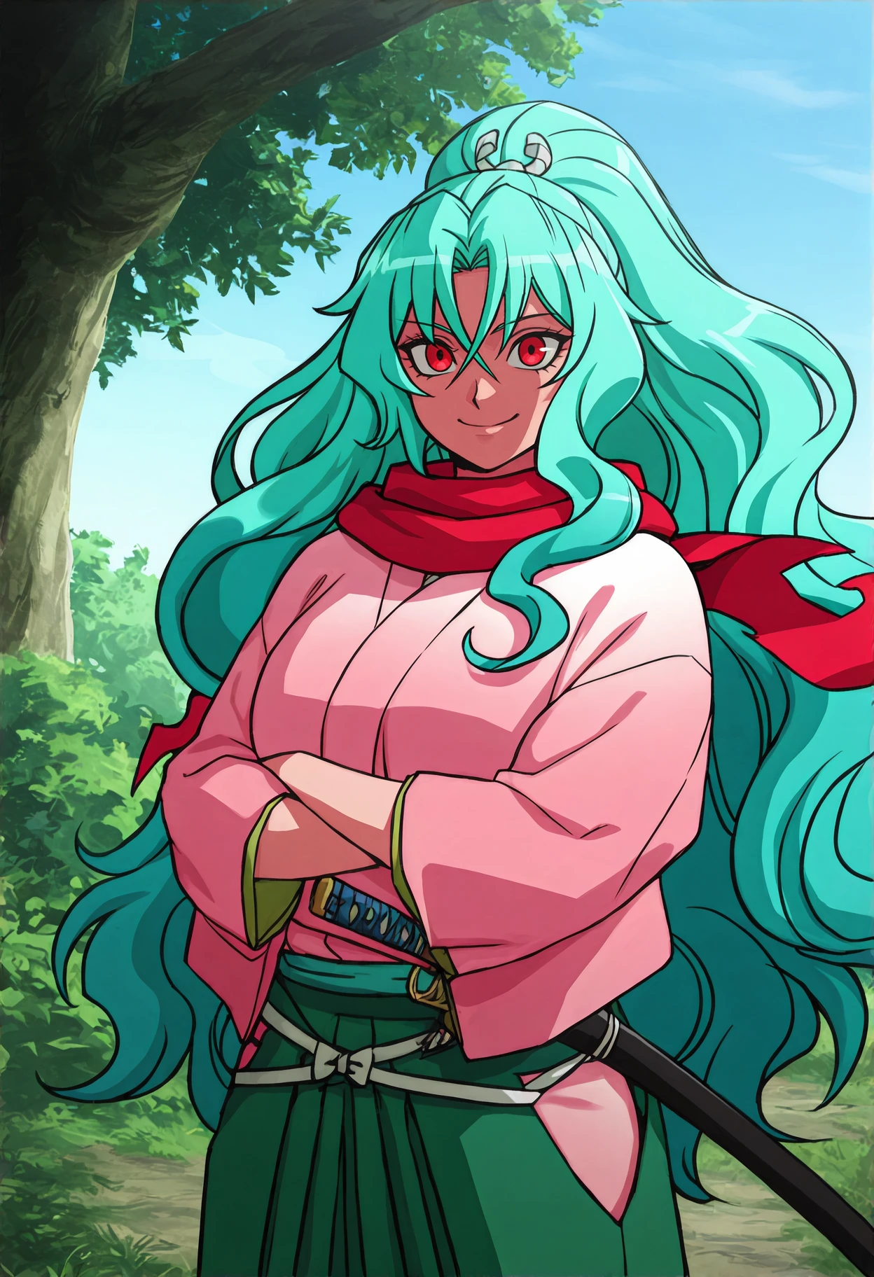 Outfit: red scarf, pink kimono, wide sleeves, hakama pants, green hakama, hip vent, white socks, zouri