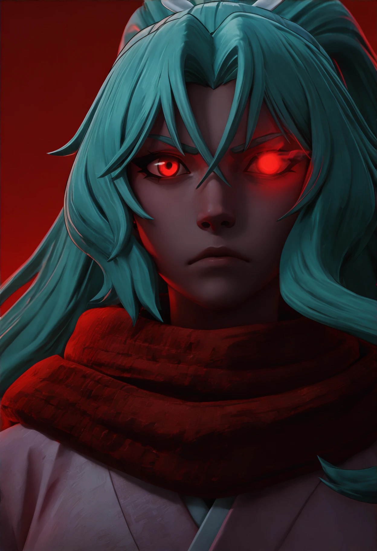 aqua hair, wavy hair, very long hair, hair between eyes, parted bangs, high ponytail, hair ribbon, white ribbon, red eyes