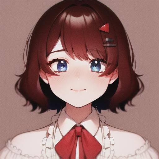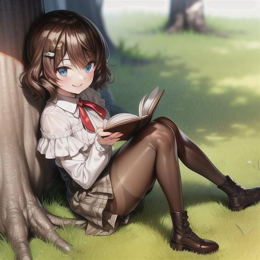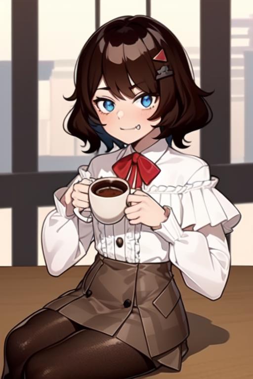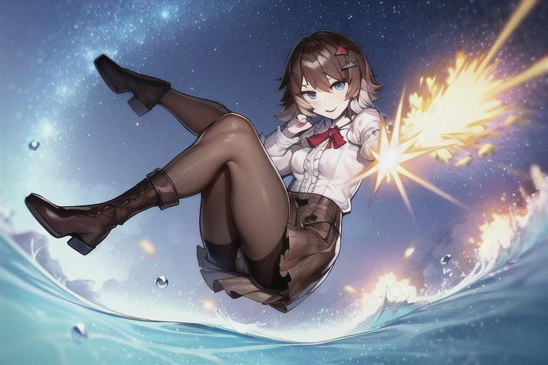 Accompanying tags: frilled shirt, blue eyes, brown short hair, hair ornament, frilled sleeves, brown skirt, brown pantyhose, boots, cross-laced footwear