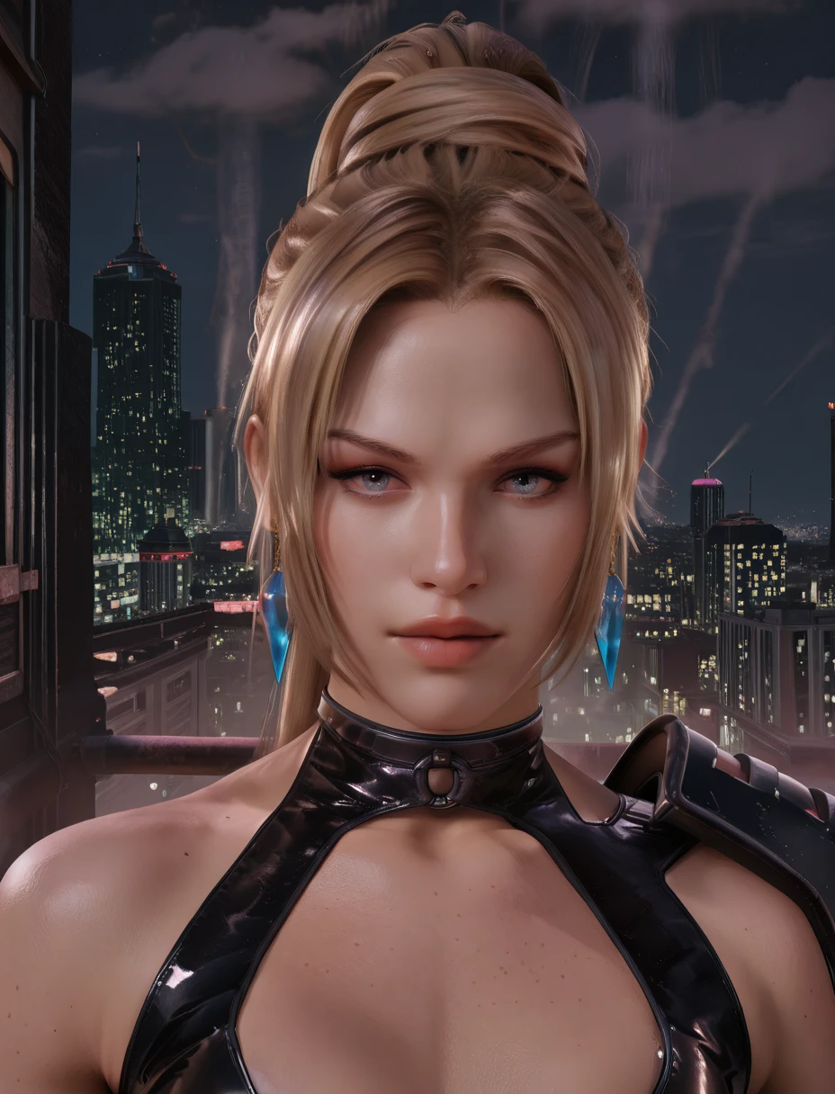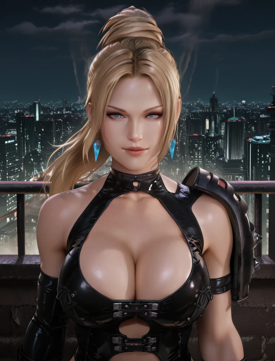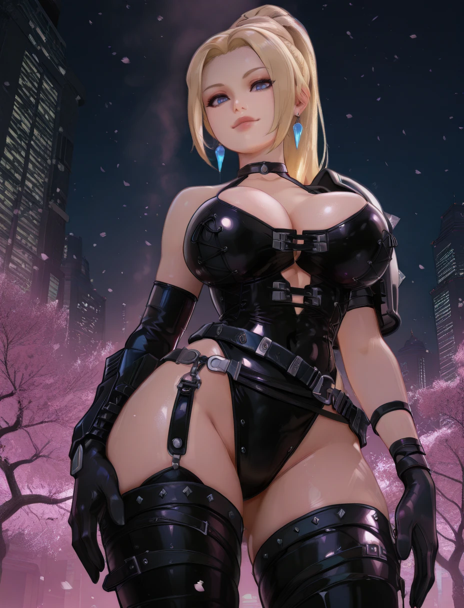 choker,elbow gloves,earrings, black leotard,shoulder armor,cleavage, belt, thigh boots, asymmetrical gloves, silver headband,