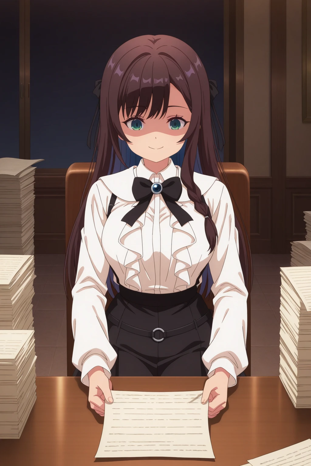 aaalina, green eyes, brown hair, colored inner hair, long hair, side braid, alinadef, black hair ribbon, black bowtie, brooch, white dress shirt, frilled shirt, shirt tucked in, suspenders, suspender skirt, high-waist skirt, black belt, black skirt, anime coloring,Executioner: