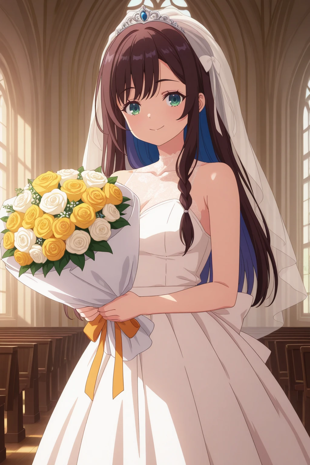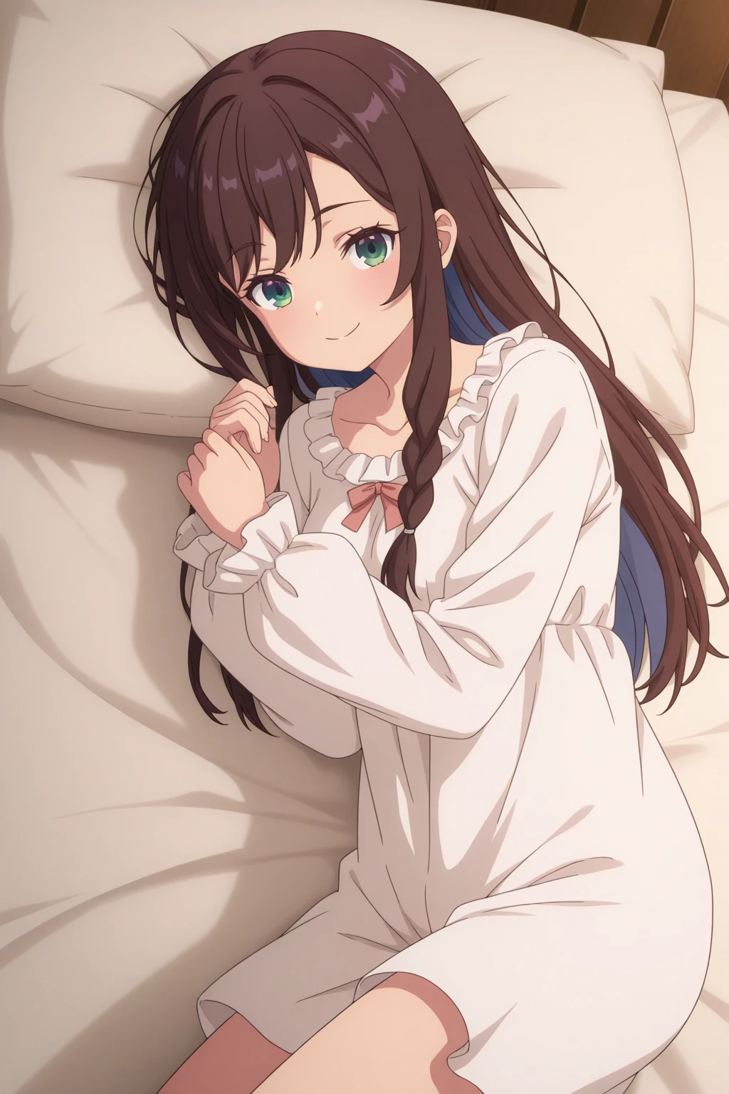 aaalina, green eyes, brown hair, colored inner hair, long hair, side braid, sleepwear, white dress, frilled collar, collarbone, long sleeves, pink bow, anime coloring,