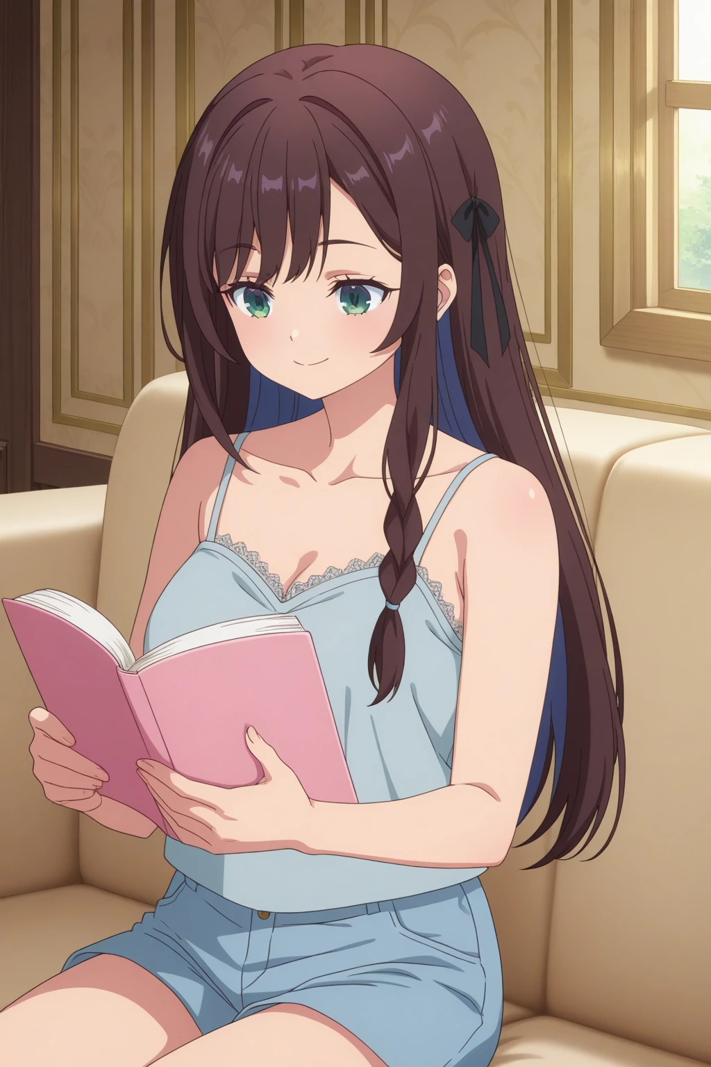 aaalina, green eyes, brown hair, colored inner hair, long hair, side braid, alinalounge, blue camisole, spaghetti strap, collarbone, blue shorts, short shorts, anime coloring,