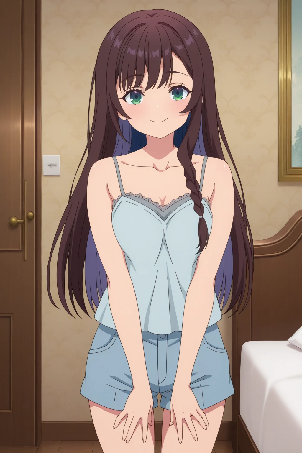aaalina, green eyes, brown hair, colored inner hair, long hair, side braid, alinalounge, blue camisole, spaghetti strap, collarbone, blue shorts, short shorts, anime coloring,Sleepwear: