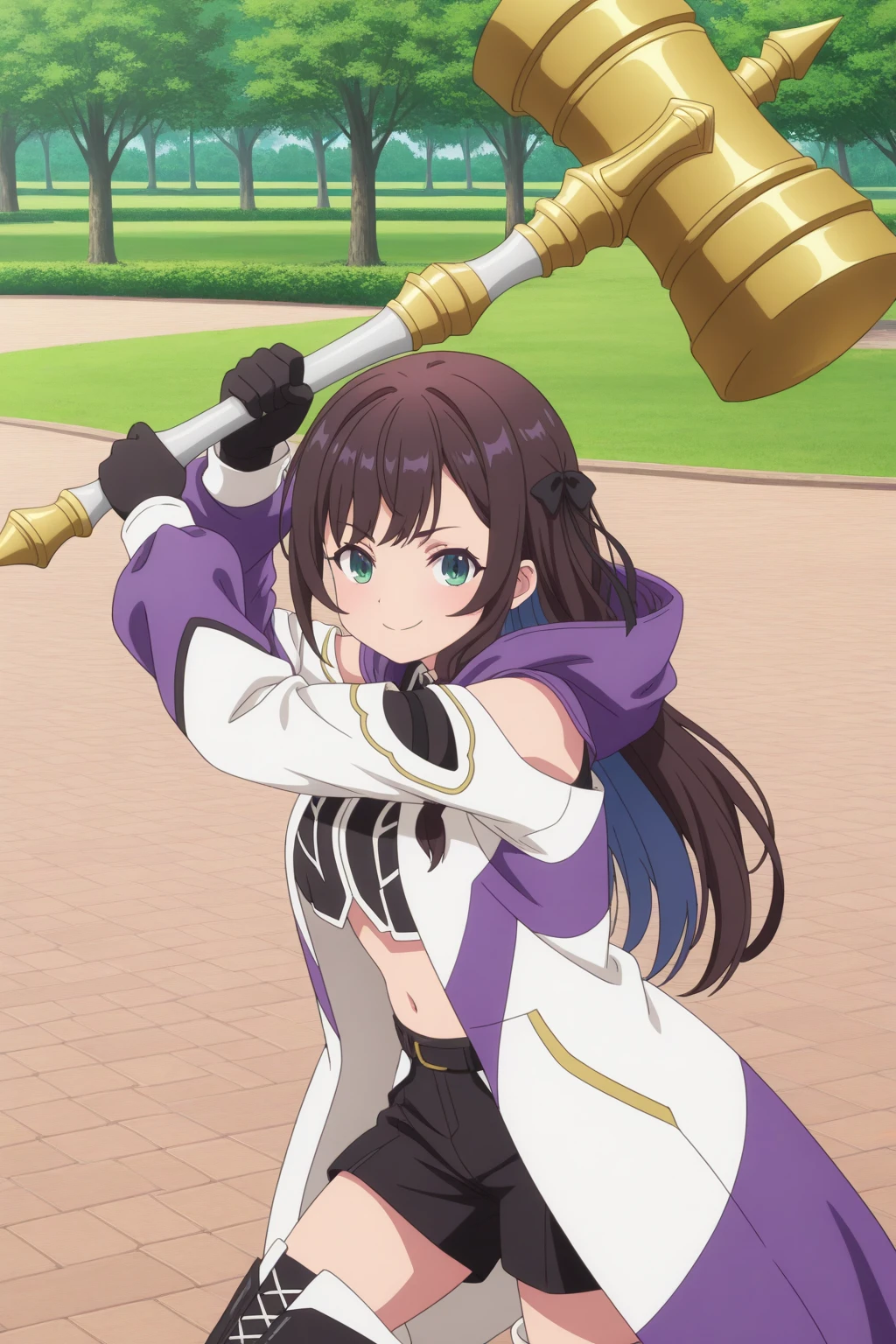 aaalina, green eyes, brown hair, colored inner hair, long hair, side braid, alinaexecutioner, black hair ribbon, black shirt, crop top, jacket, shoulder cutout, two tone jacket, hooded jacket, hood down, black gloves, navel, black shorts, thigh boots, anime coloring,