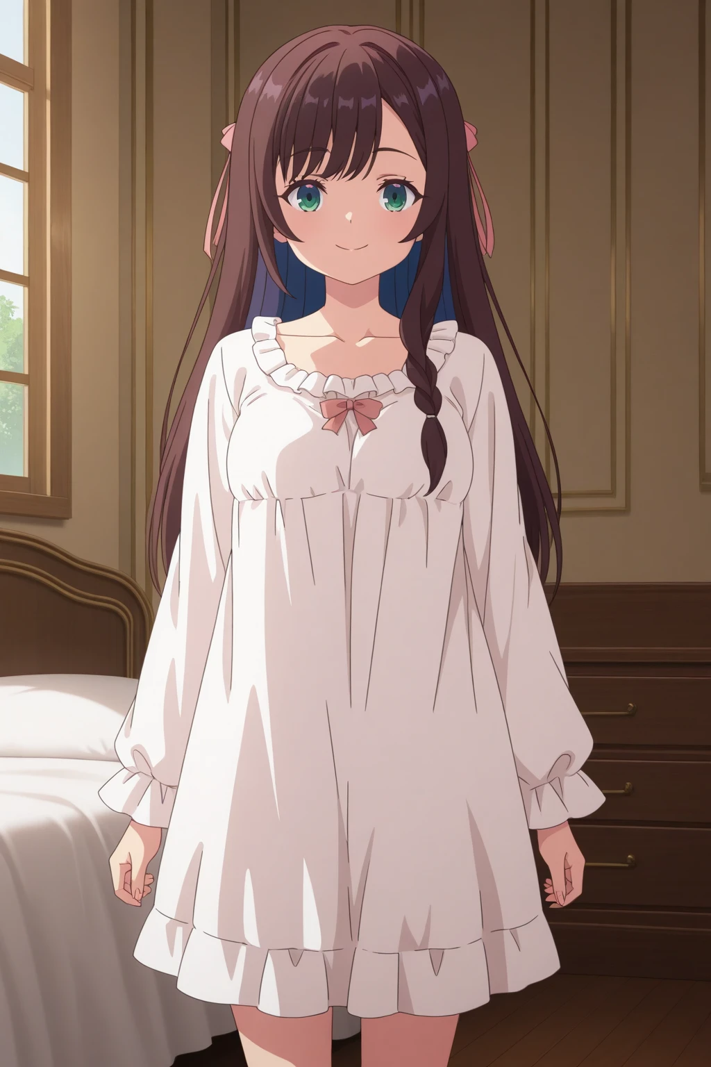 aaalina, green eyes, brown hair, colored inner hair, long hair, side braid, sleepwear, white dress, frilled collar, collarbone, long sleeves, pink bow, anime coloring,Description