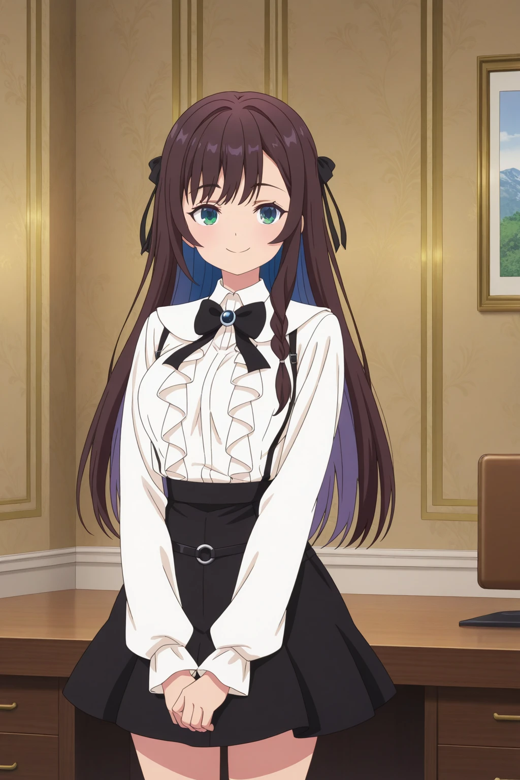 aaalina, green eyes, brown hair, colored inner hair, long hair, side braid, alinadef, black hair ribbon, black bowtie, brooch, white dress shirt, frilled shirt, shirt tucked in, suspenders, suspender skirt, high-waist skirt, black belt, black skirt, anime coloring,