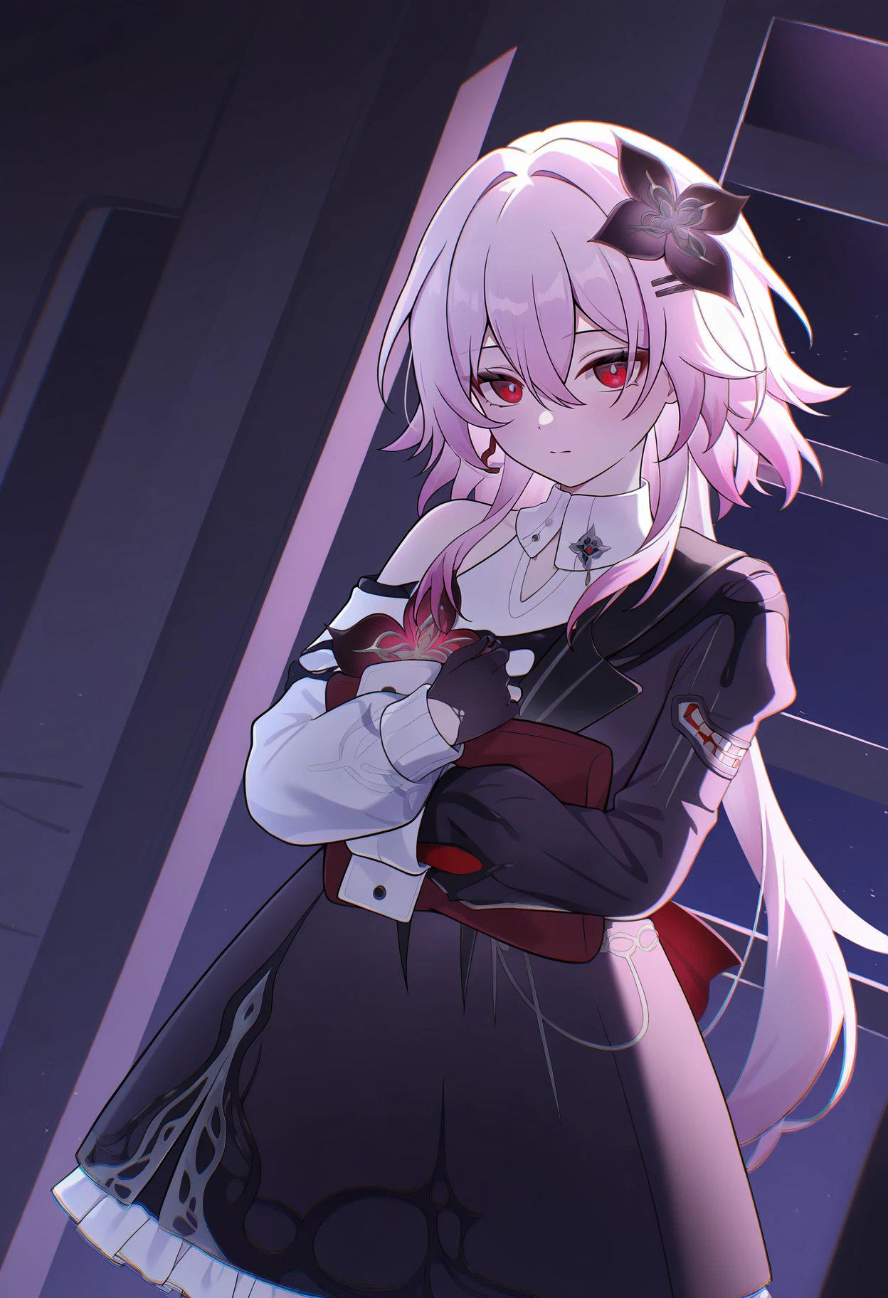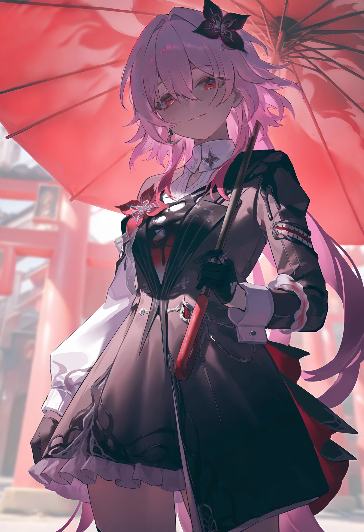 Trigger Word: evernight,1girl,black gloves,hair between eyes,hair ornament,long hair,pink hair,red eyes,long sleeves,hair flower,black dress,umbrella,jewelry,single earring,jacket,asymmetrical sleeves,white shirt,multicolored clothes,