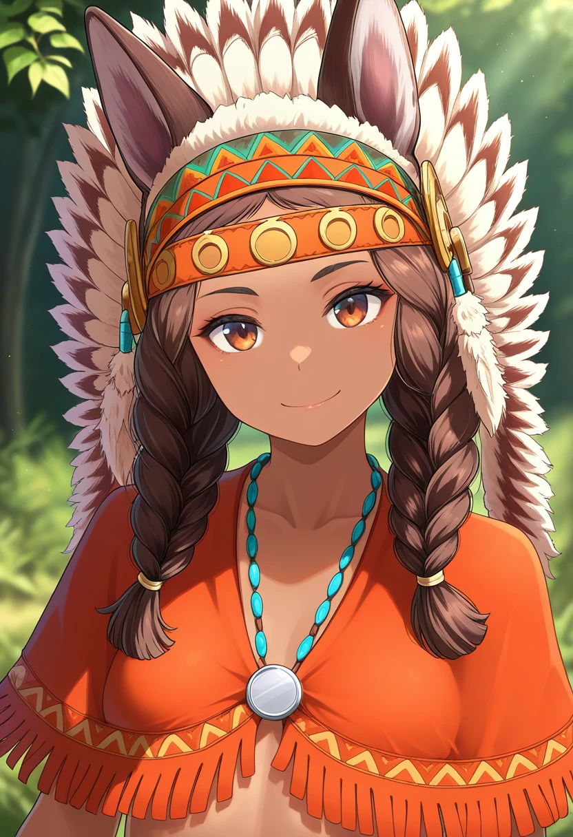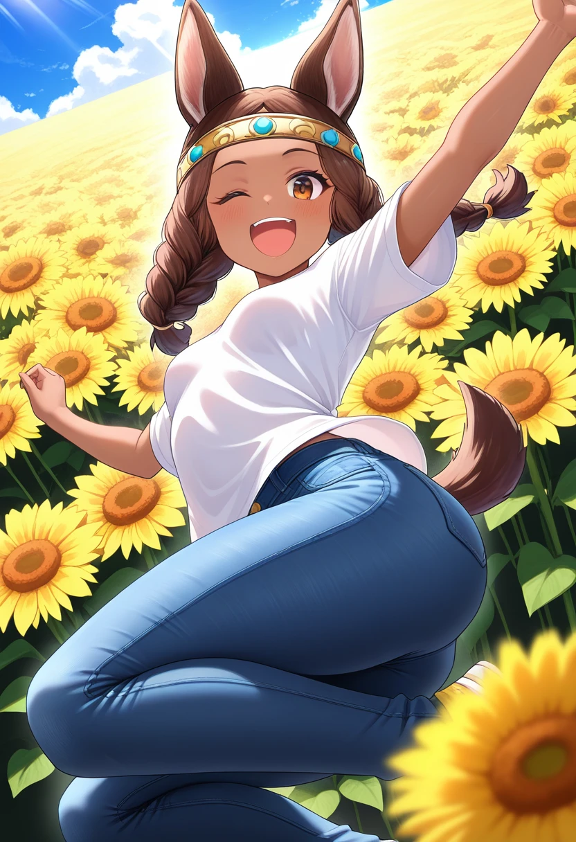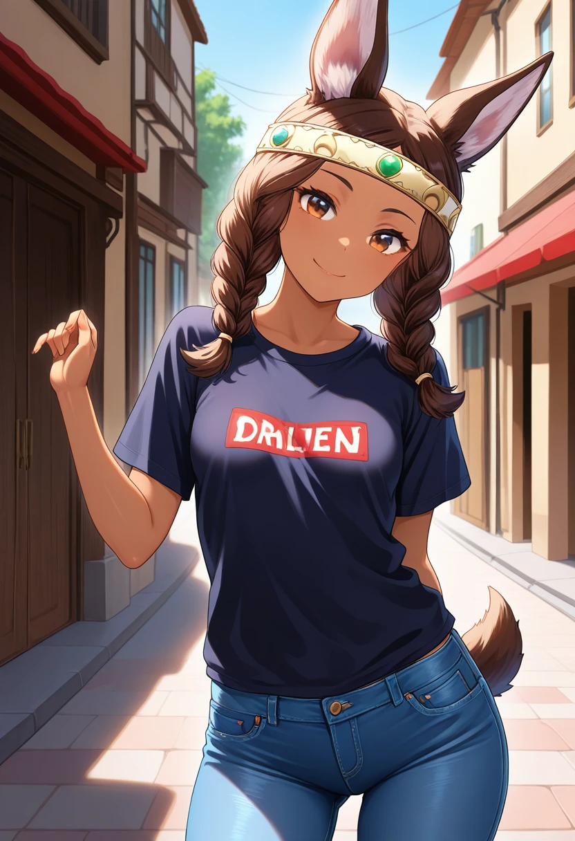ordiyww, dark skin, dark-skinned female, brown eyes, brown hair, long hair, twin braids, headband, animal ears, tail, small breasts,