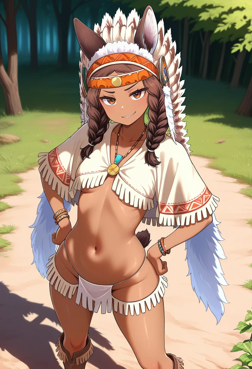 tribal, headdress, fringe trim, feathers, revealing clothes, capelet, loincloth, boots, jewelry, necklace, bracelet,