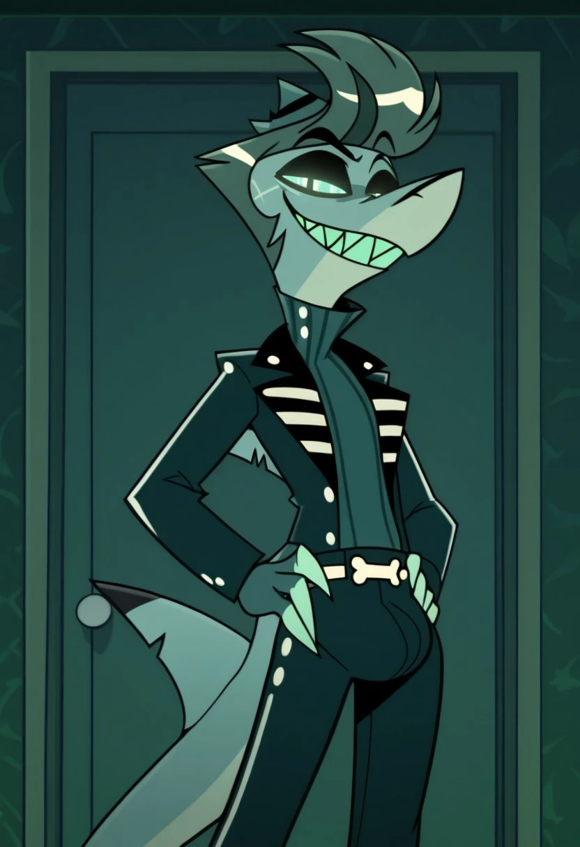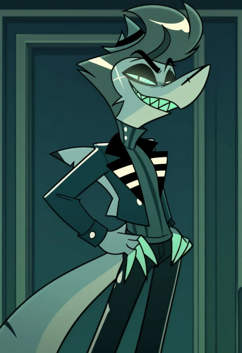 chaz, anthro, shark, 2D, blue skin, sharp teeth, glowing eyes, flat colors, cartoon, spiral eyes, slit pupils, black eyebrows,