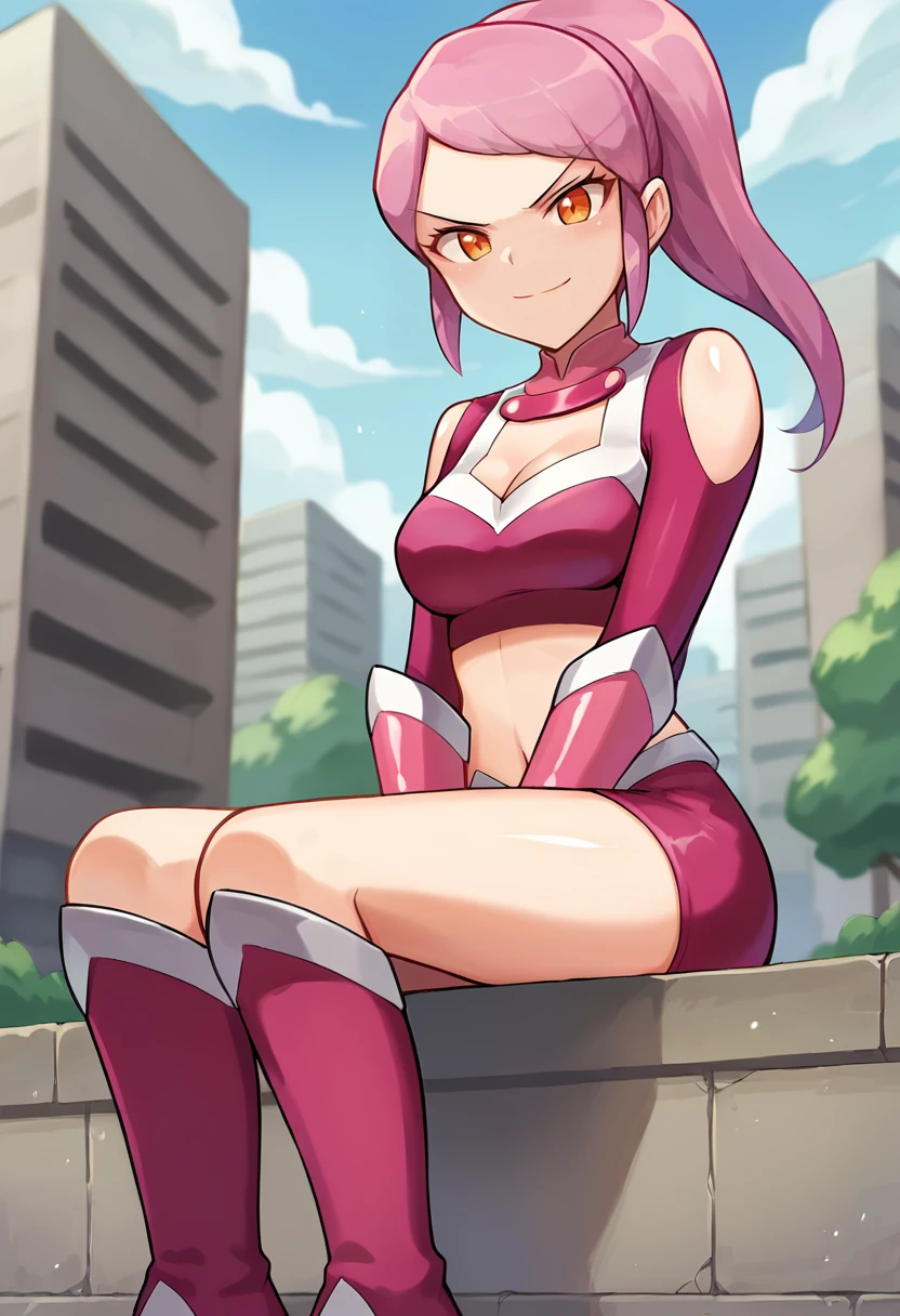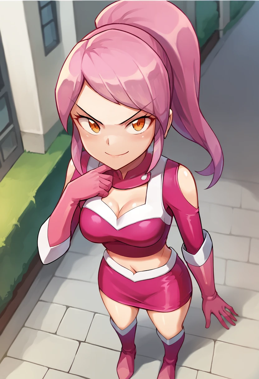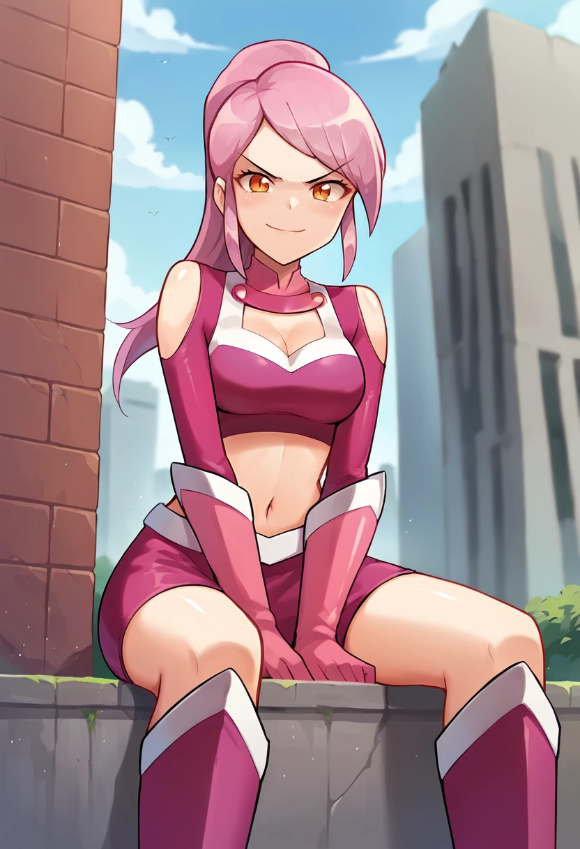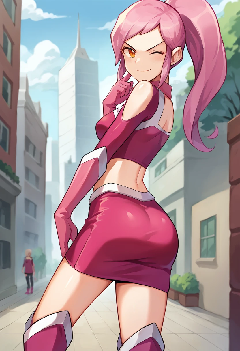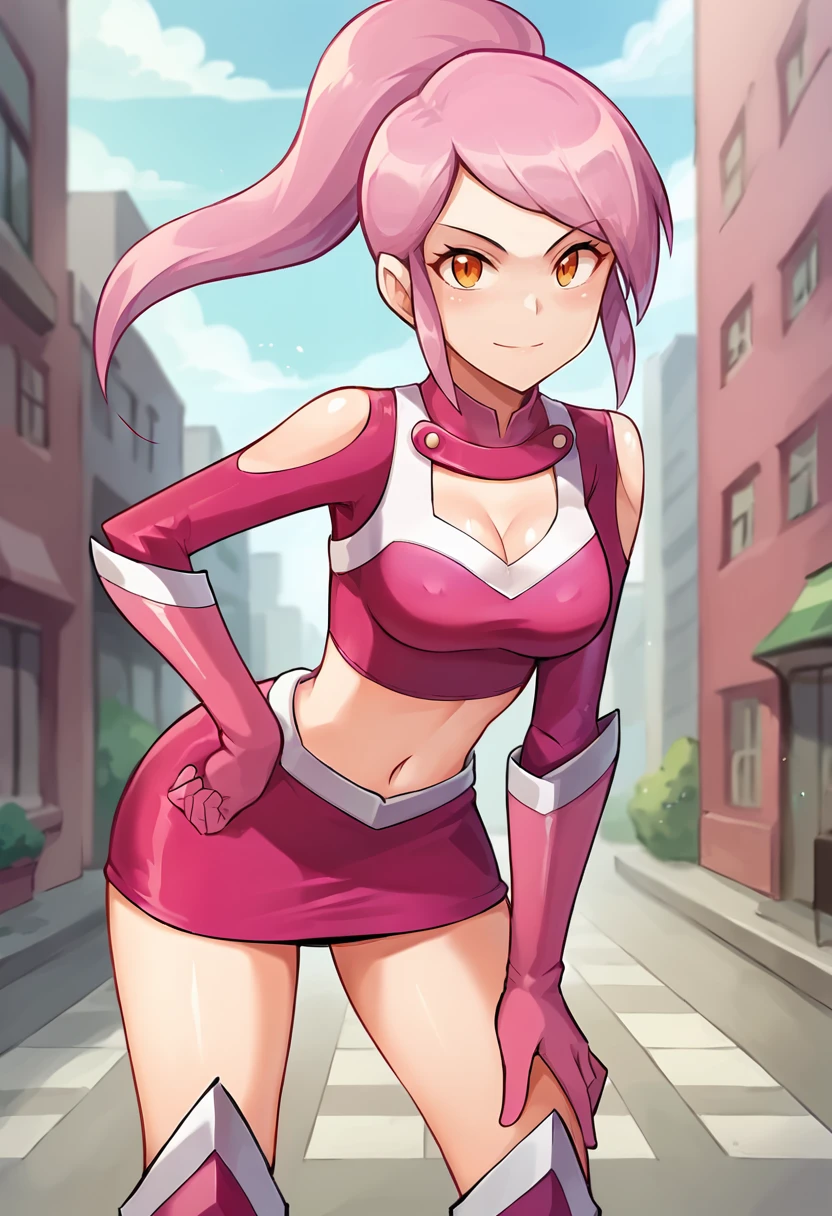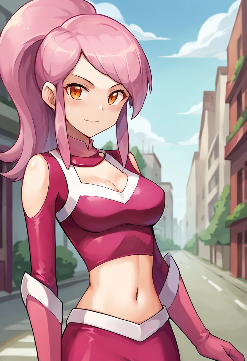 score_9, score_8_up, score_7_up, source_anime, masterpiece, 1girl, ct_lavana, pink hair, ponytail, long hair, orange eyes, pink crop top, long sleeves, elbow gloves, pink miniskirt, looking at viewer, outdoors, city, depth of field, day, cowboy shot, hand up, cleavage, medium breasts, shiny skin, Negative prompt ❌:
