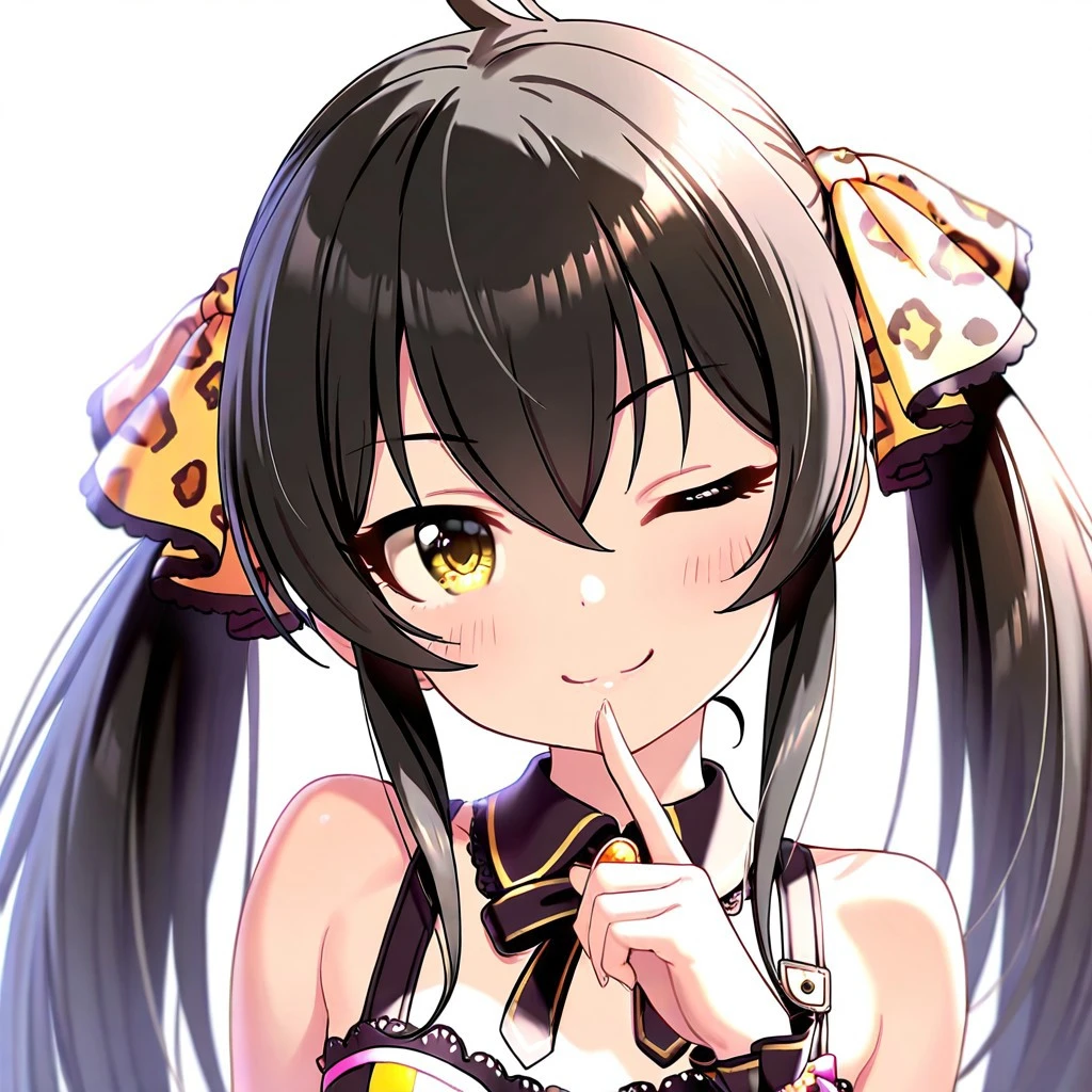 black hair,sidelocks,ahoge,yellow eyes,twintails,long hair