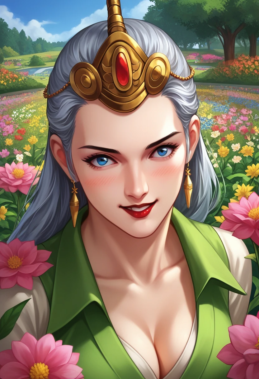 chenluoyan, ((sliver hair)), long hair, hair ornament, blue eyes, red lips, cleavage,