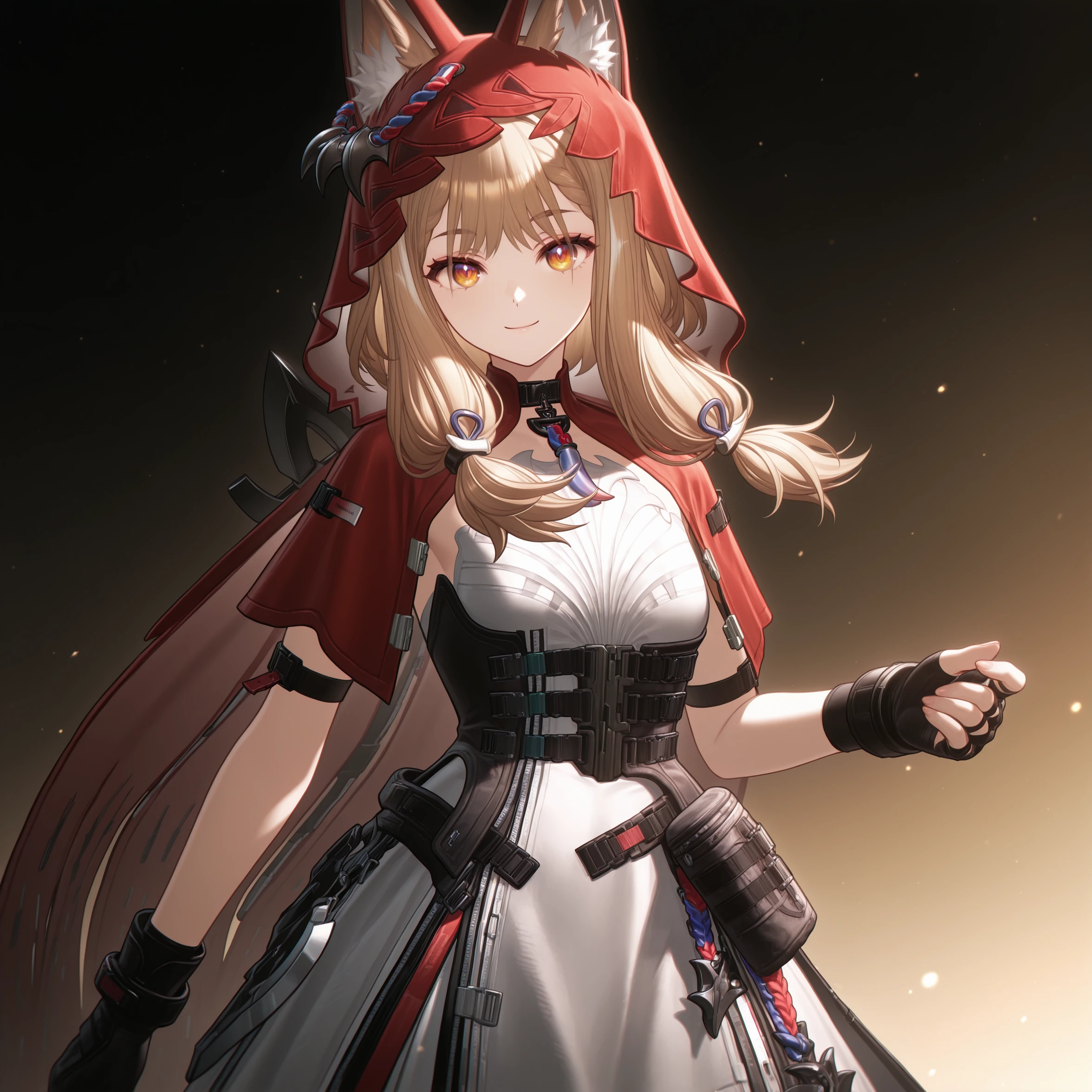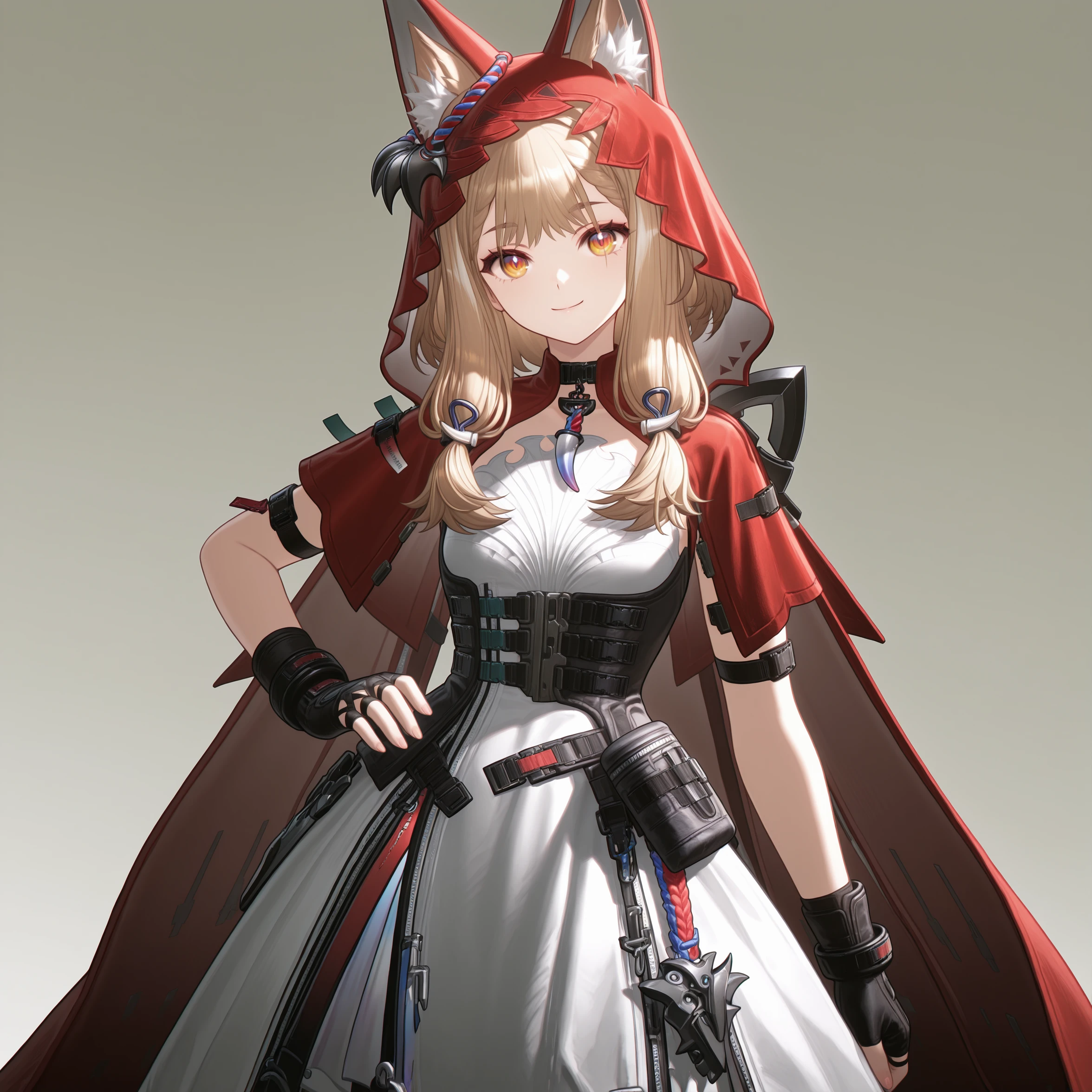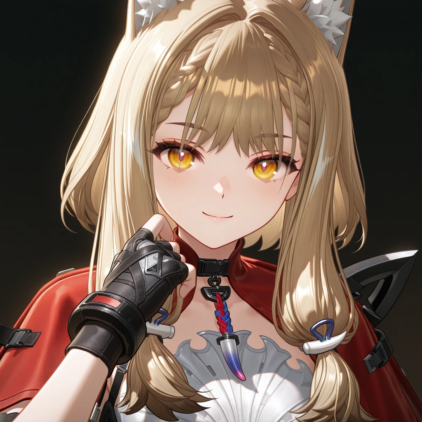 masterpiece, best quality, very aesthetic, newest, hires, Rossi, 1girl, solo, smile, blush, looking at viewer, closed mouth, upper body, black gloves, simple background,For full-body shots, you can try adding full body or boots.