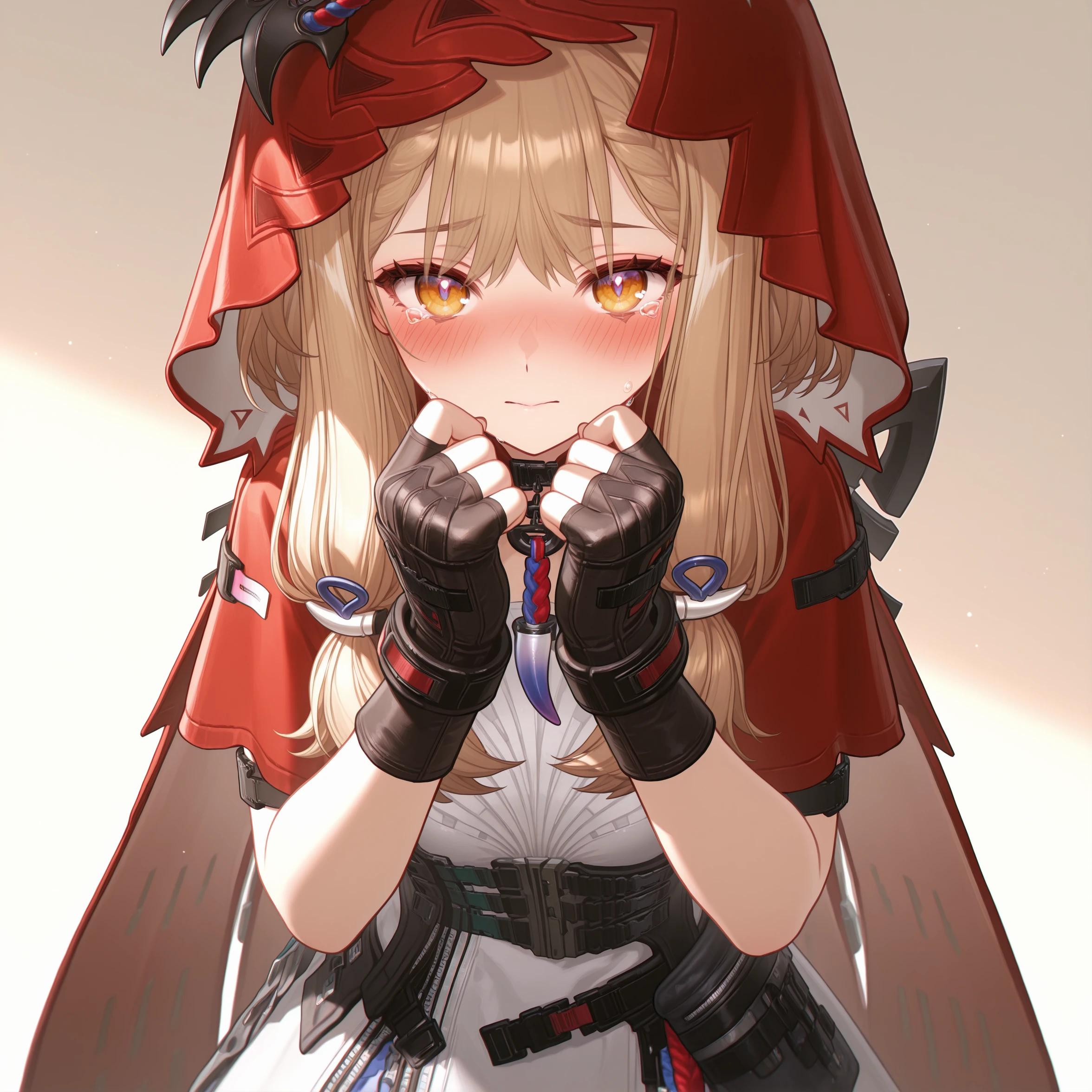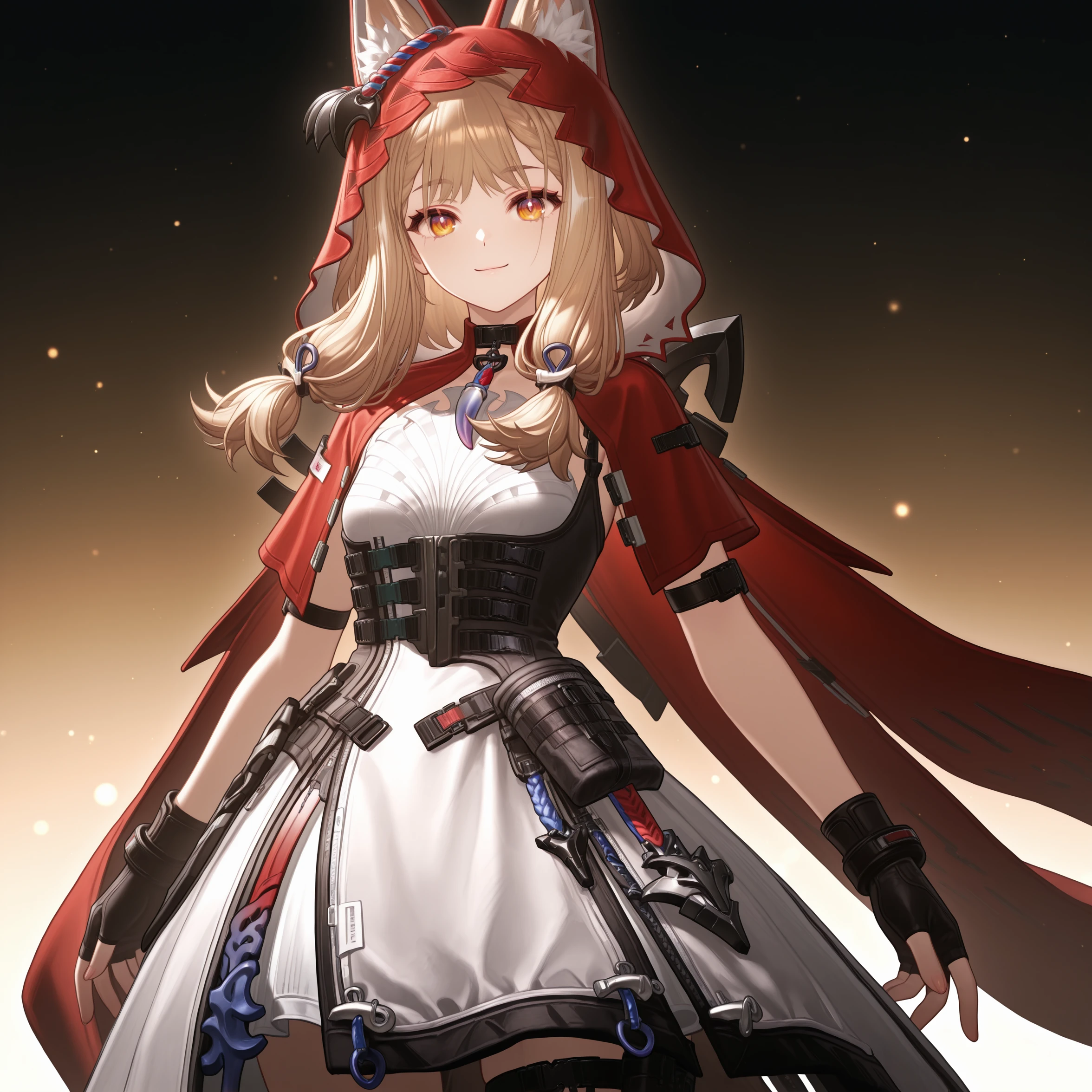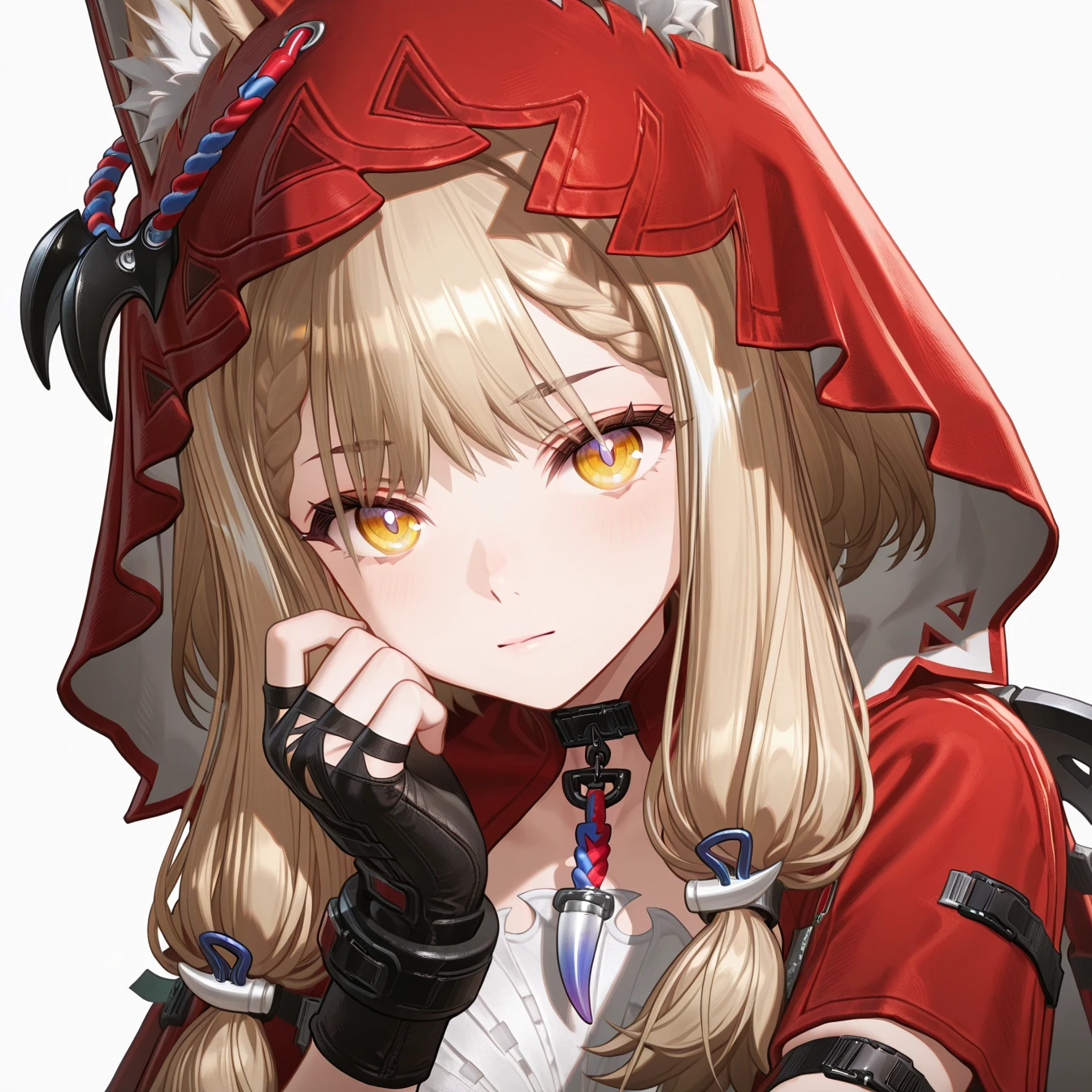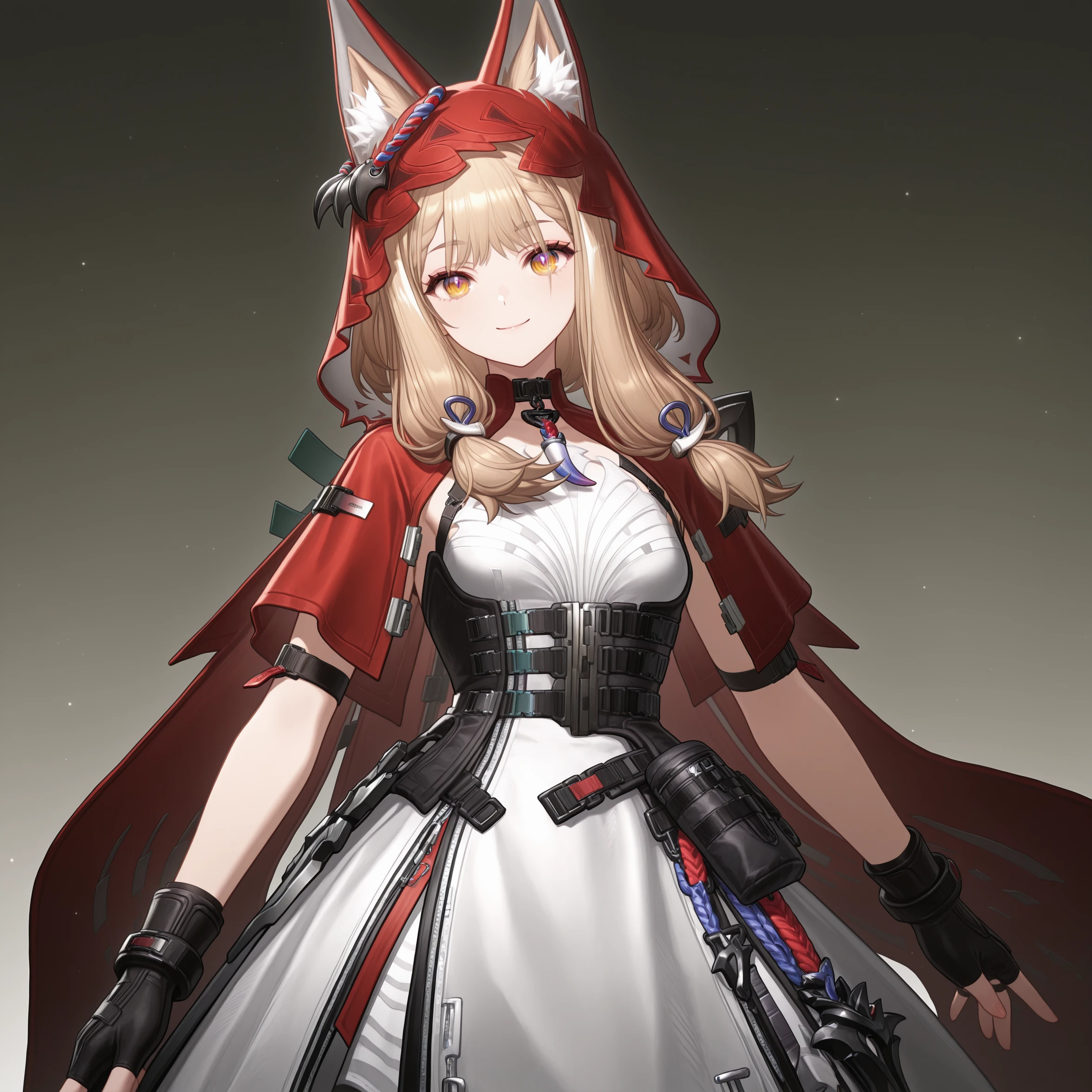 masterpiece, best quality, very aesthetic, newest, hires, Rossi, 1girl, solo, smile, blush, looking at viewer, closed mouth, upper body, black gloves, simple background,For full-body shots, you can try adding full body or boots.