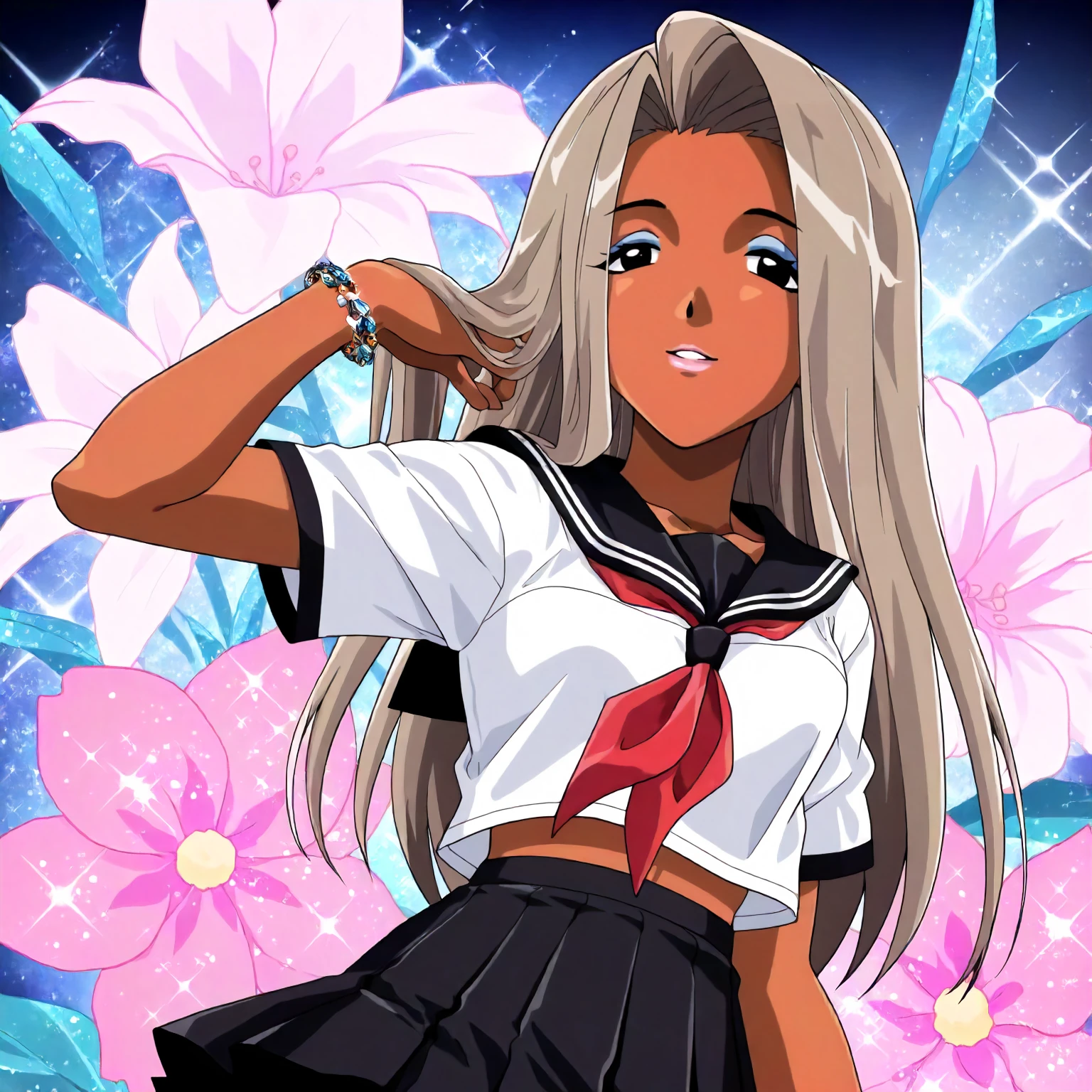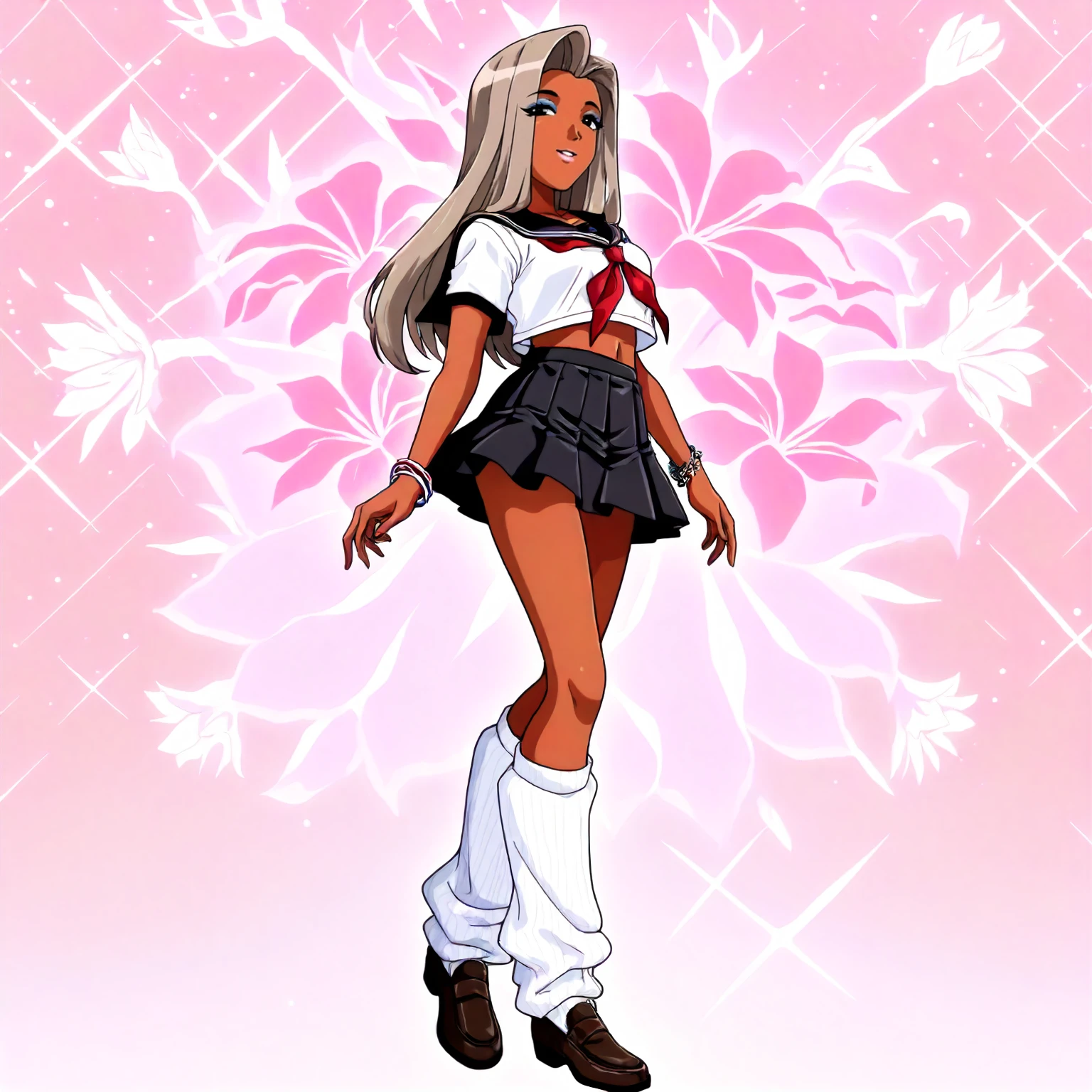 black sailor collar,red_neckerchief,white shirt,short_sleeves,midriff, bracelet, black skirt,pleated_skirt,miniskirt,