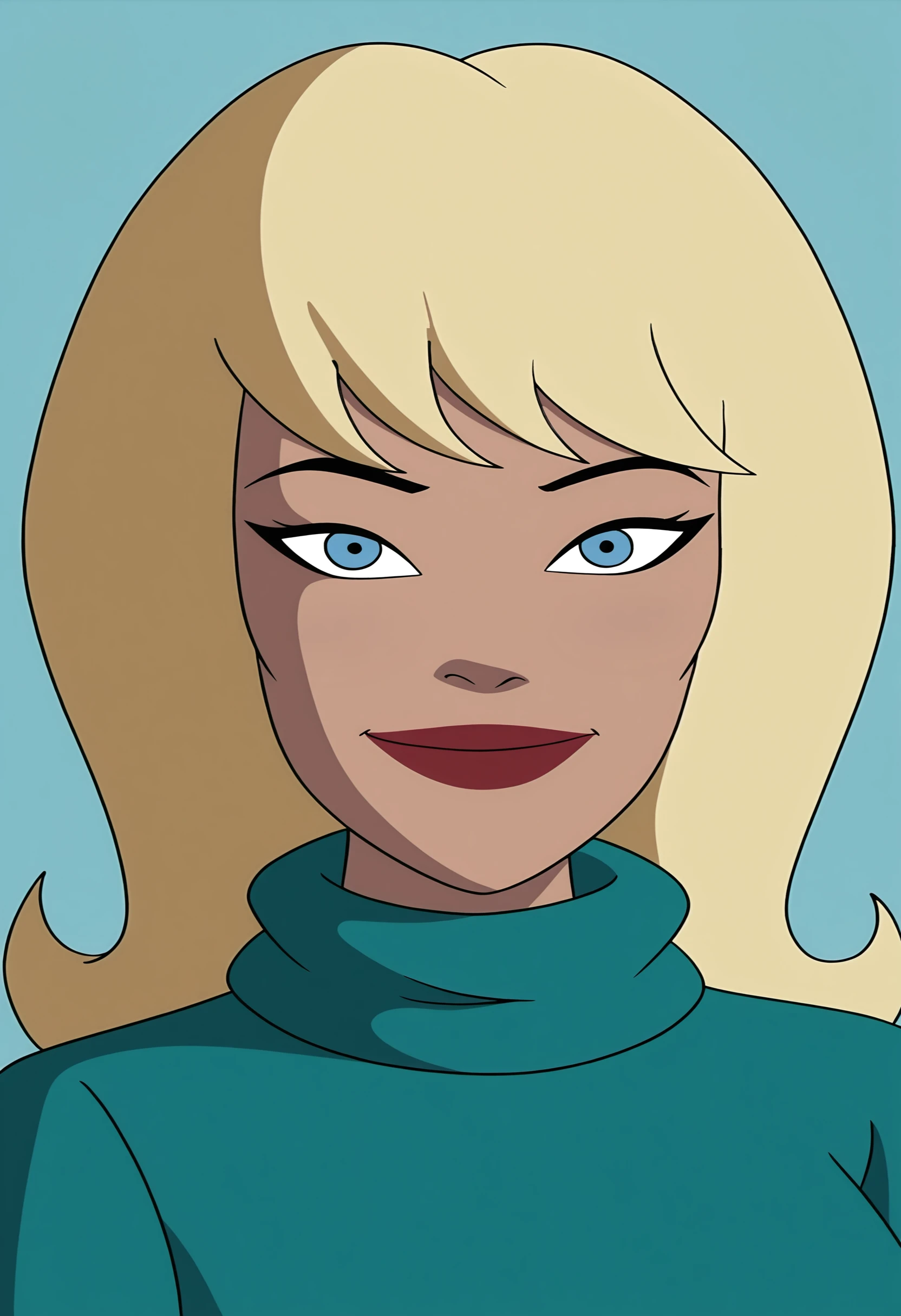 blonde hair, blue eyes, turtleneck, skirt