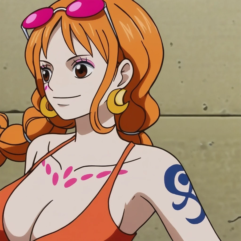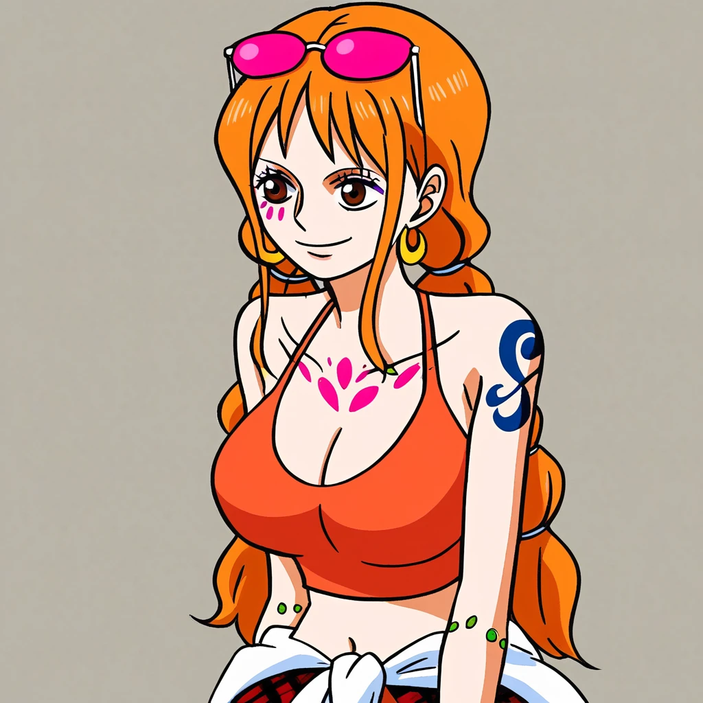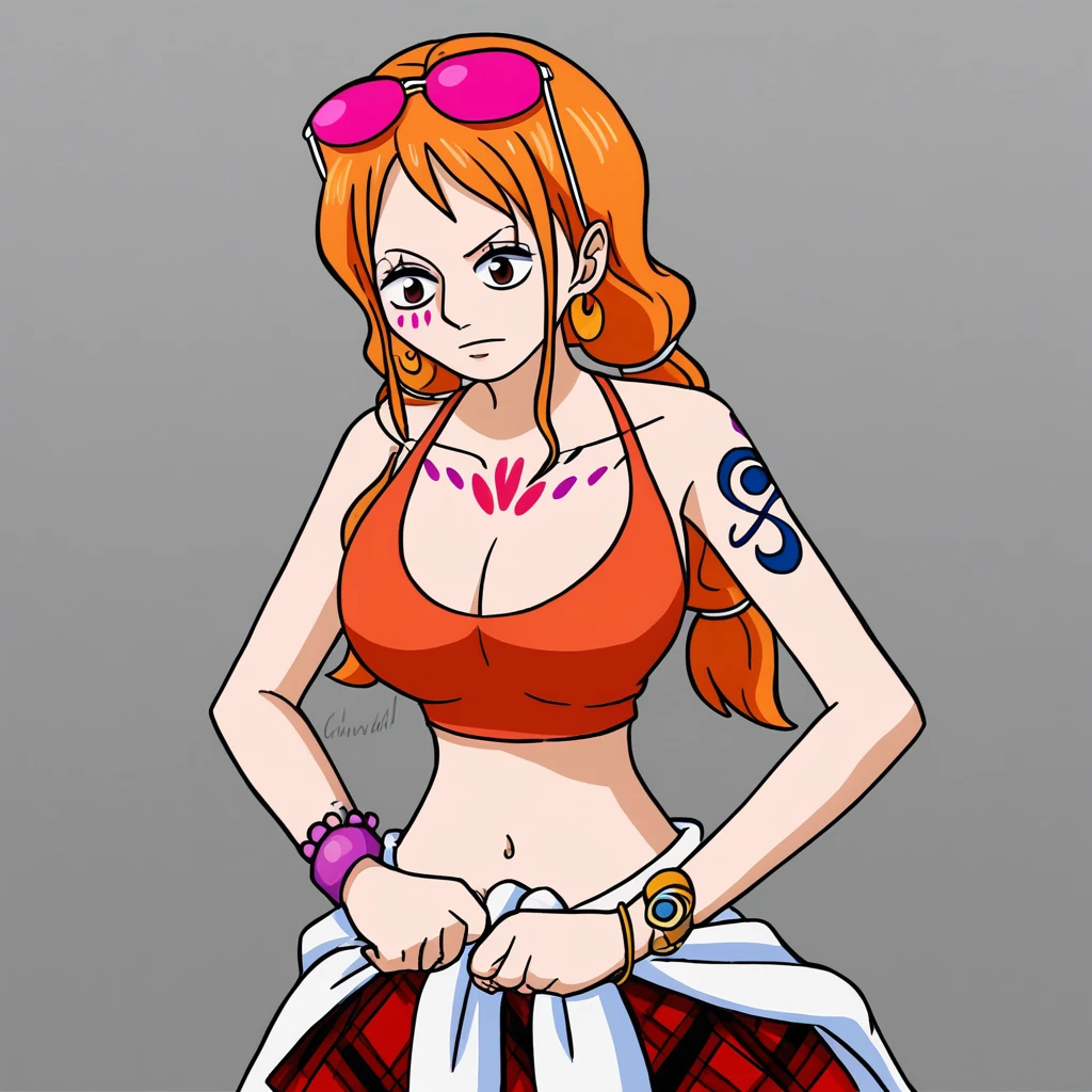 NamiOPRedFO, 1girl, solo, orange hair, long hair, brown eyes, lips, large breast, cleavage, orange crop top, navel, midriff, groin, short plaid skirt, bare shoulders, collarbone, tattoo, orange footwear, high heels, pleated skirt, taut clothes, bracelets, shoulder tattoo, makeup, pink sunglasses, earrings, jewelry, eyewear on head, braids, clothes around waist, twintails,
