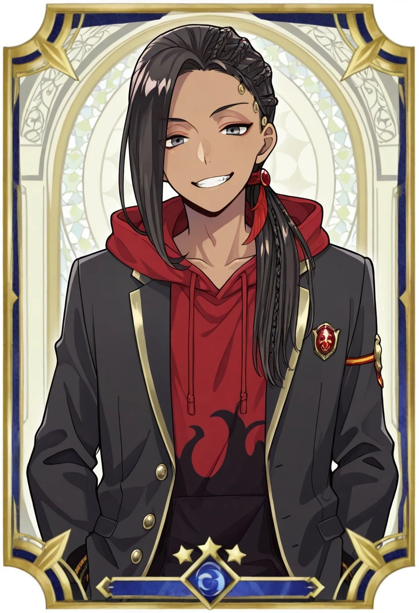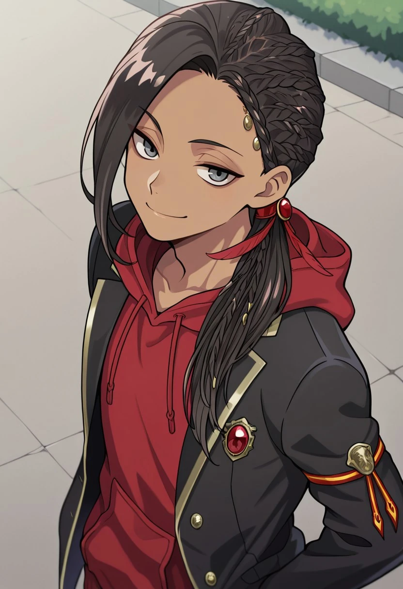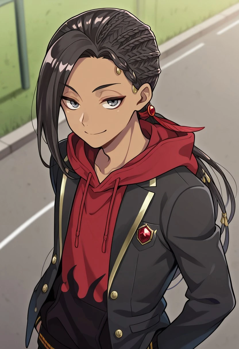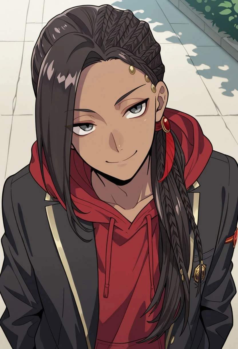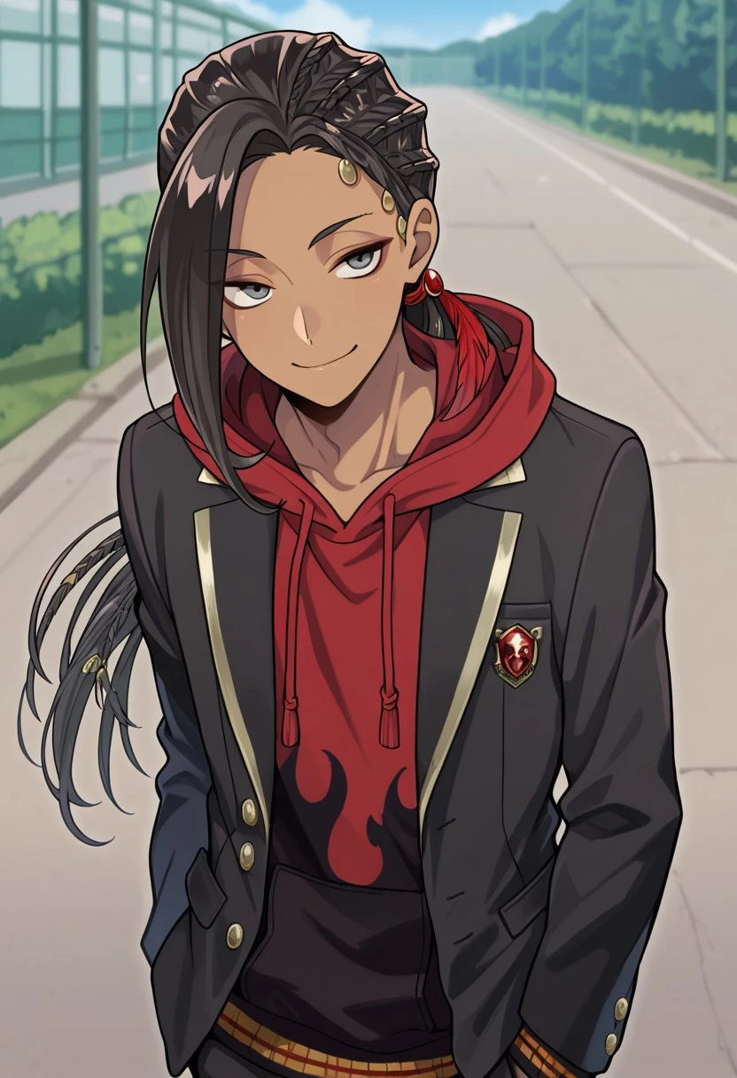 JamiruBaipa, 1boy, male focus, solo, dark skin, dark-skinned male, grey eyes, black hair, long hair, dreadlocks, feather hair ornament, school uniform, red hoodie, hood, black jacket, brooch, open jacket, black pants, sneakers,