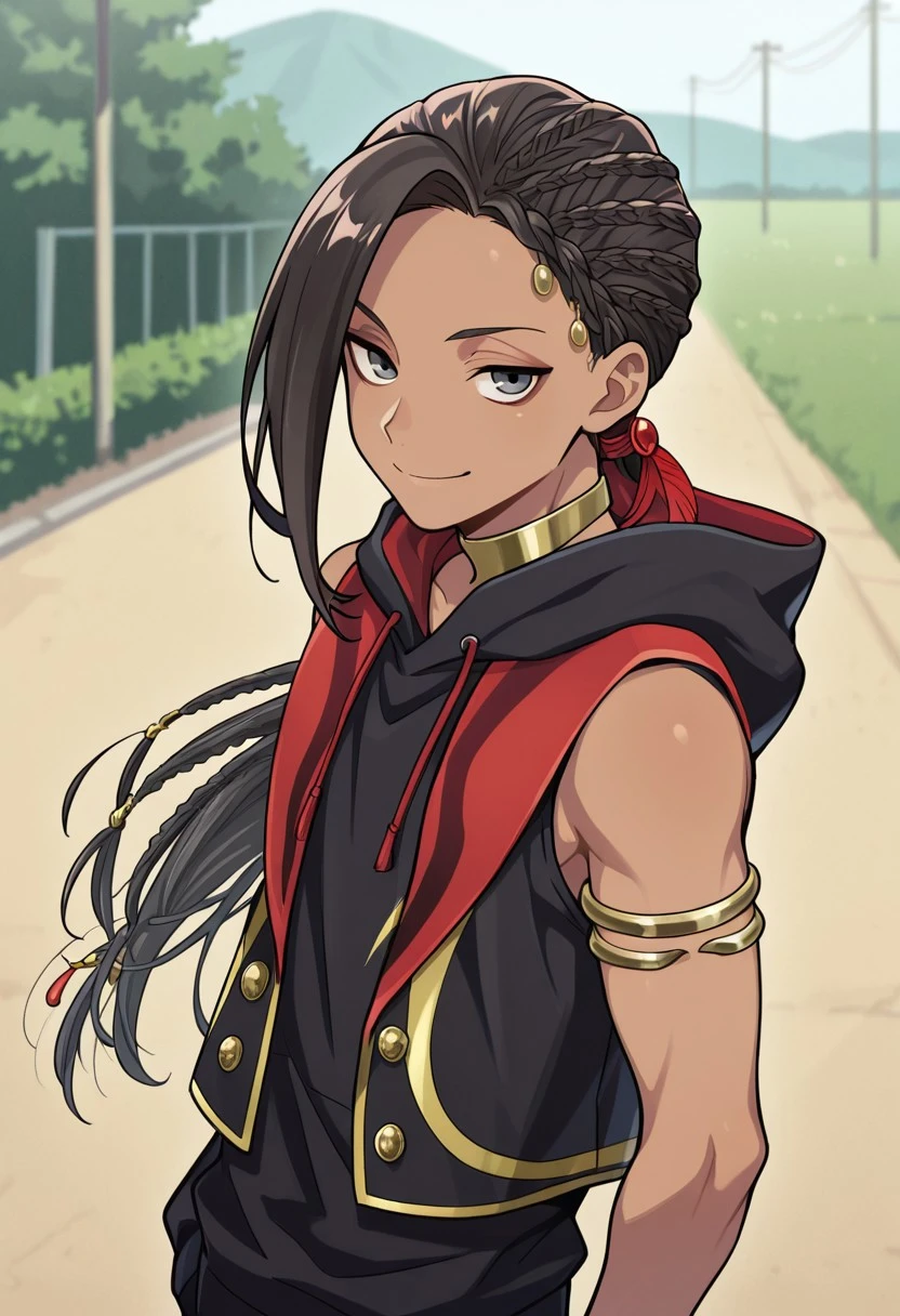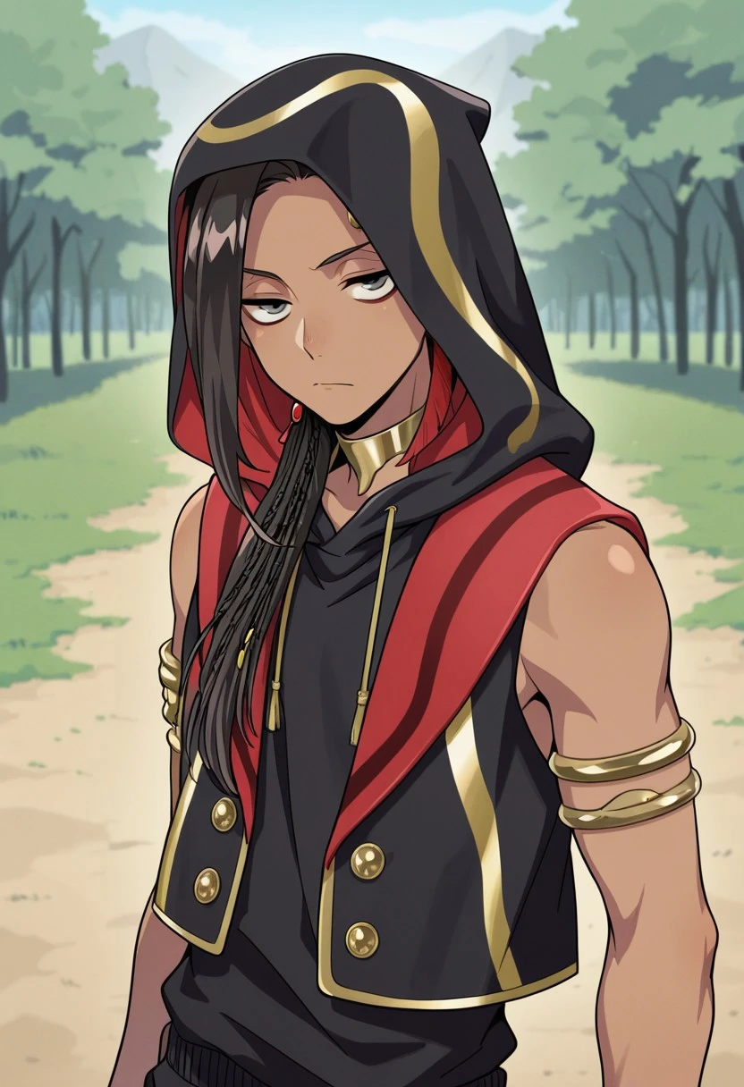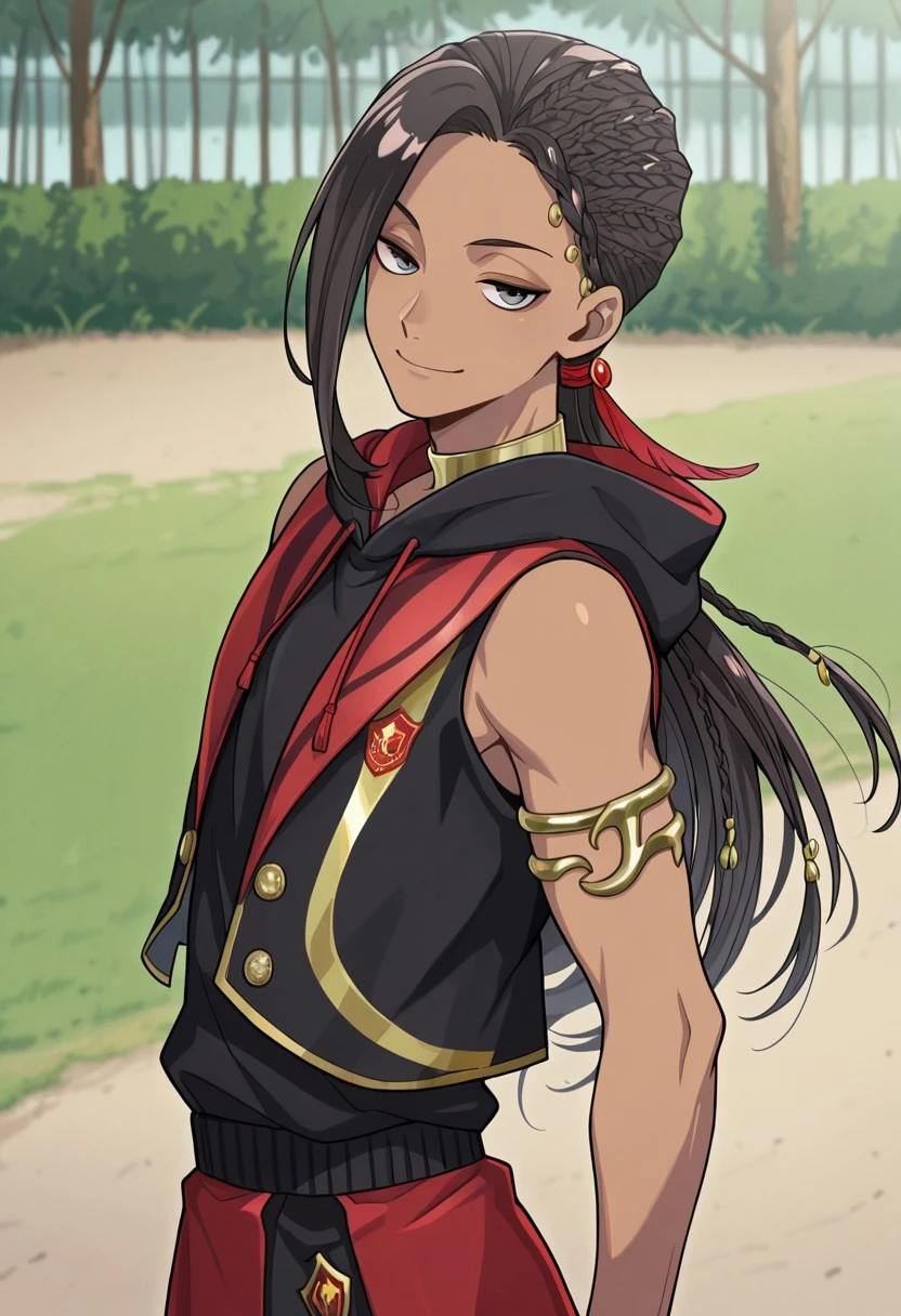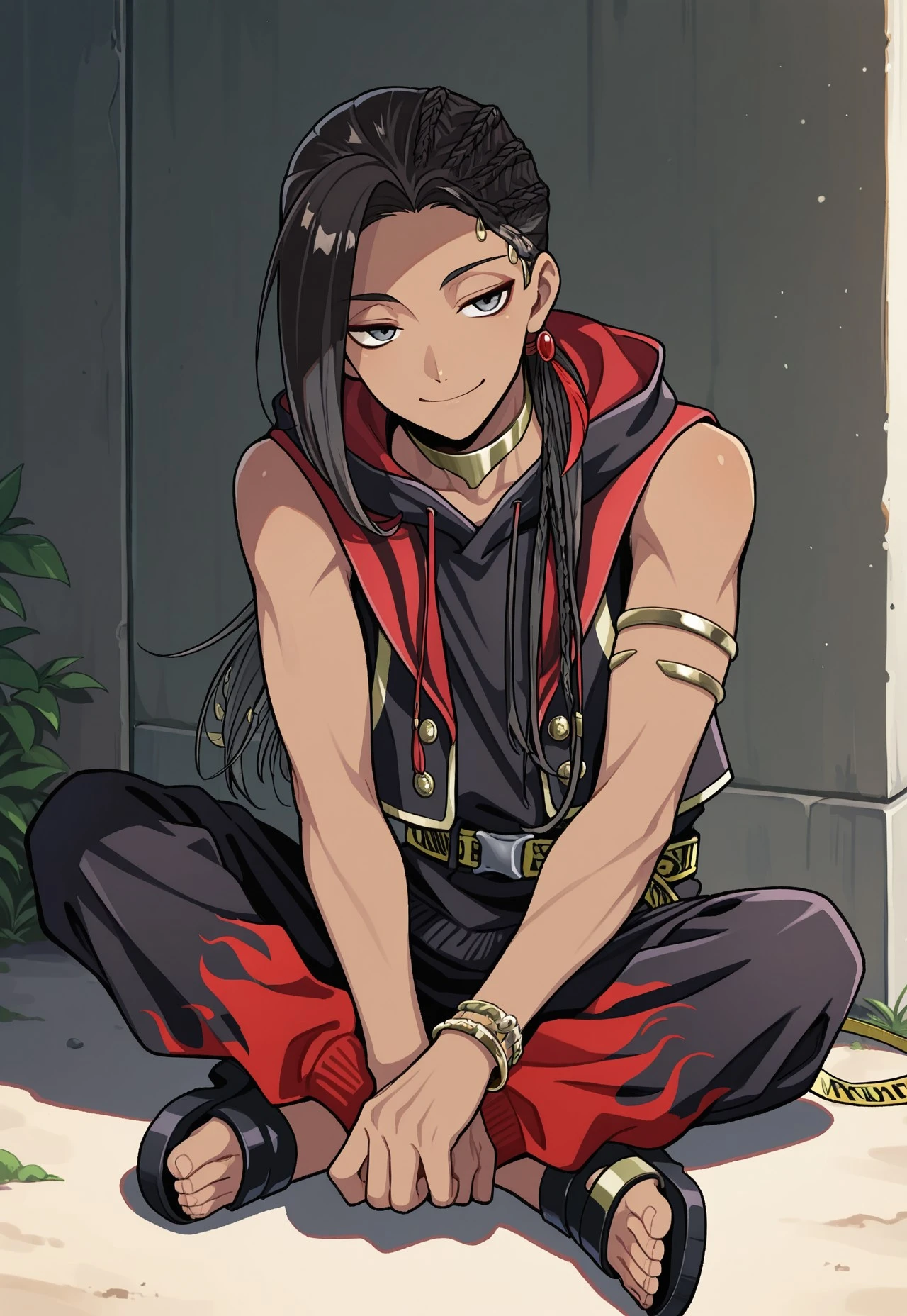 JamiruBaipa, 1boy, male focus, solo, dark skin, dark-skinned male, grey eyes, black hair, long hair, dreadlocks, feather hair ornament, dorm uniform, black shirt, black jacket, hood, sleeveless, armlet, bracelet, yellow belt, black and red pants, flame print, sandals,