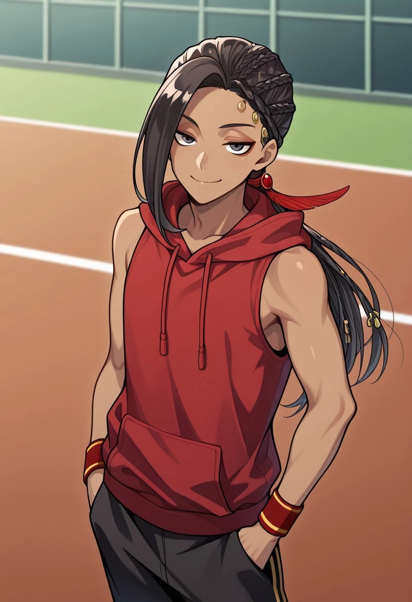 JamiruBaipa, 1boy, male focus, solo, dark skin, dark-skinned male, grey eyes, black hair, long hair, dreadlocks, feather hair ornament, gym uniform, red hoodie, sleeveless hoodie, black pants, sweatpants, wristband, pants rolled up, sneakers,