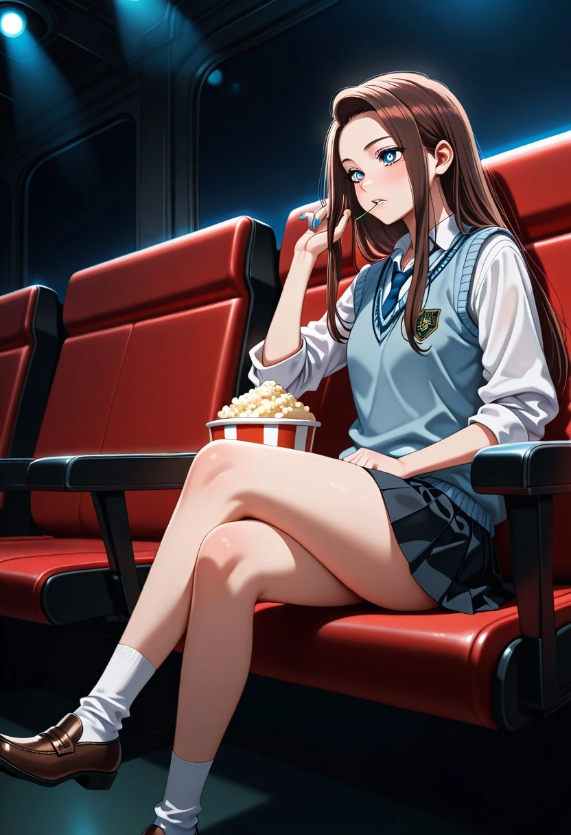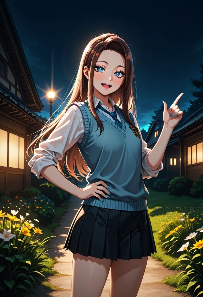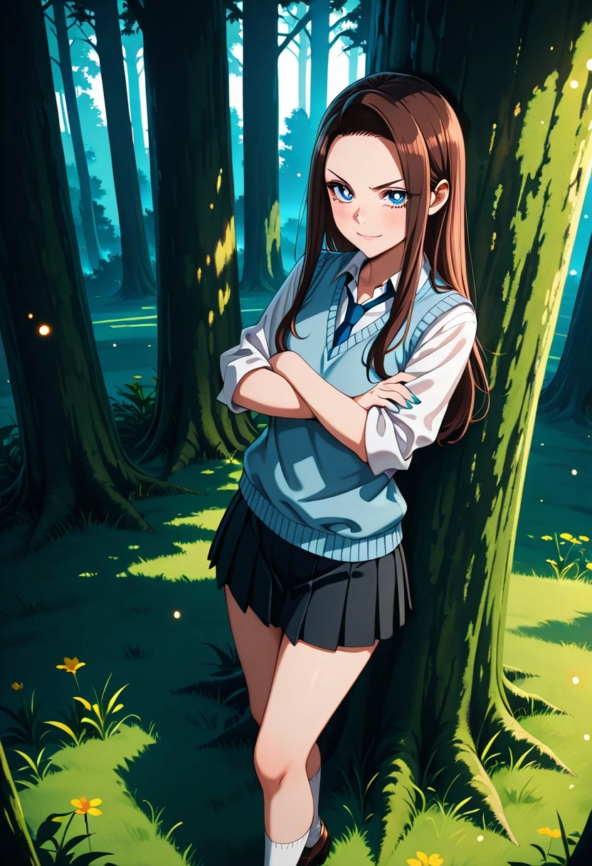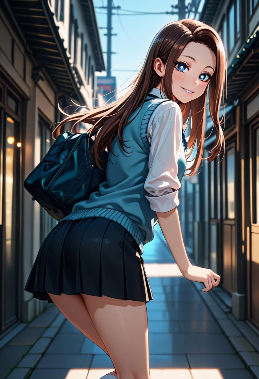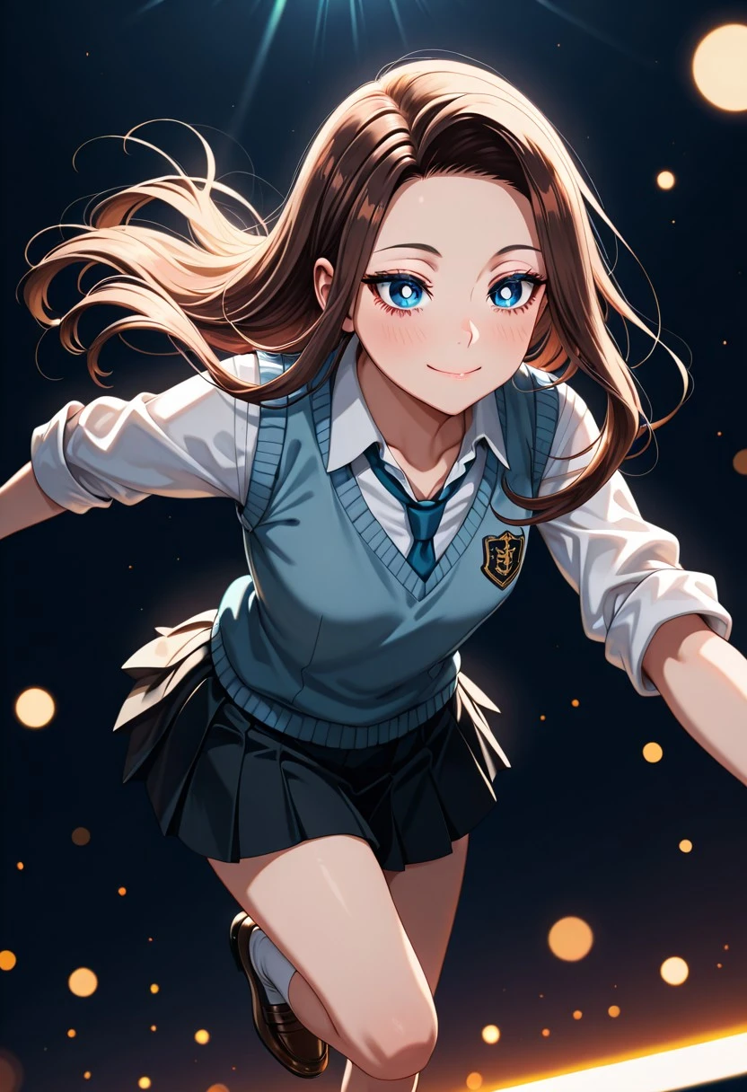 Character's basic outfit: school uniform, blue sweater vest, white shirt, collared shirt, blue necktie, rolled-up sleeves, black skirt, pleated skirt, miniskirt, white socks, brown shoes