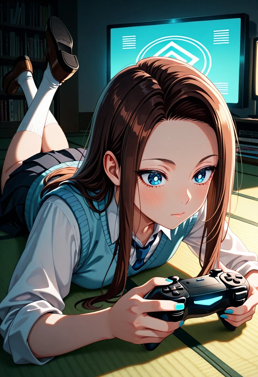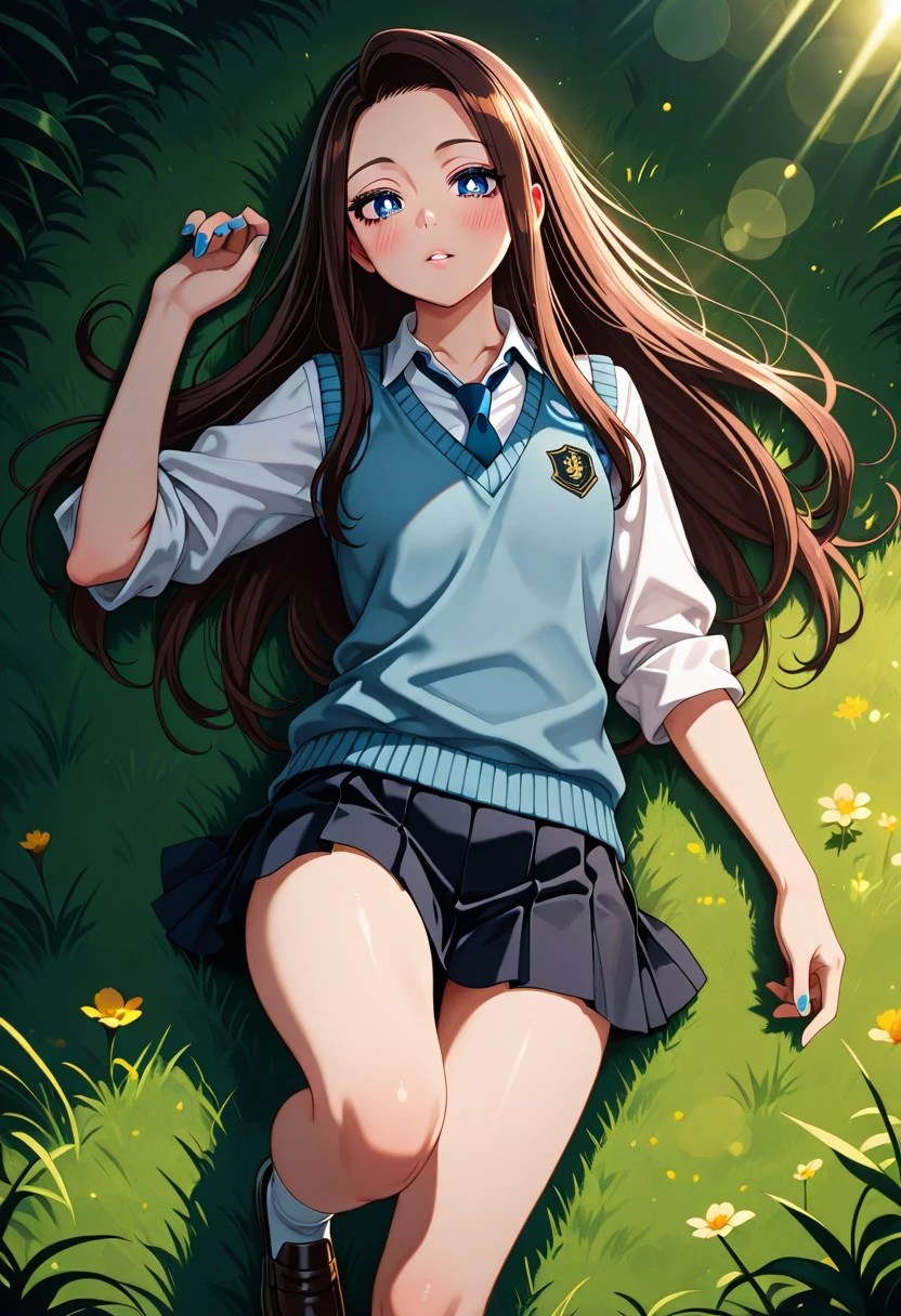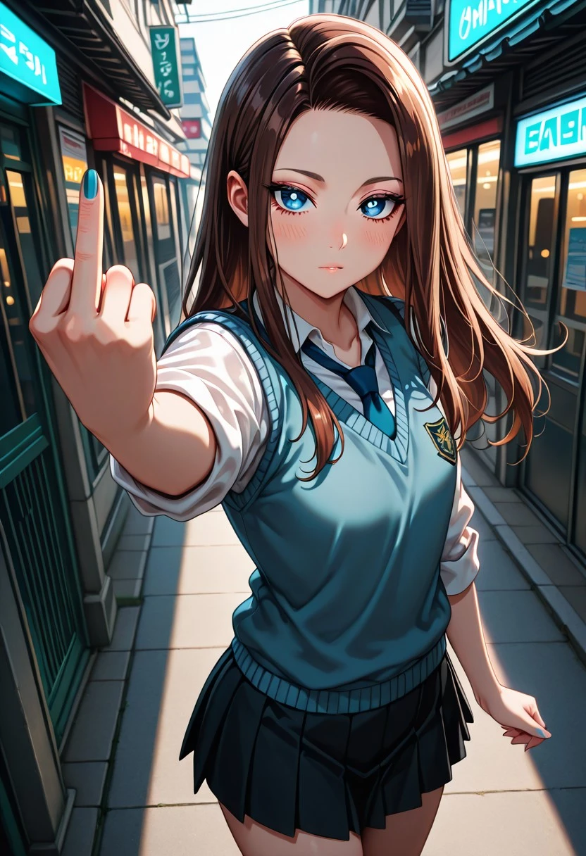 Character appearance: brown hair, long hair, sidelocks, parted bangs, blue eyes, white pupils, nail polish, blue nails, small breasts