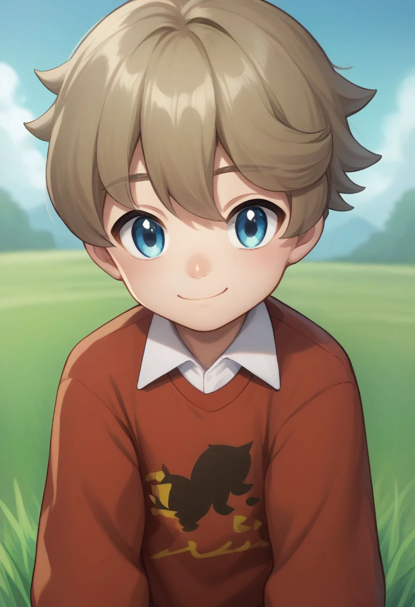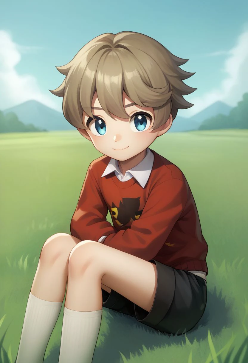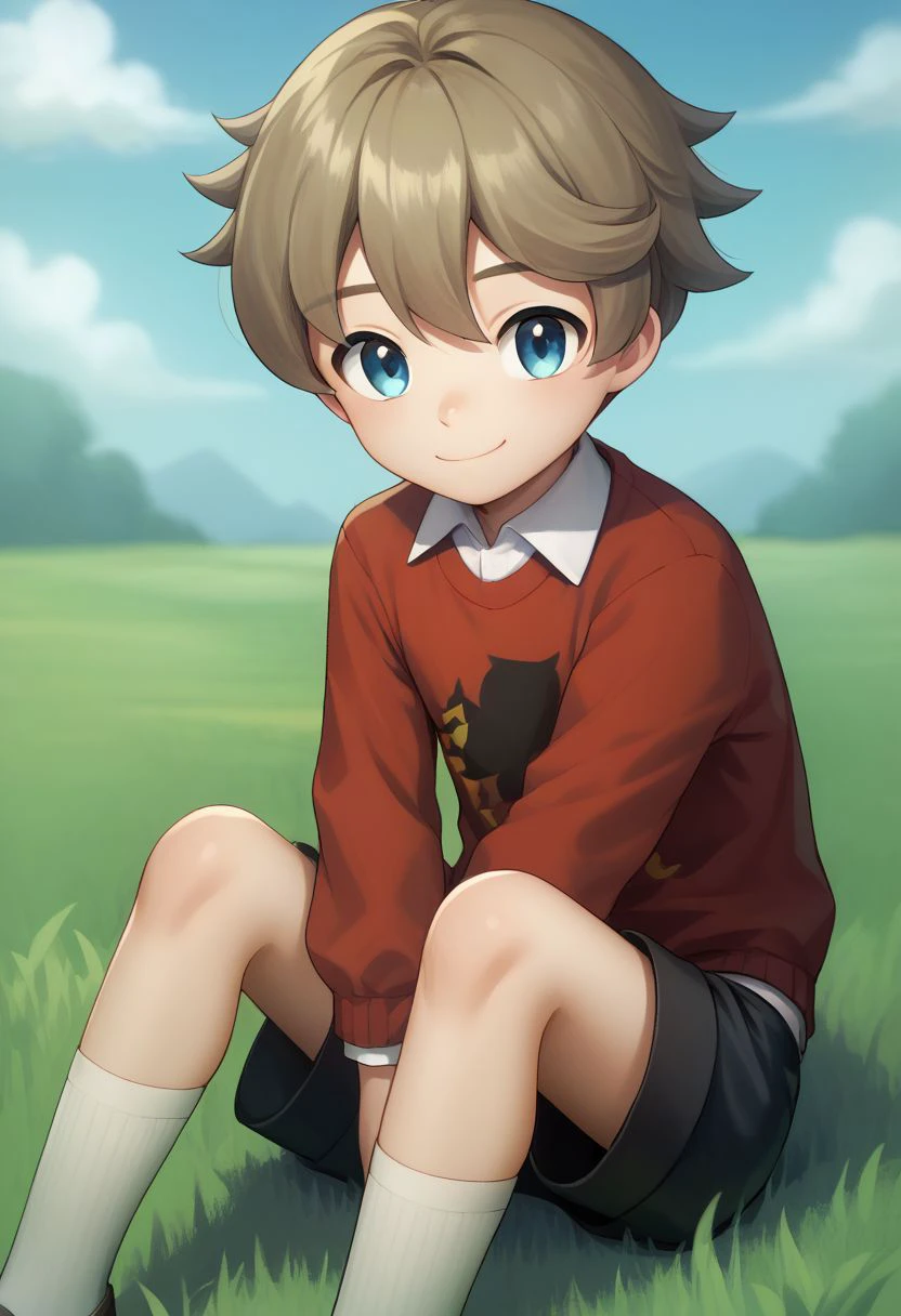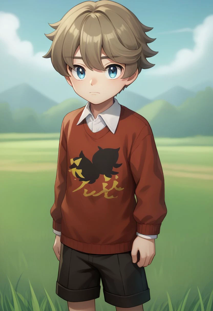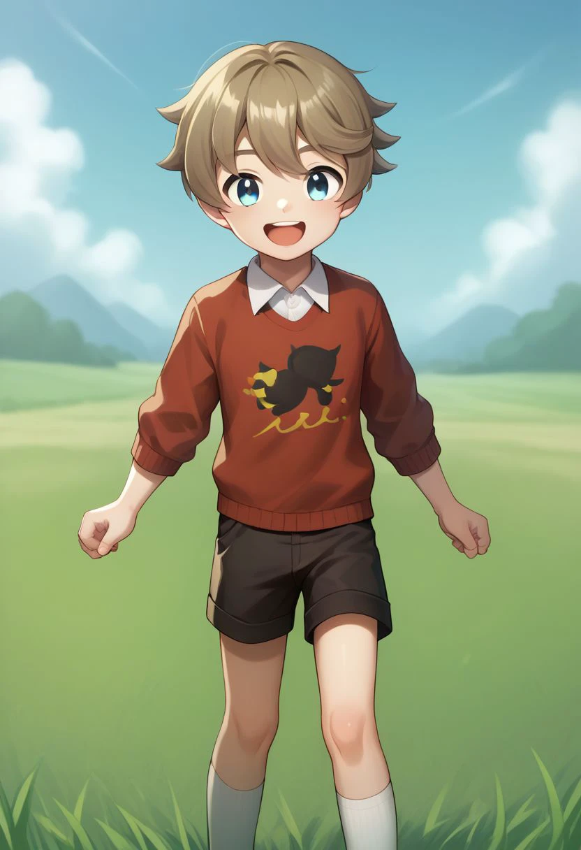 Casual: ster, 1boy, male focus, blue eyes, brown hair, collared shirt, bangs, shorts, socks,