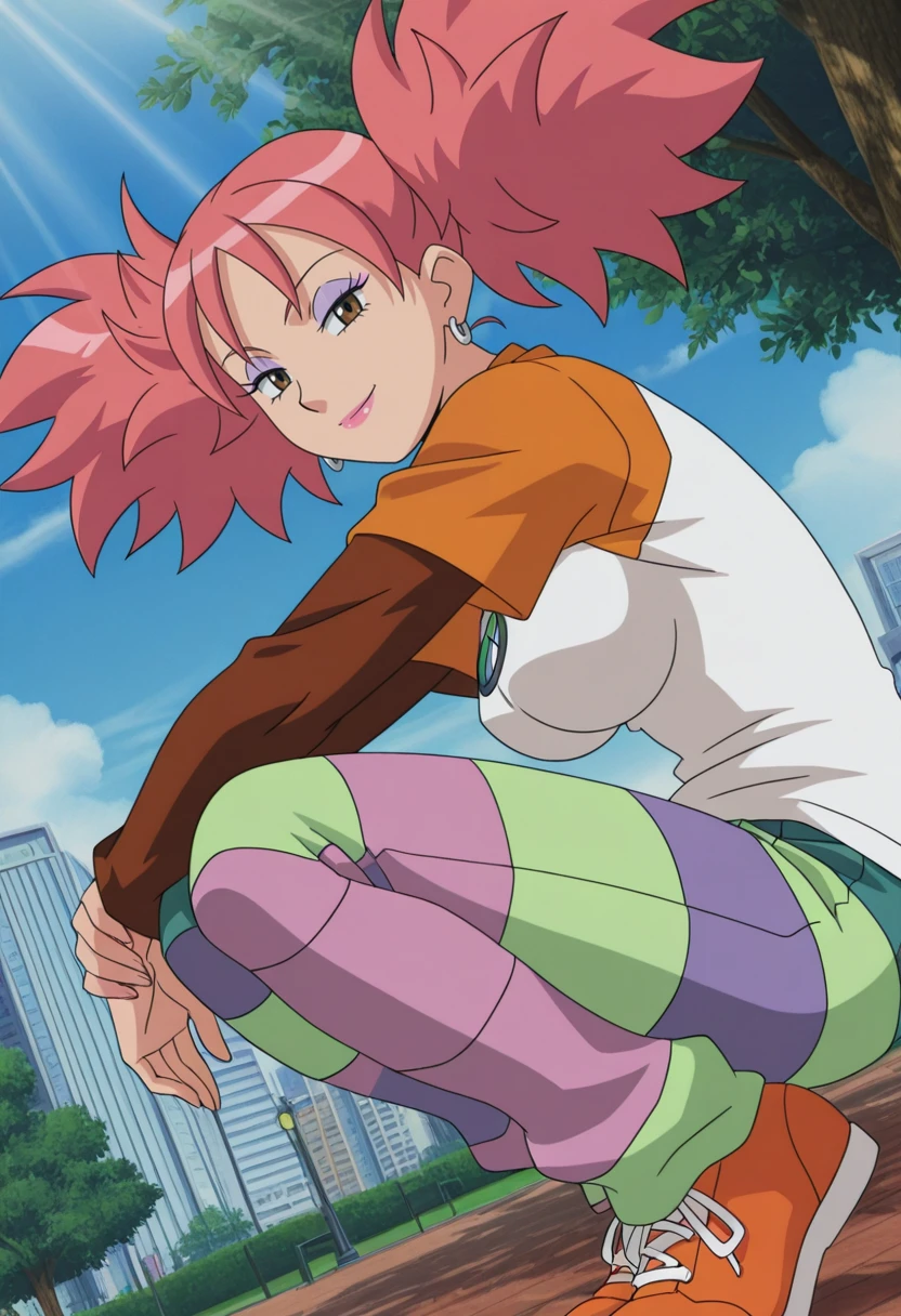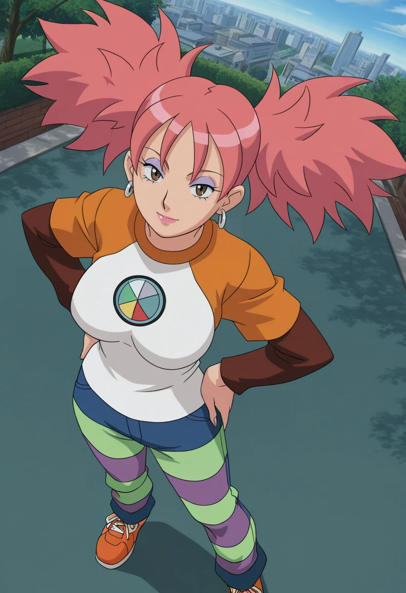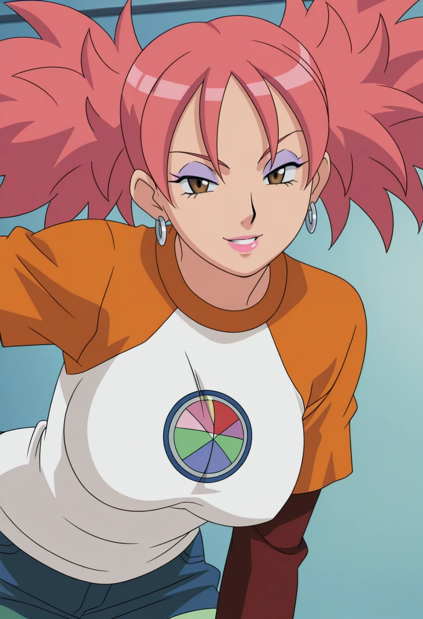 maddymegaman, 1girl, solo, twintails, pink hair, brown eyes, makeup, eyeshadow, lipstick, large breast, curvy, large hips, Casual Outfit: