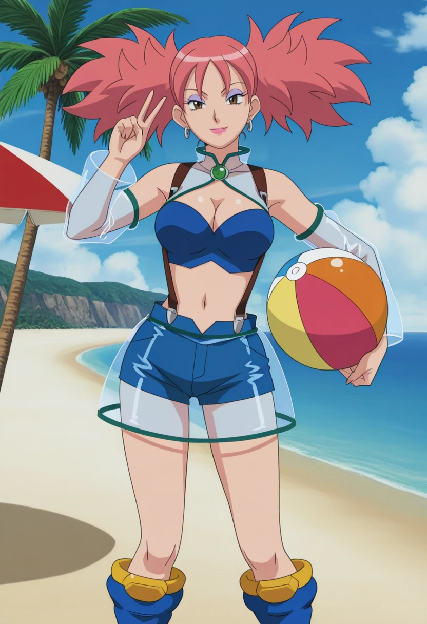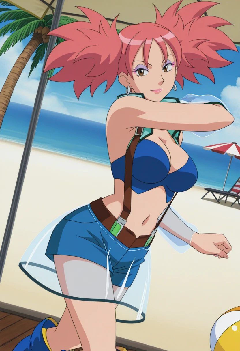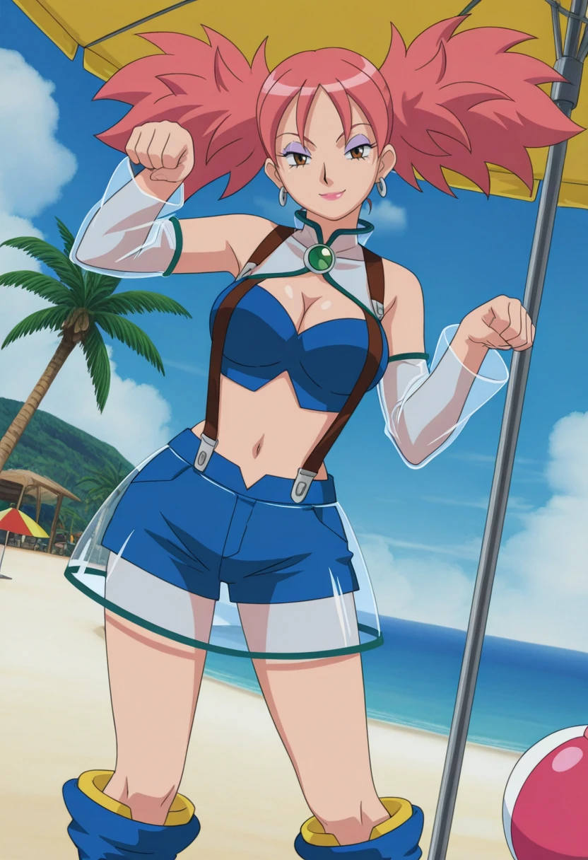 jewelry, earrings, blue crop top, cleavage, brown suspenders, see-through detached sleeves, midriff, navel, see-through skirt, blue shorts, blue knee boots, high heels,Bikini: