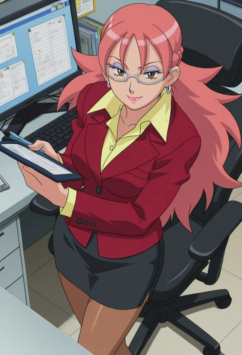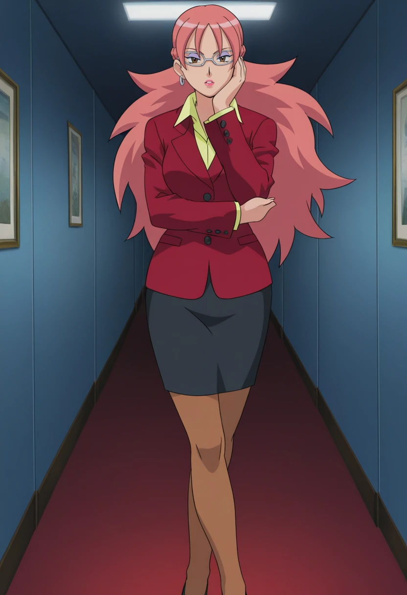 long hair, braid, ponytail, silver glasses, jewelry, earrings, red jacket, formal, black pencil skirt, pantyhose, black shoes, high heels,Optional: