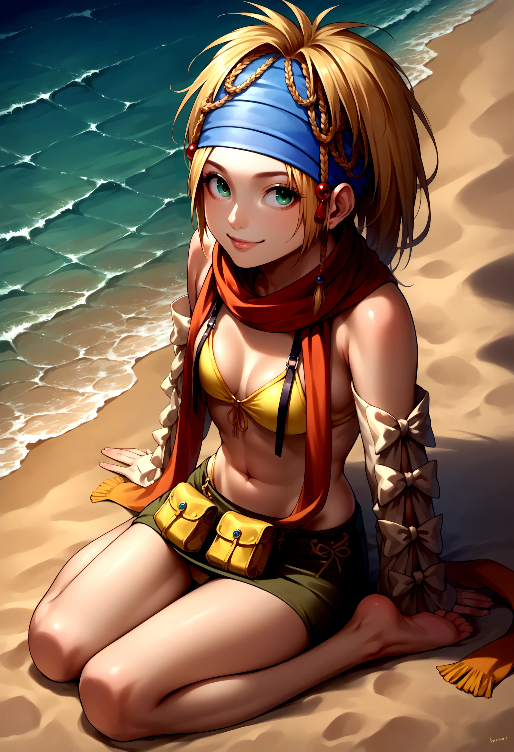 RikkuX2, blue headband, yellow bikini, scarf, skirt, navel, detached sleeves, bikini top onlyOther Outfits: