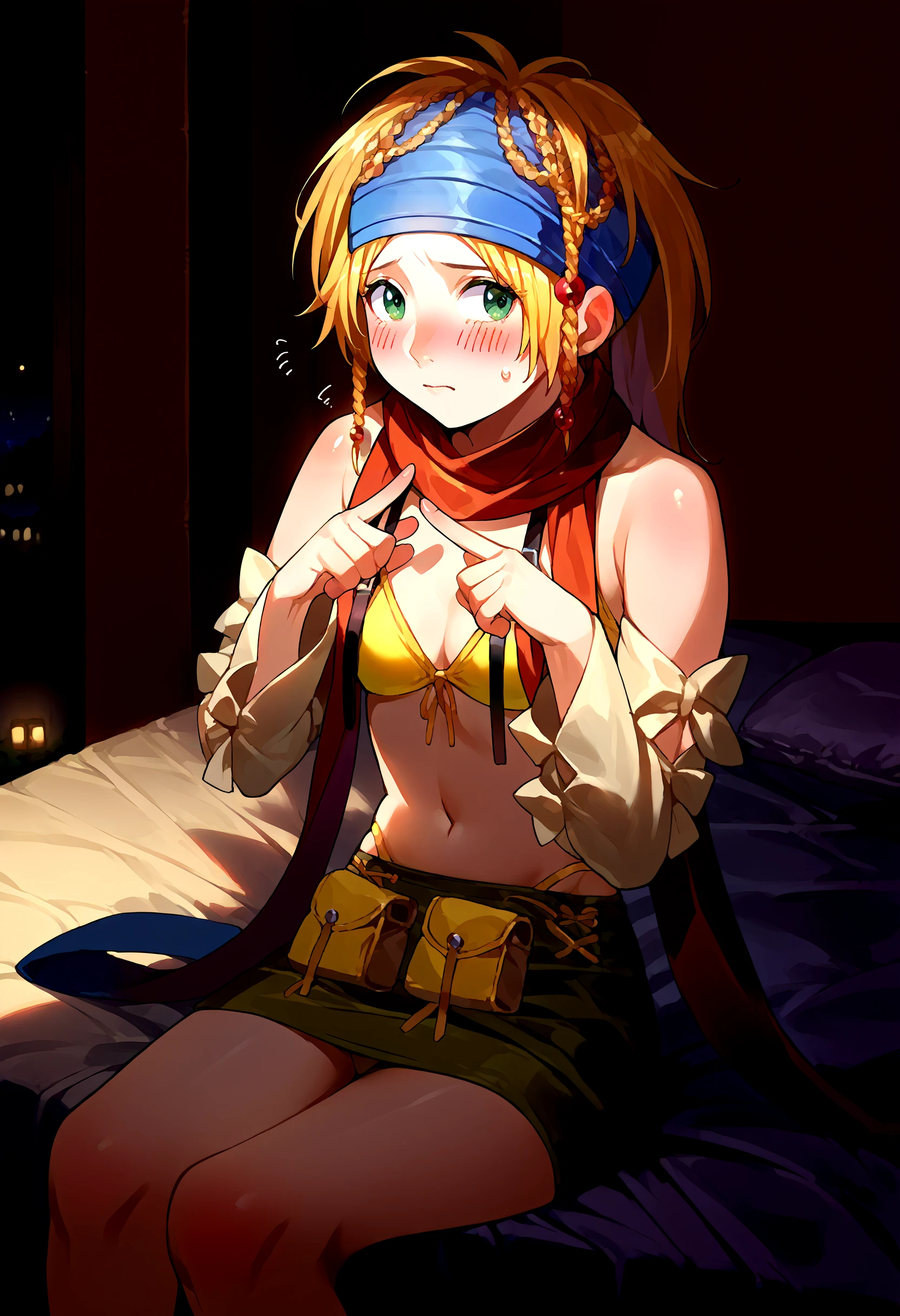 RikkuX2, blue headband, yellow bikini, scarf, skirt, navel, detached sleeves, bikini top only