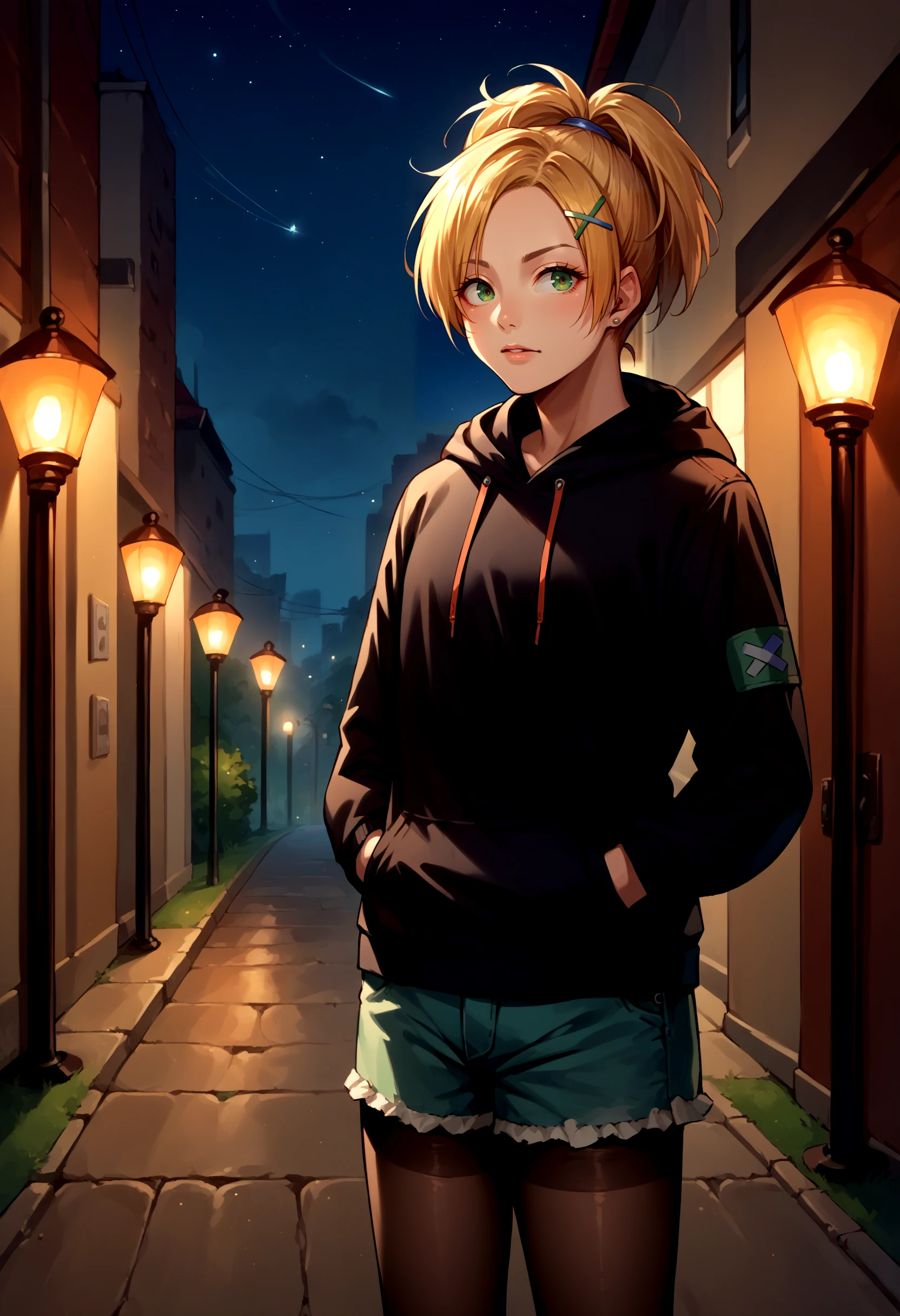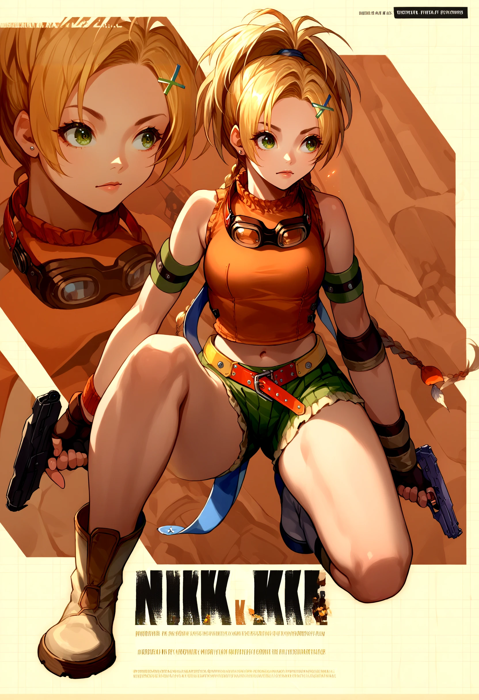 RikkuX, x hair ornament, goggles around neck, fingerless gloves, midriff, navel, belt, boots