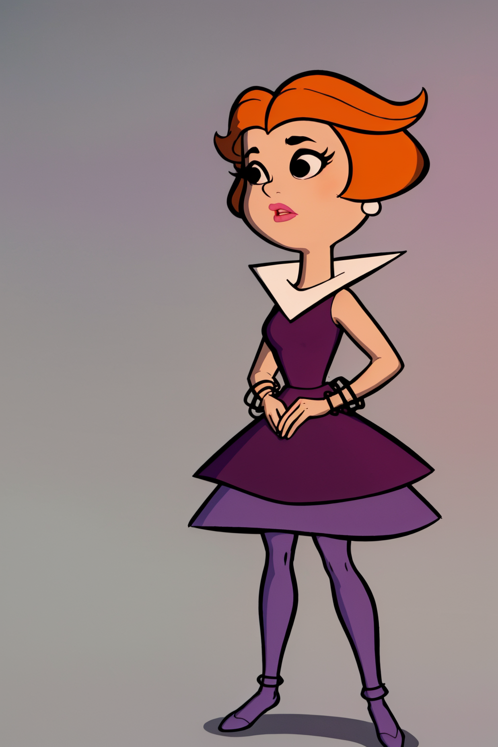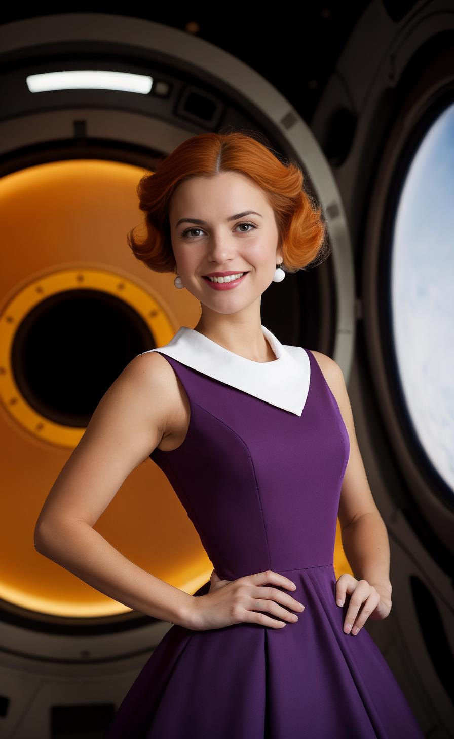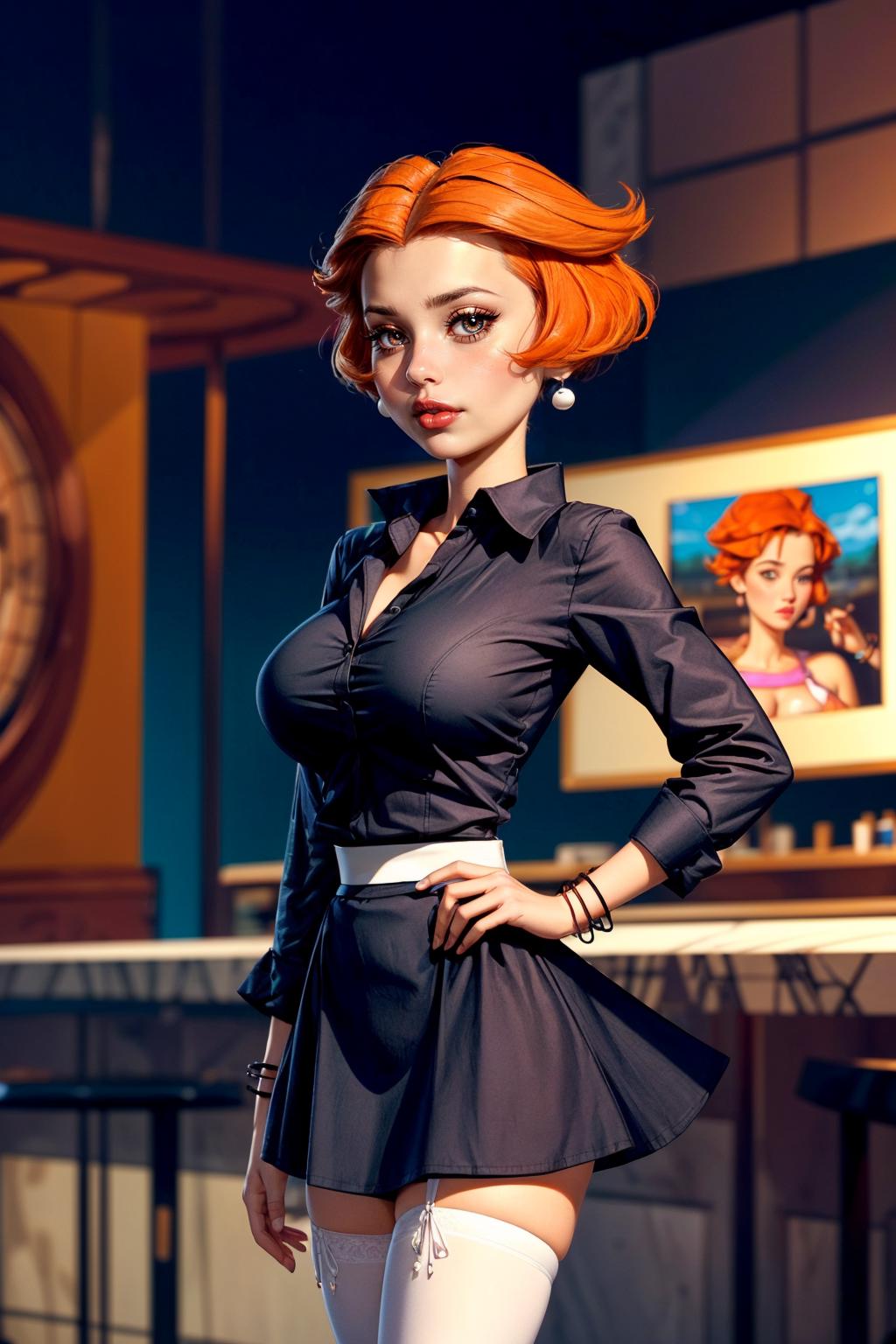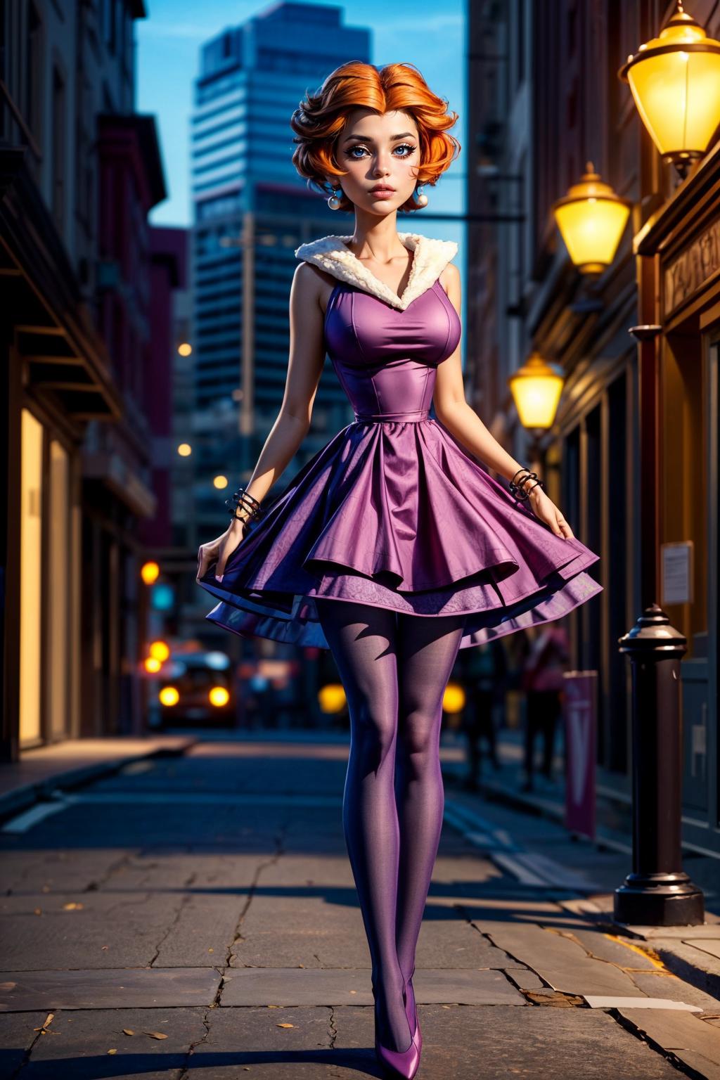 Other prompts : 1girl, orange hair, short hair, black eyes, earrings, lipstick, purple dress, pantyhose, bracelet