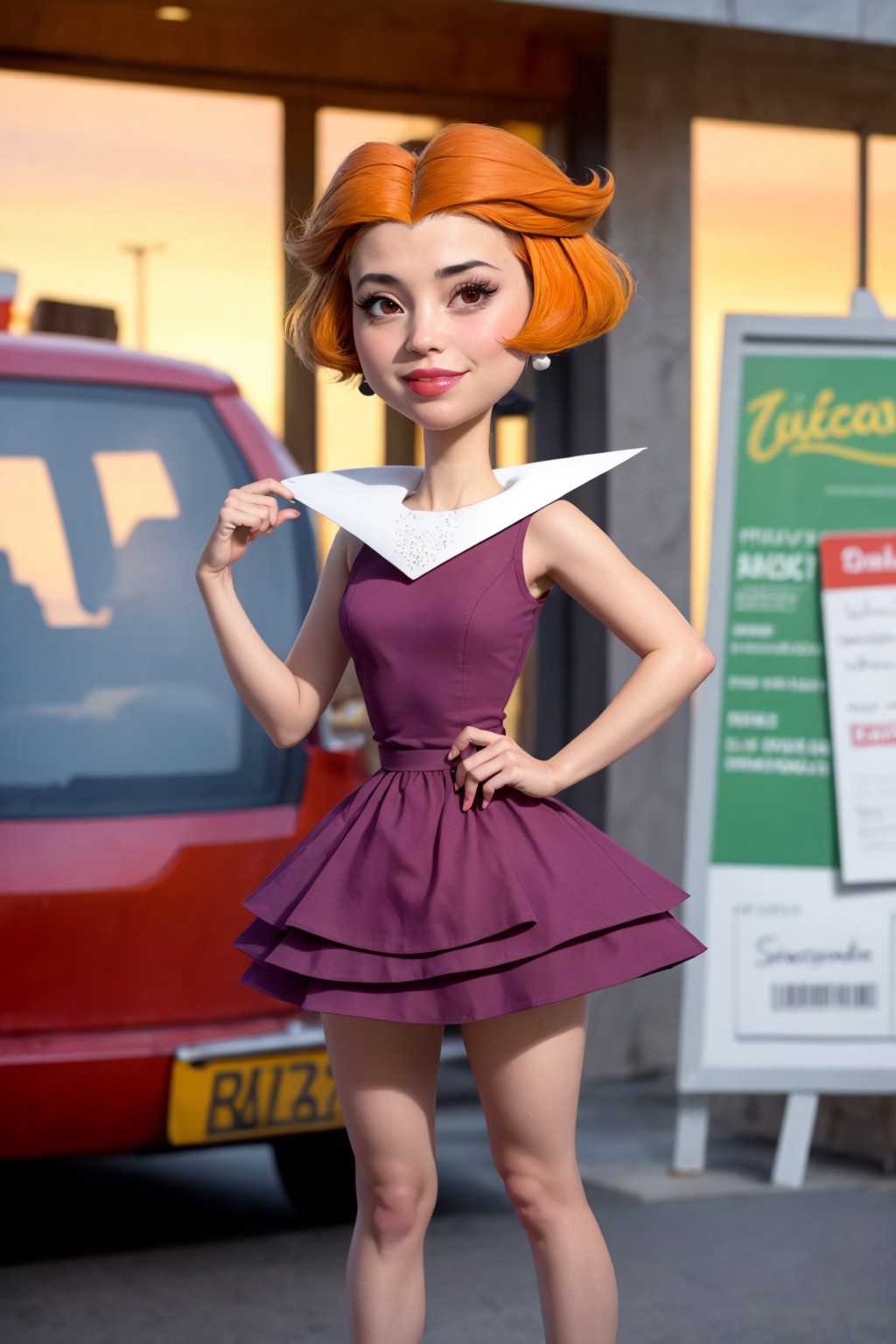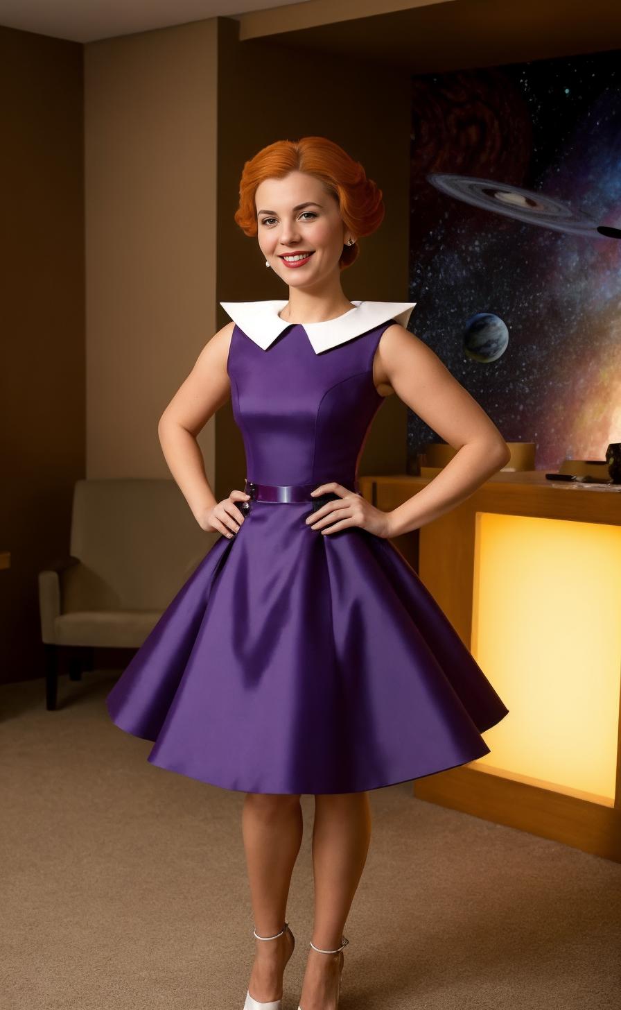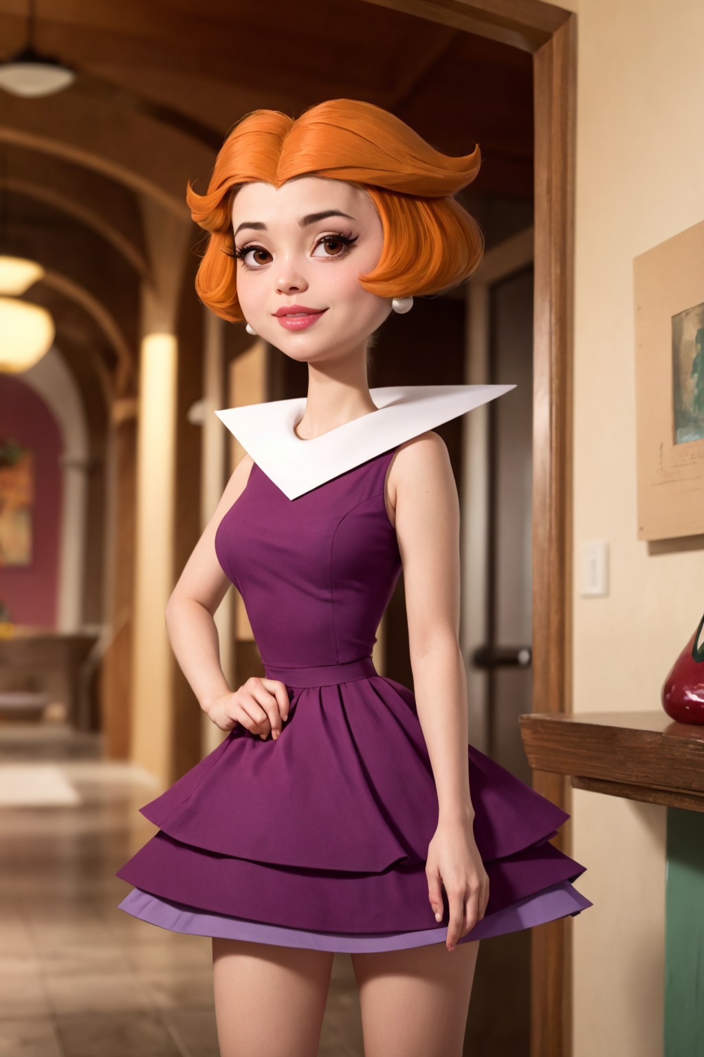 Other prompts : 1girl, orange hair, short hair, black eyes, earrings, lipstick, purple dress, pantyhose, bracelet