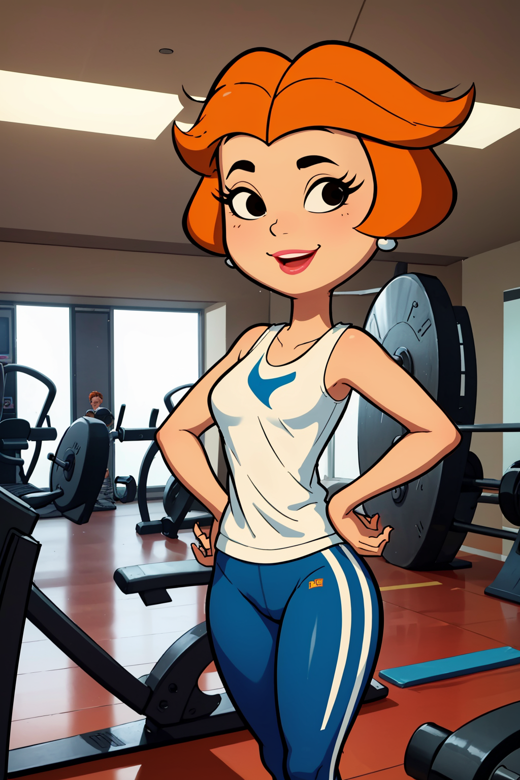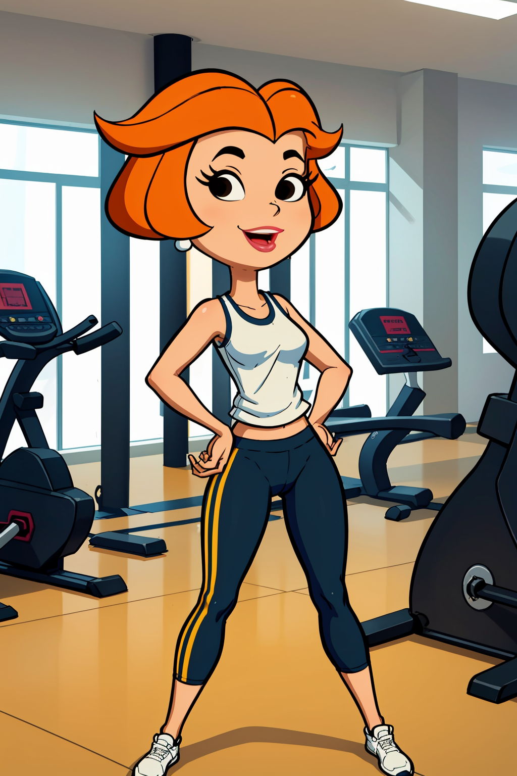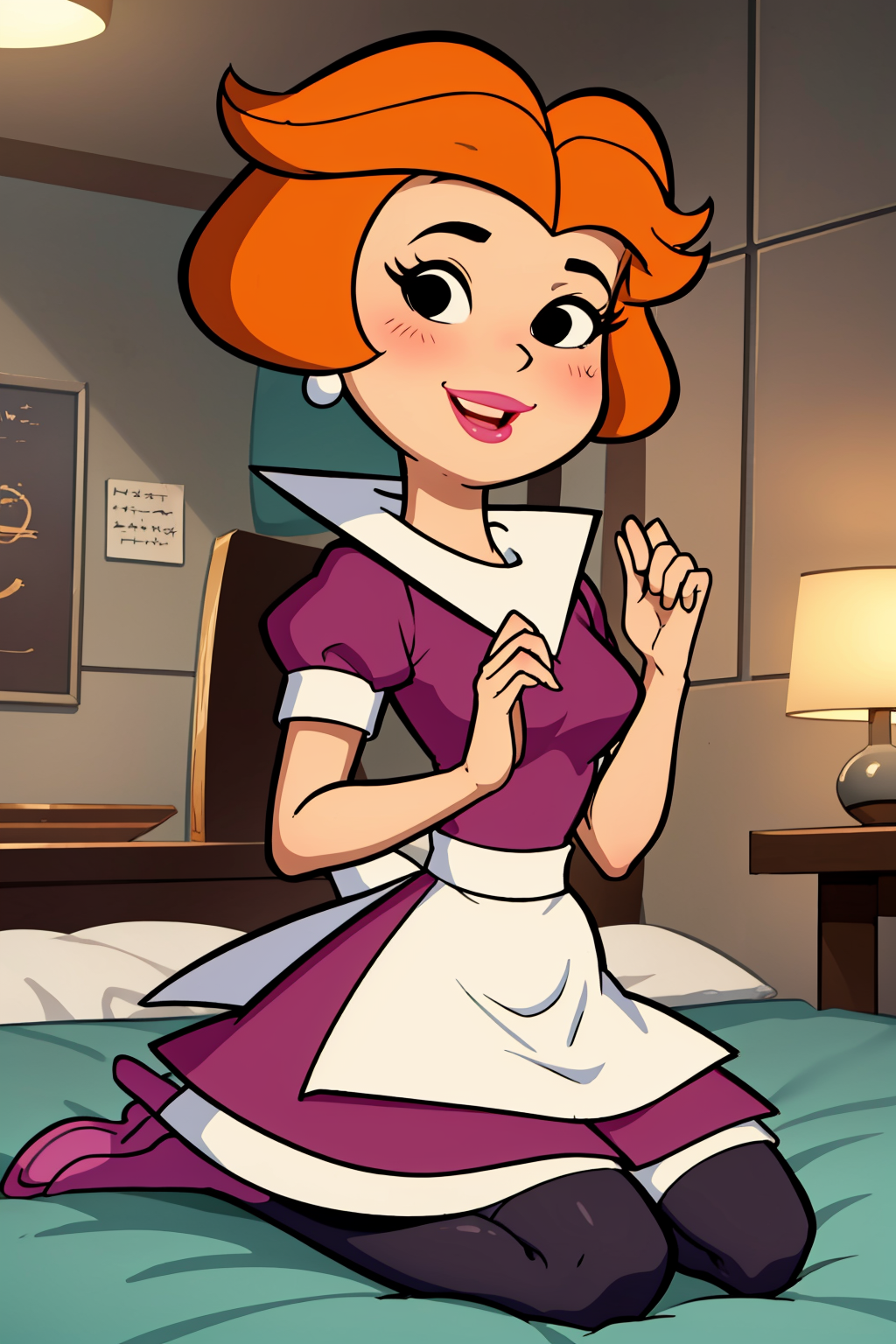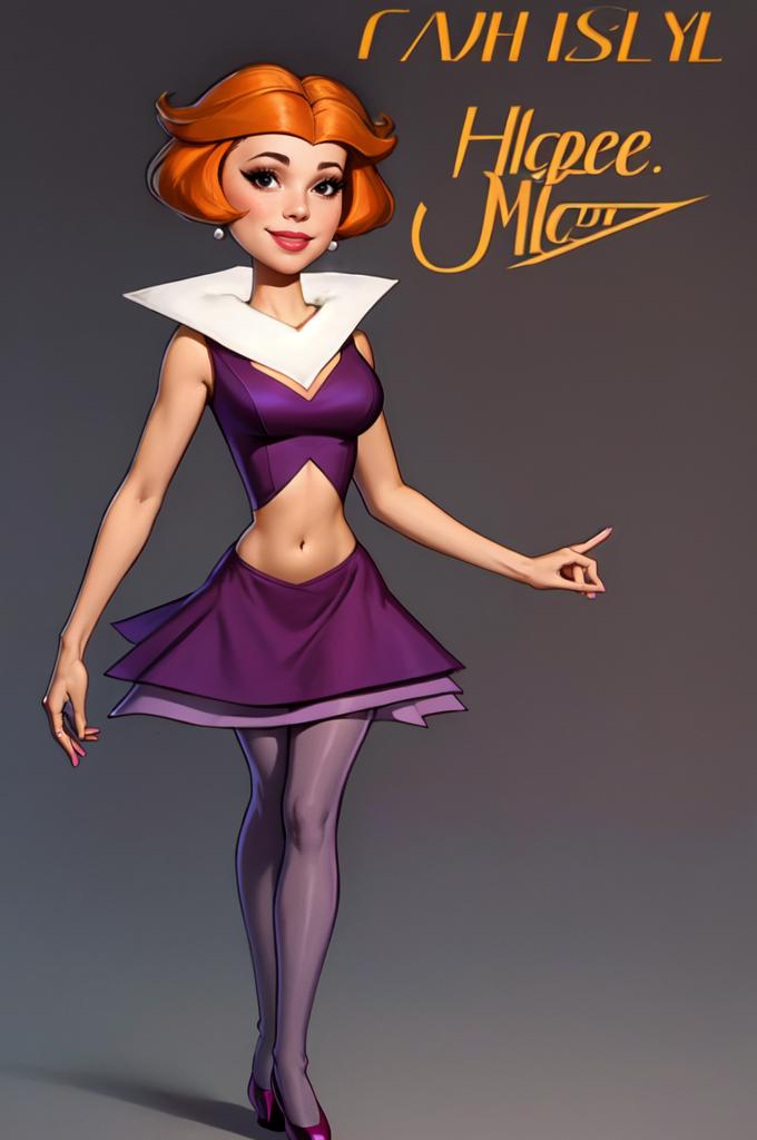 Other prompts : 1girl, orange hair, short hair, black eyes, earrings, lipstick, purple dress, pantyhose, bracelet