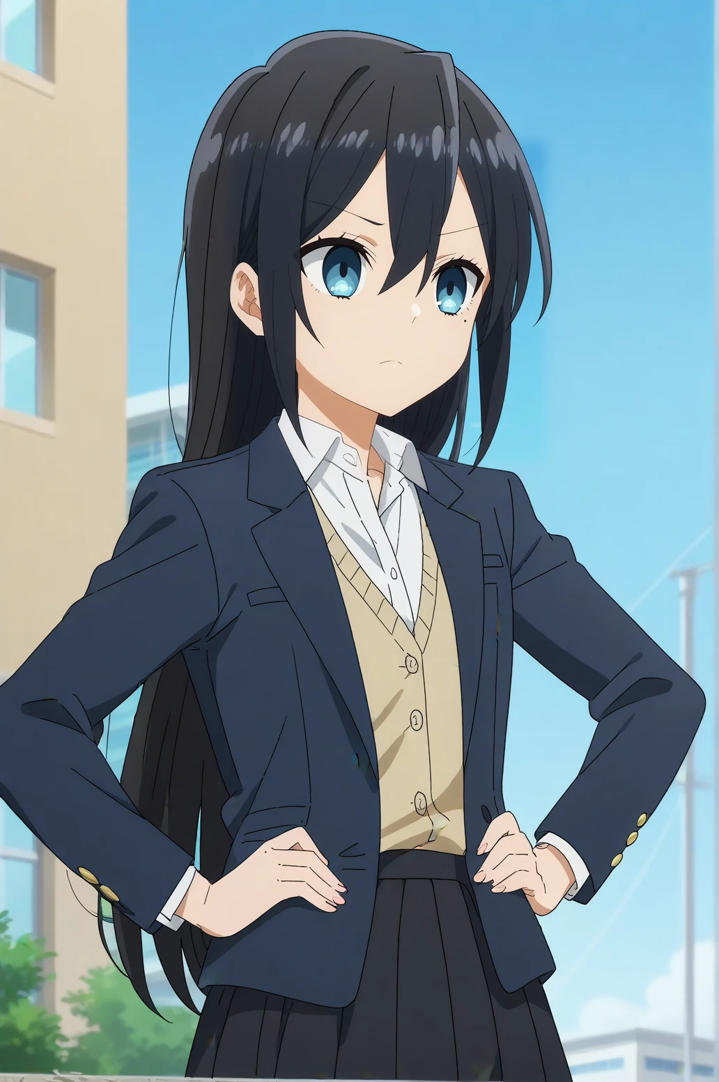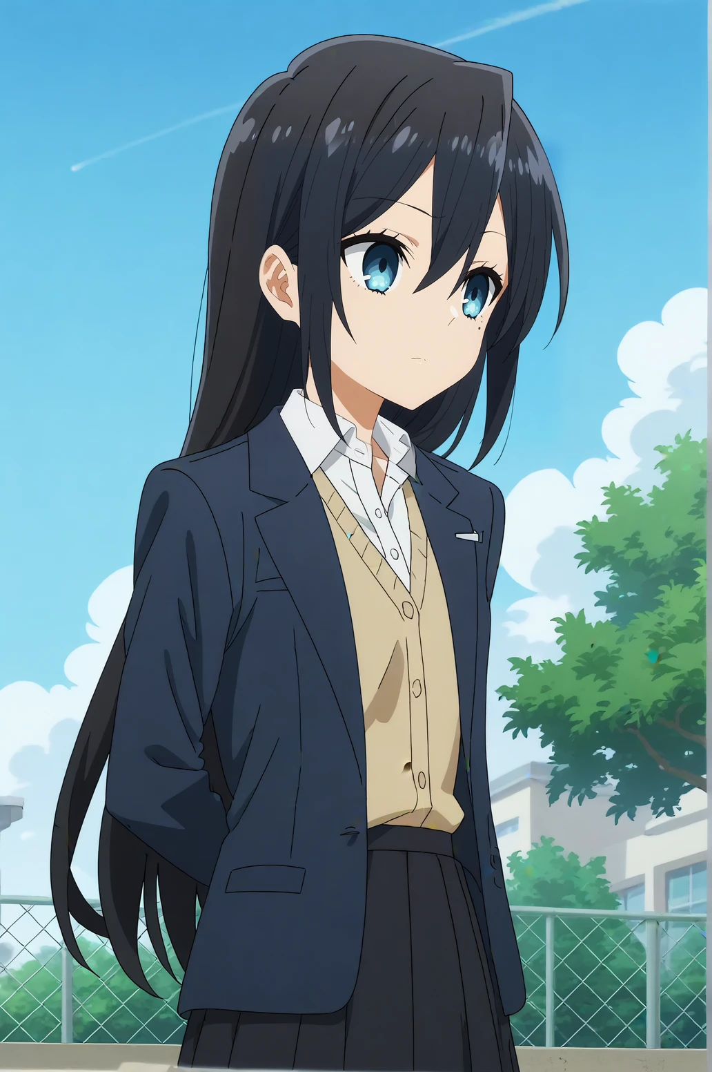 Triggers : honoka sawada,mole, mole under eye,bangs, long hair,hair between eyes,blue eyes,jacket,blazer,collared shirt,skirt,school uniform